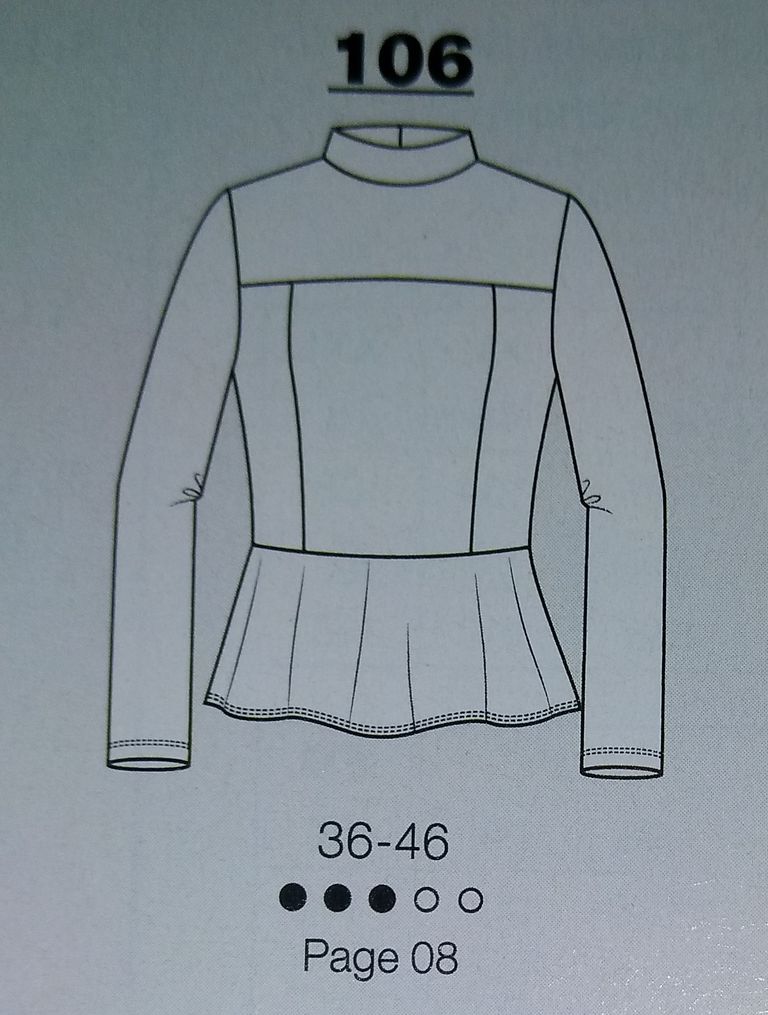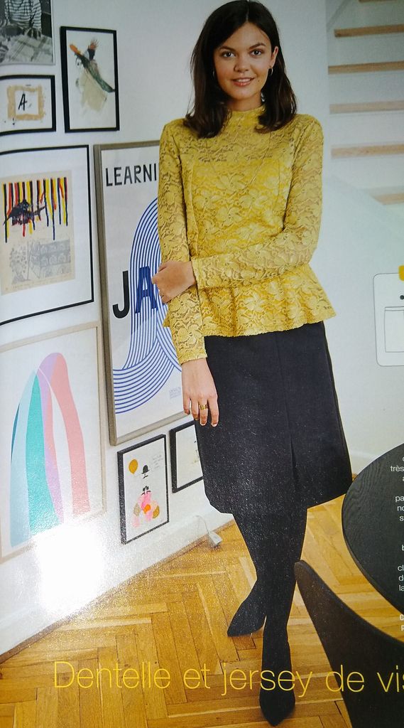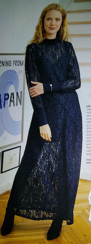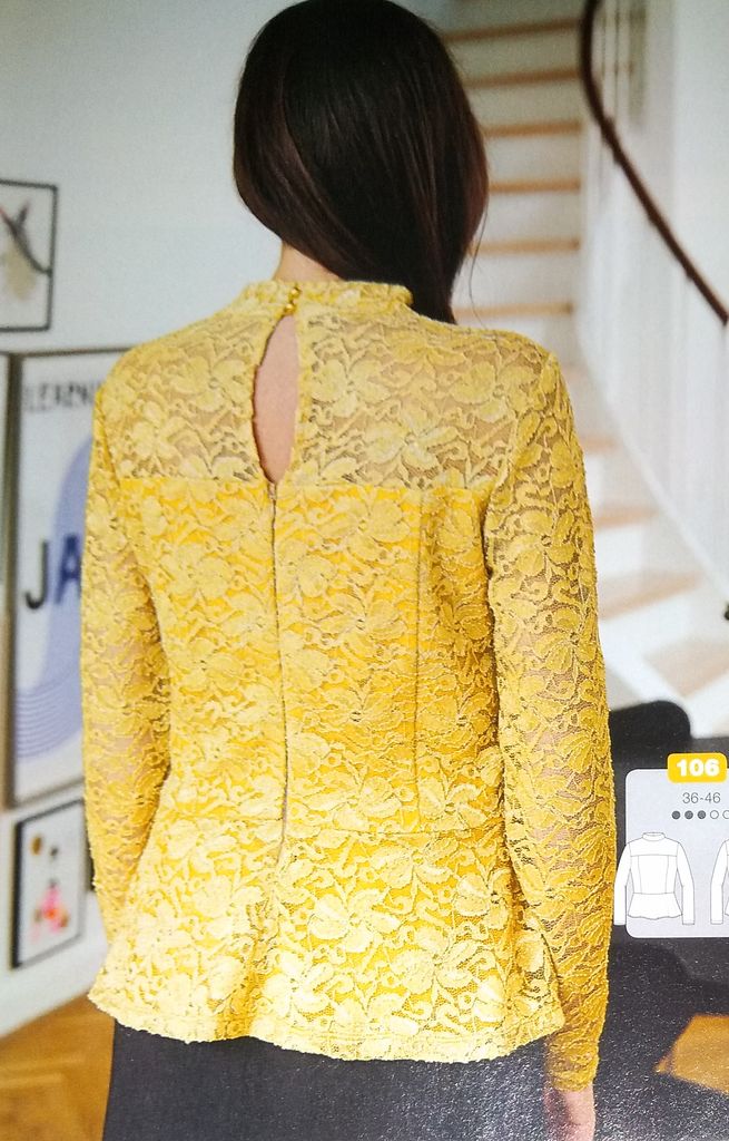 J’aime beaucoup cette blouse tout en dentelle. Elle est à manches longues non doublées. Le corps de la blouse l’est pour plus de décence. Elle possède un empiècement transparent devant, terminé par un petit col montant. Celui-ci se boutonne dans le dos à l’aide de deux brides et d’un bouton et met en valeur l’ouverture dos. Les découpes cintrent la silhouette qui se termine par une basque, elle aussi doublée. Elle va de la taille 36 au 46.