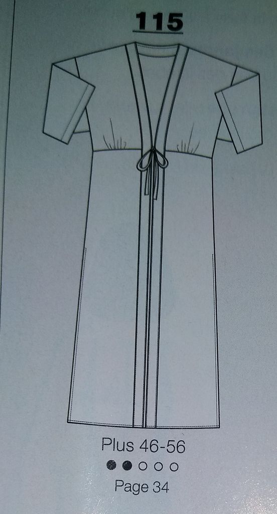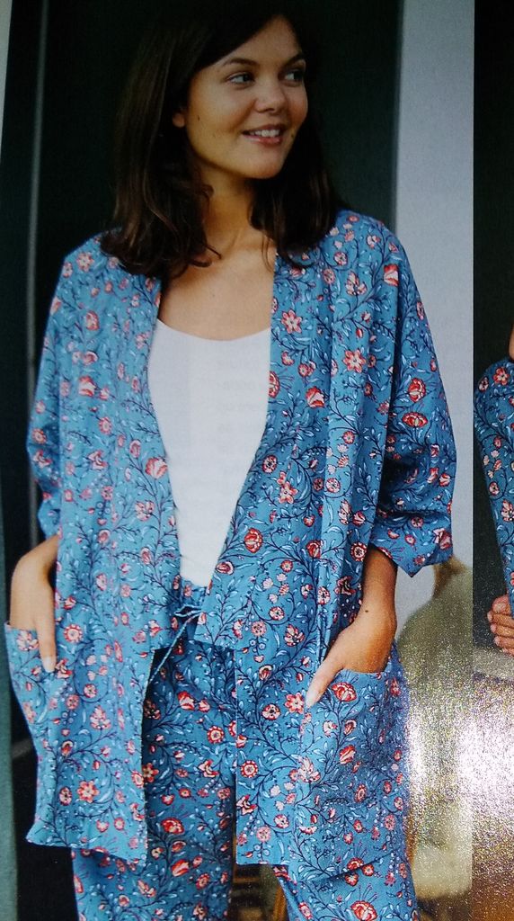 J’adore cet ensemble indiqué robe de chambre mais que j’appellerai déshabillé et sa nuisette en grande taille. Cette dernière est réalisée en jersey de viscose. Elle est en deux pièces un haut avec un décolleté en V et de fines bretelles. Il est ajusté à l’aide de pinces partant de la taille. Le bas est tout en souplesse, aérien. La « robe de chambre » est réalisée dans une cotonnade. Elle se noue sous la poitrine. Elle est légèrement évasée et les côtés sont fendus. L’empiècement froncé lui donne l’aisance nécessaire à la poitrine. Les manches sont larges et rappellent les kimonos.