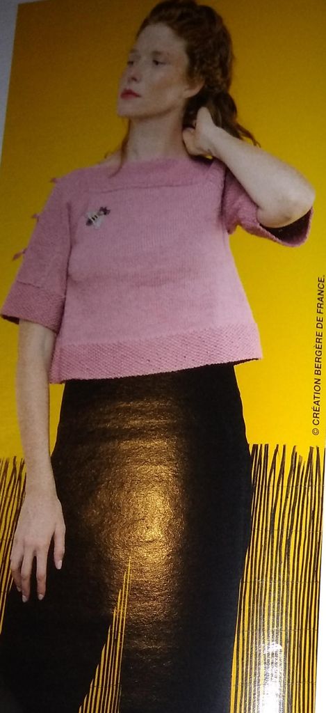 J’aime beaucoup ce premier pull. Il est court, et ses manches courtes sont fendues sur leur longueur. Elle sont gracieusement fermée à l’aide de rubans boutonnés pour laisser apercevoir la peau. L’encolure les bords de manches, les bas de manches ainsi que la bande du bas sont tricotés en point de riz. Tout le reste est en jersey endroit.