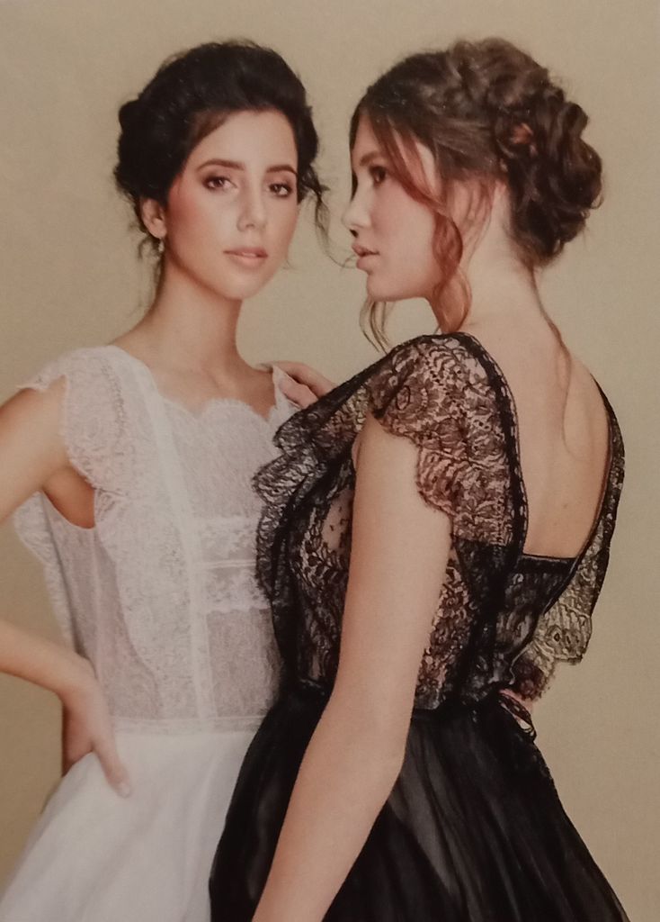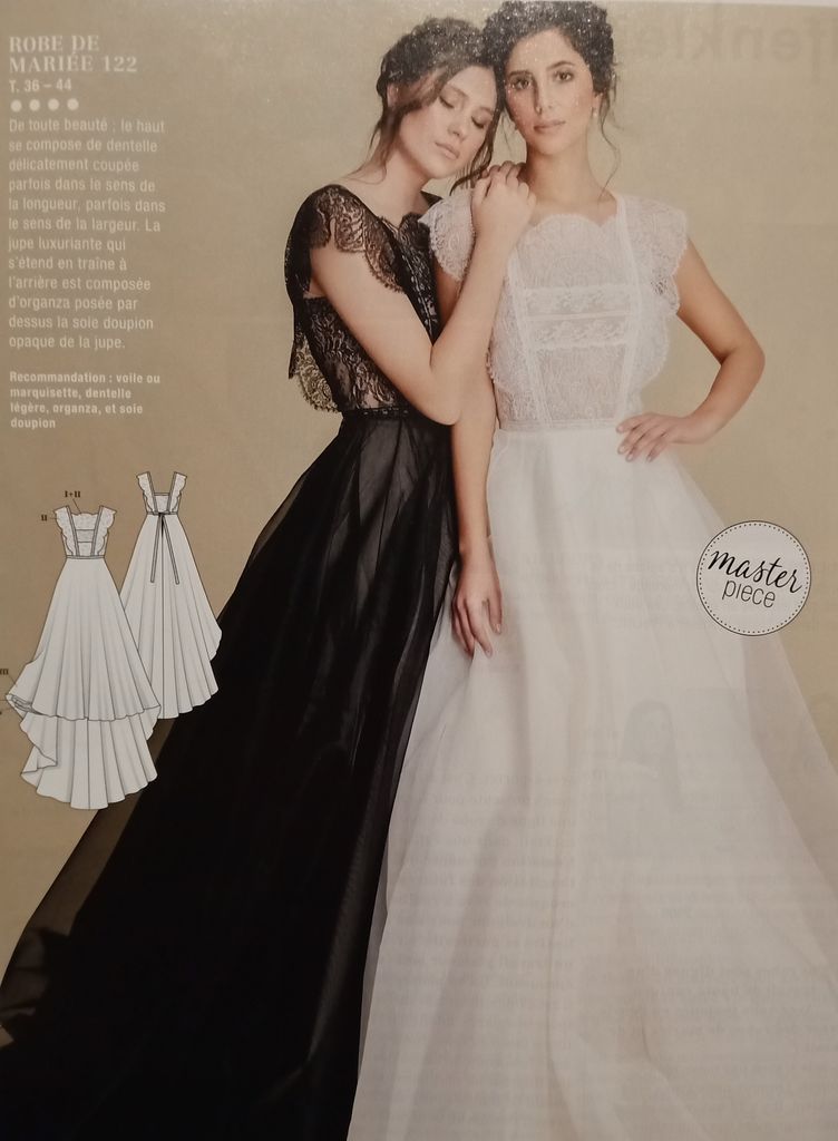 J’adore le modèle de designer! Il s’agit d’une robe de mariée, mais qui peut être aussi de cocktail en changeant la couleur. Pour la petite info, je me suis mariée avec une robe rouge et noire! Le buste est réalisé à l’aide de bandes de dentelles assemblées dans le sens de la longueur ou de la largeur. Elles créent ainsi les larges bretelles qui retombent sur les épaules. La jupe s’étend en traine à l’arrière. Elle va de la taille 36 au 44.