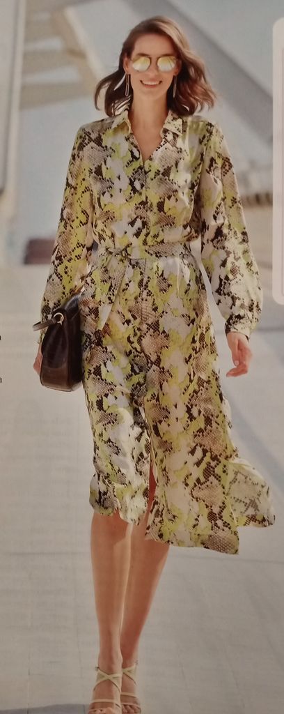 J’adore cette robe! Elle est réalisé en imprimé python, ces motifs se prêtent parfaitement au devant twisté dans la pointe du décoleté en V. Les manches sont de longueur trois quart. une fermeture à glissière dans le dos permet un enfilage aisé. Elle va de la taille 34 au 44.