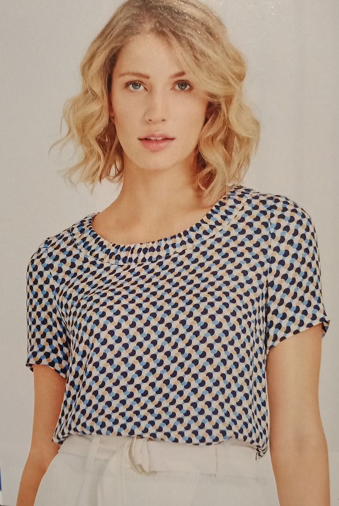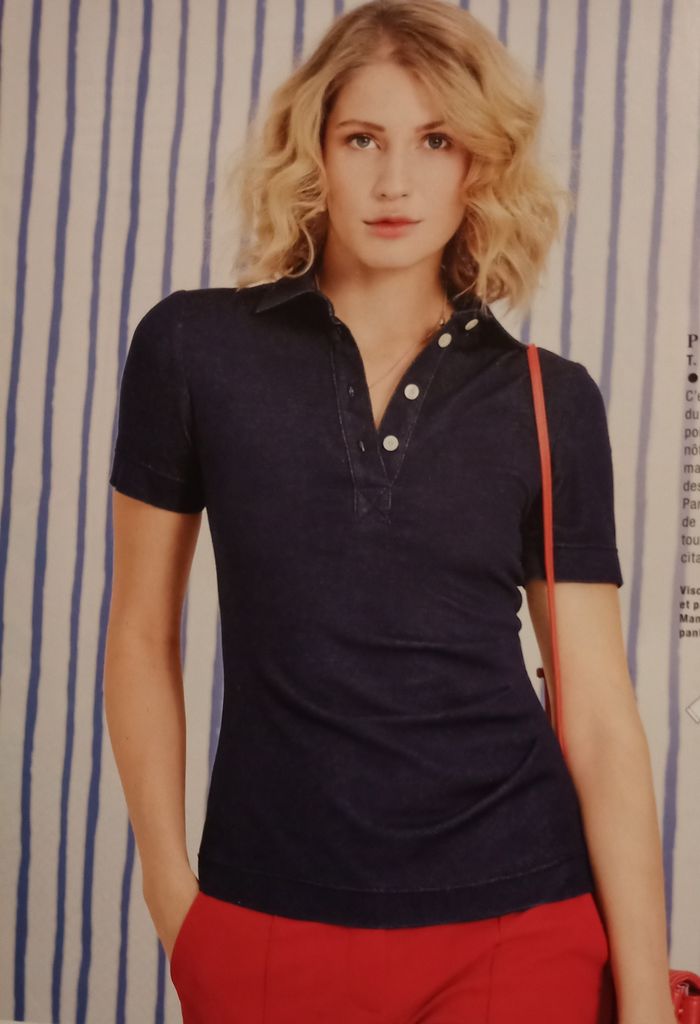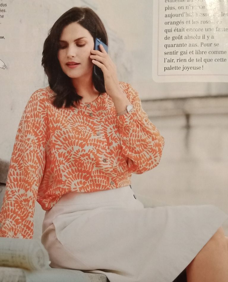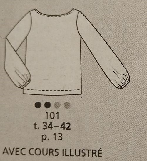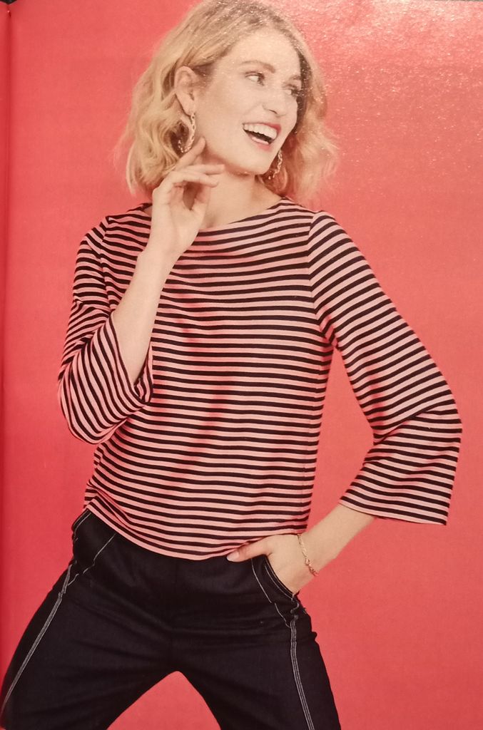 Quand j’ai vu le dessin technique de ce modèle. J’ai pensé « Mouais, un peu déjà vu »… Mais ce n’est pas le cas, toute l’originalité du modèle est dans le dos! Il possède un empiècement twisté sur une goutte. Les manches sont longues et évasées. Elles sont terminées par un élastique sous coulisse pour les resserrer joliment. Ce modèle est parfait pour affronter la fraicheur Printanière. J’inverserais bien le dos et le devant, pas vous? La tunique va du 34 au 42.