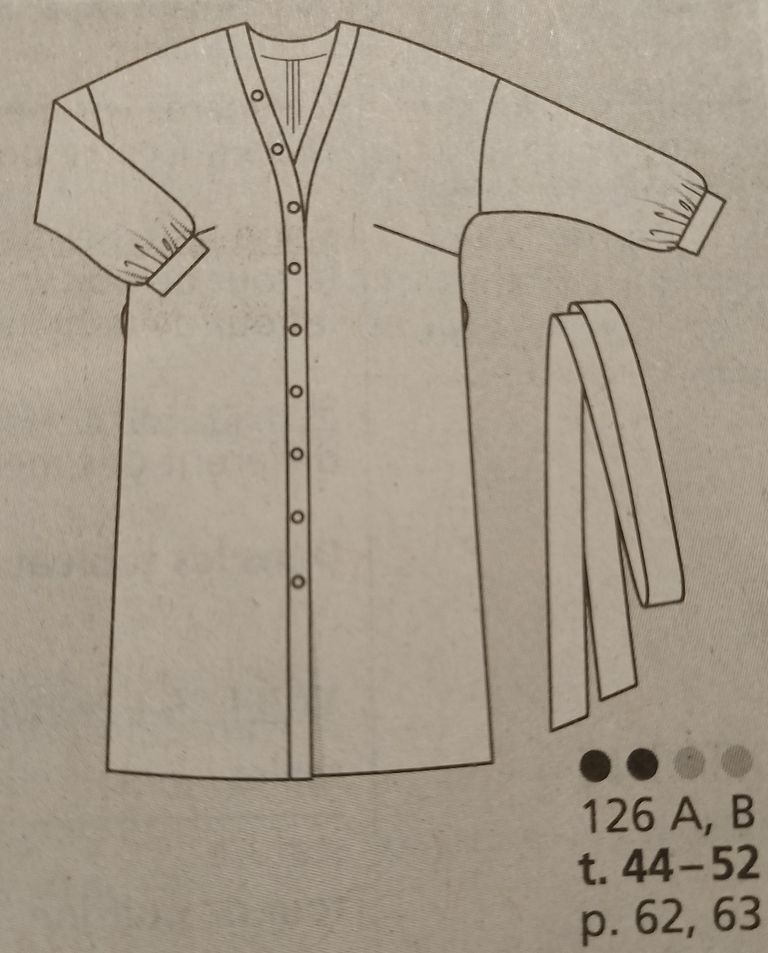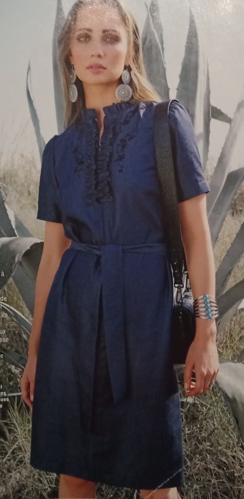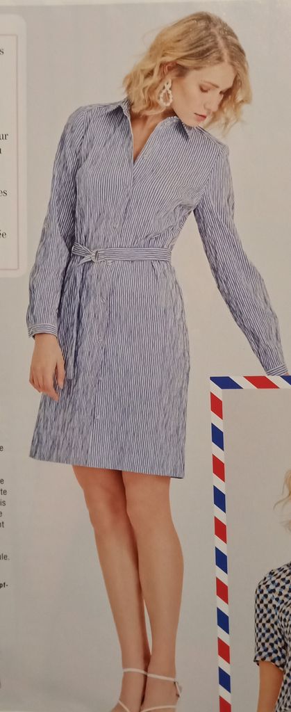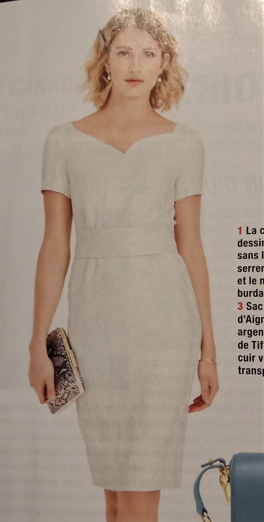 Le modèle rétro! Burda nous propose une revisite d’un modèle sorti en 1961. Il y a prés de soixante ans. Ce modèle est intemporel. Le seule détail qui change c’est la taille moins serrée. Le buste est ajusté à l’aide de pinces et de plis à la taille. L’encolure est de forme cœur sur le devant et ronde dans le dos. La jupe est de forme fourreau. Une large ceinture vient compléter cette pièce avec un nœud dans le dos. Elle va de la taille 34 au 44.