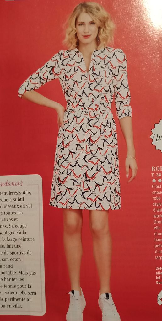 Même chose pour cette robe, que j’ai trouvé mémérisante sur le dessin ainsi que la photo avec la robe blanche. Mais alors dans la version zébrée rouge/bordeaux, elle est splendide. Juste sexy ce qu’il faut! La robe possède des manches trois quart terminée par une bande bracelet. La patte de boutonnage longe l’encolure. Il ne vous reste qu’a jouer avec l’ouverture des boutons ou pas. Elle va de la taille 44 au 52.