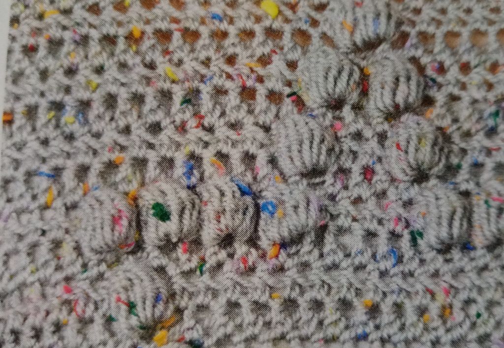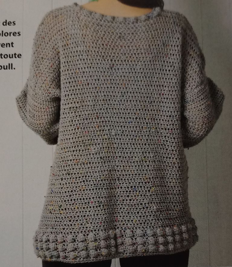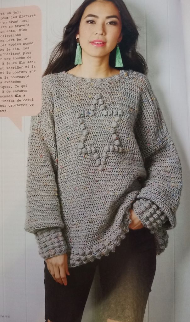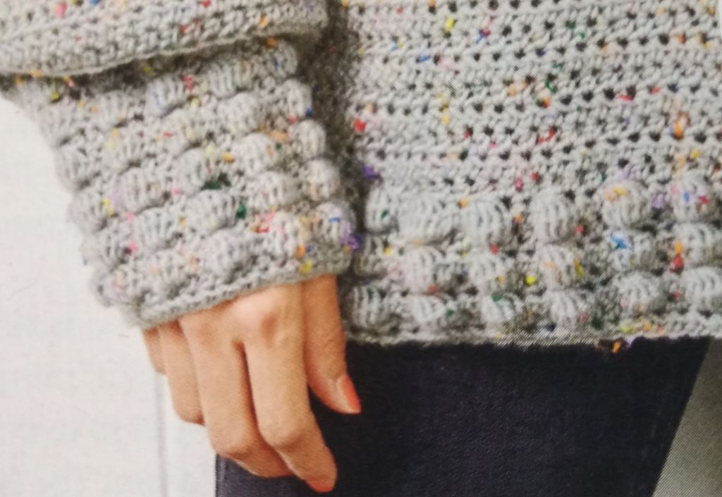 Ce pull est magnifique, les nopes permettent de faire des points en reliefs et donc ici d’avoir une jolie étoile. Les manches sont longues et avec un peu de volume. Le poignet est plus ou moins long lui aussi selon le nombre de rangs de nopes que vous choisirez. Ils permettent de structurer l’ensemble et de réduire l’ampleur. On retrouve ce point dans le bas du pull ainsi qu’a l’encolure.