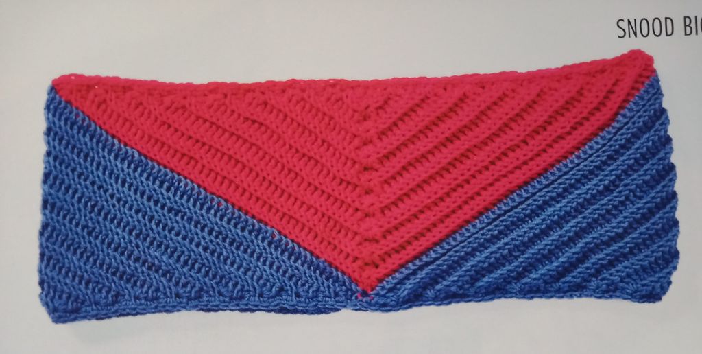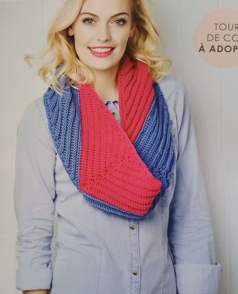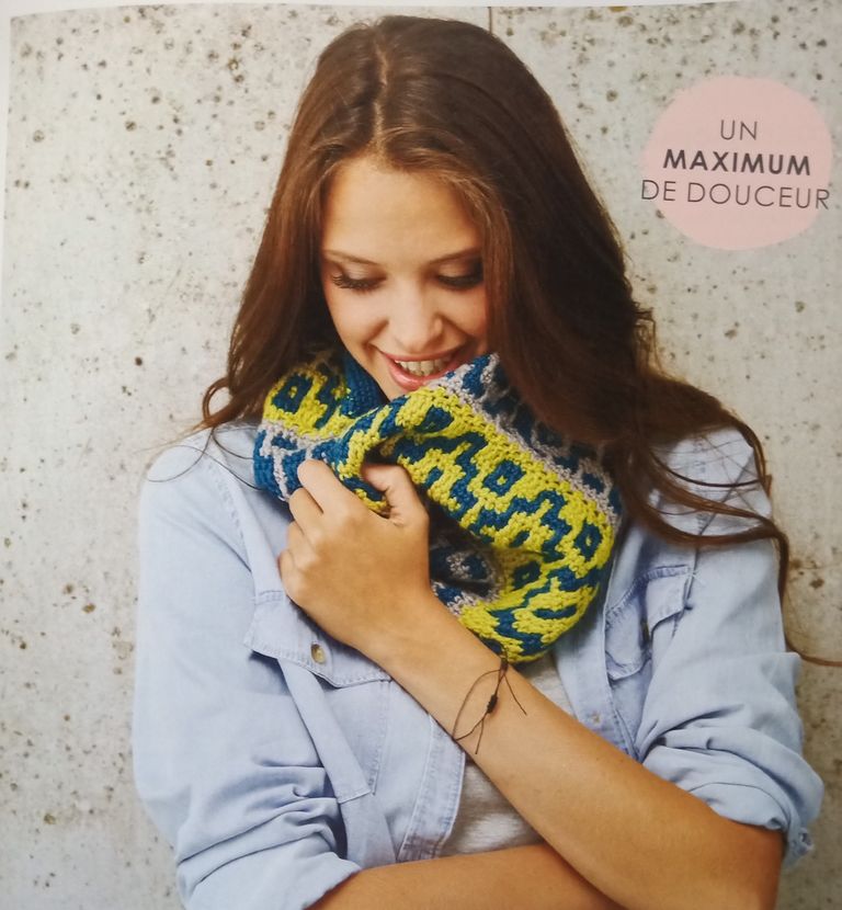 Encore un snood, je pense que celui-ci peut faire double tour. Il est orné d’un motif graphique, mis en valeur par les couleurs vives.
