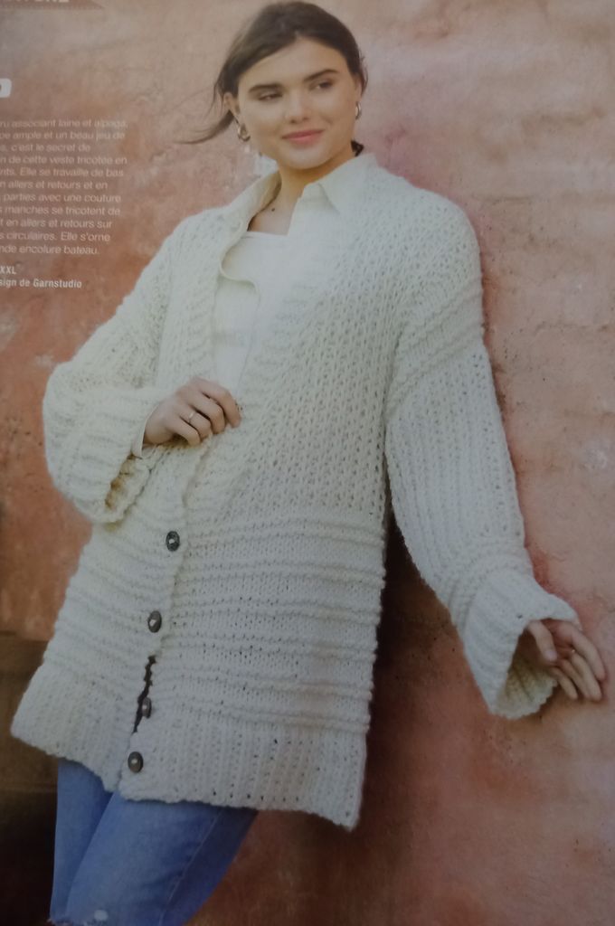 Encore un vêtement au crochet! Il s’agit d’un long gilet. Son point fantaisie mêle, des brides, des demi-brides et des mailles en l’air. Je le trouve très élégant, de prime abord je pensais qu’il était réalisé entièrement au tricot. Pas du tout ce n’est que du crochet! Il va de la taille 34 au 50.