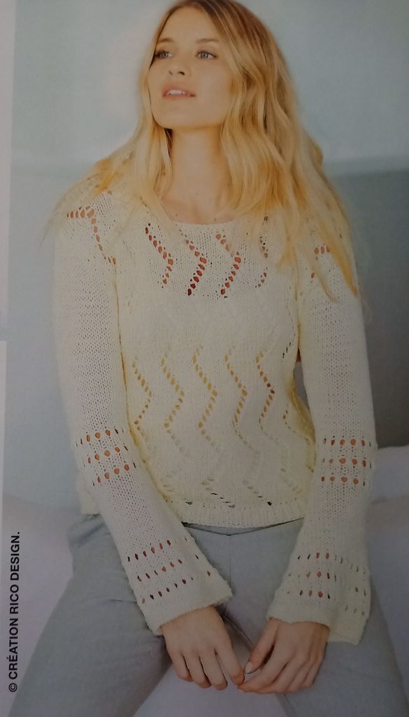 Ce top est superbe lui aussi. Il possède une encolure bateau, et des ouvertures sur les épaules. Le haut ainsi que les emmanchures sont bordés par une série de point mousse. Le top est lui réalisé dans un point fantaisie aéré semblable à de la dentelle. Il va de la taille 34 au 52