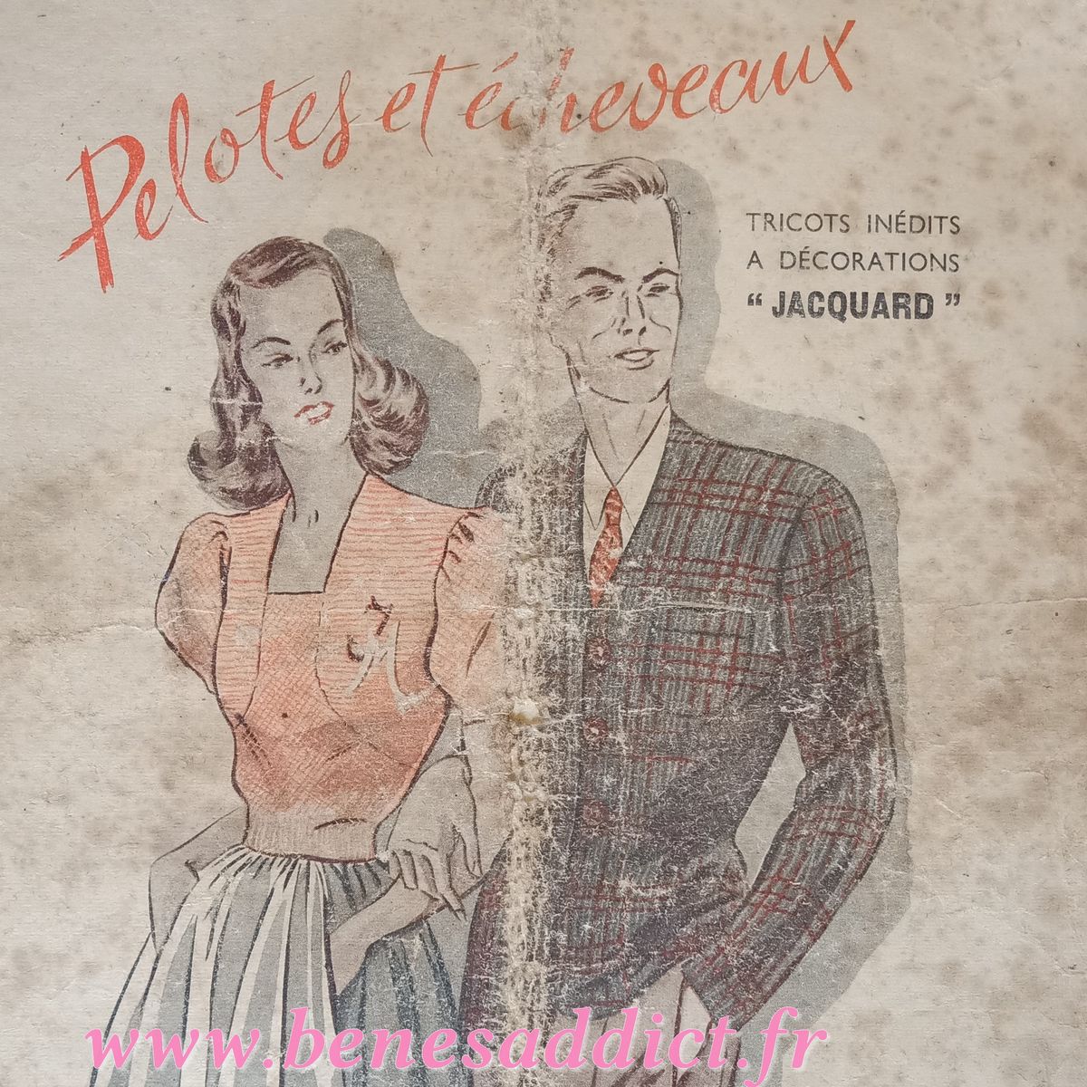 Aujourd’hui nous partons en 1945 , avec du tricot. Elle a pas mal souffert, comme le montre la couverture. Je ne connaissais pas cette revue, j’adore fouiner dans mes étagères et retrouver des trésors. Elle « s’appelle Pelotes et écheveaux » et il s’agit du numéro 1 daté de 1945.