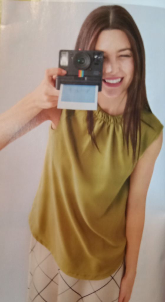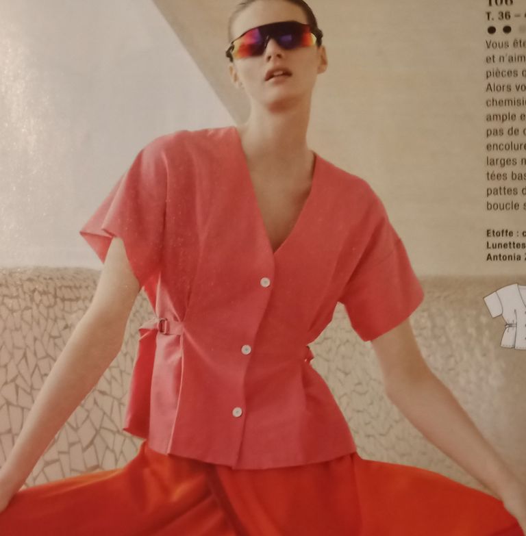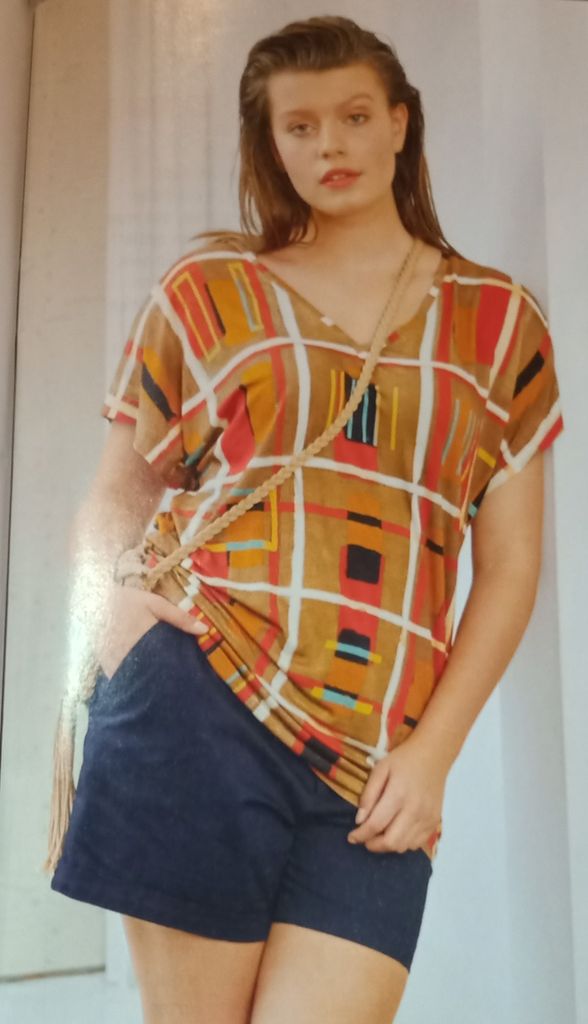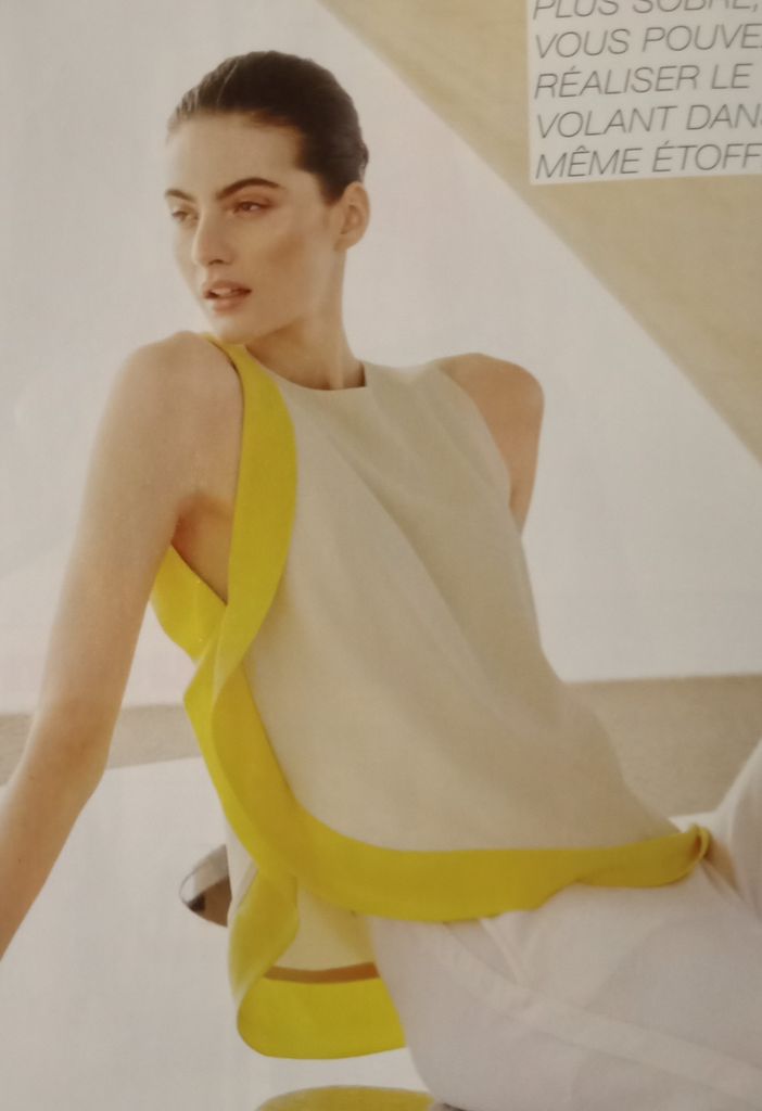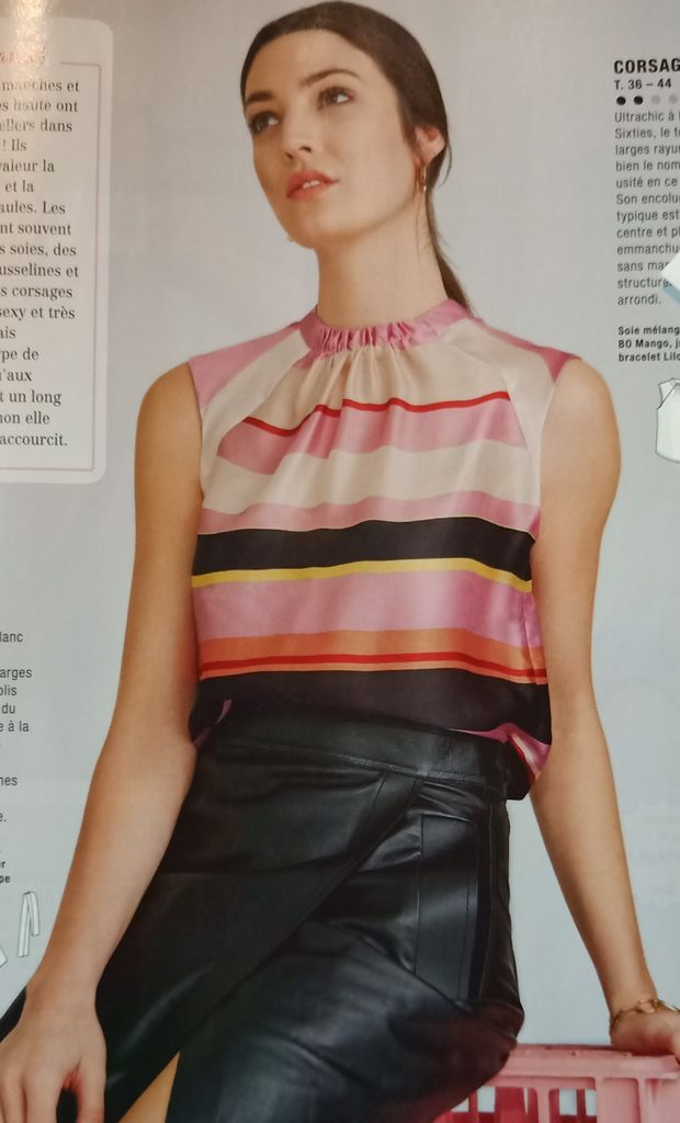 Dernier coup de cœur, pour un top sans manche avec des coutures raglans. Le parement d’encolure est élastiqué sur une portion du devant. Cela donne de l’ampleur confortable sur le devant. Il va de la taille 36 au 44.