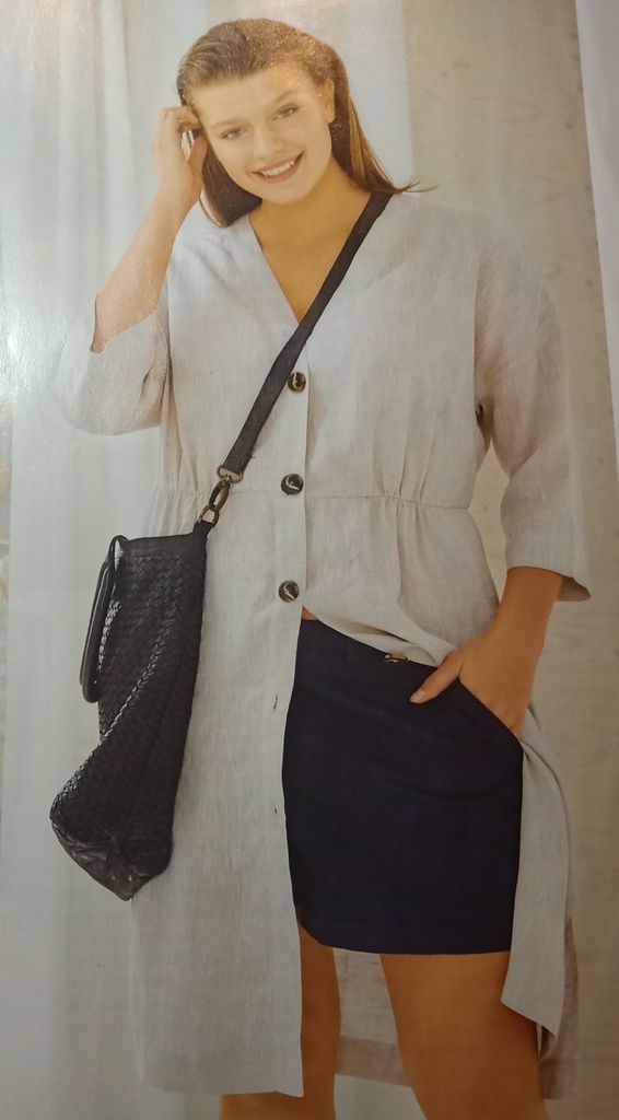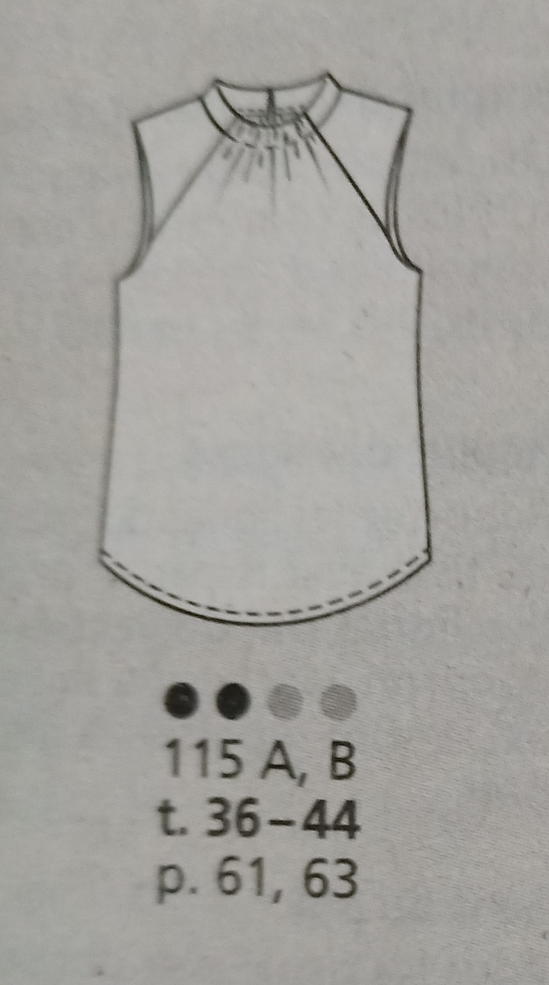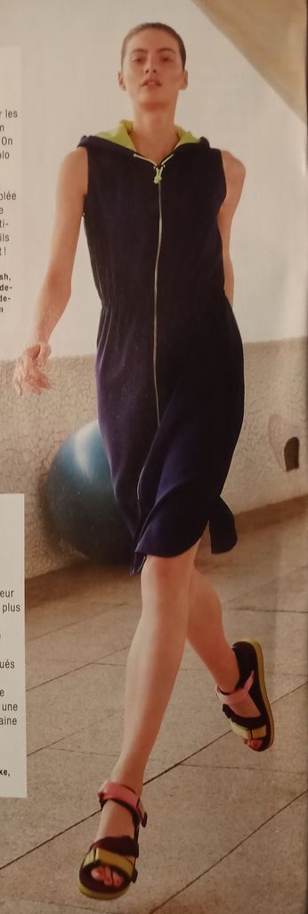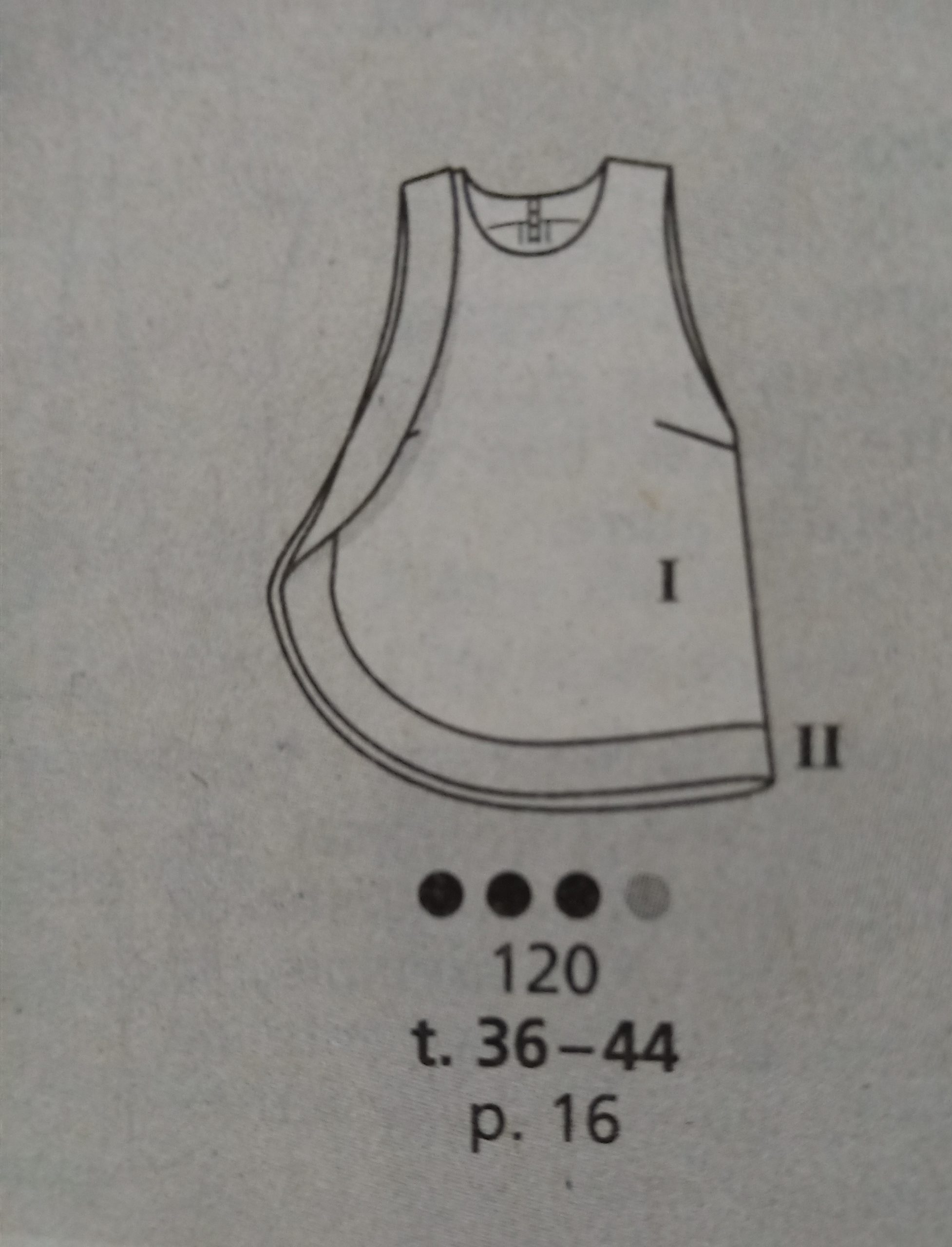 Dernier coup de cœur, pour un top sans manche avec des coutures raglans. Le parement d’encolure est élastiqué sur une portion du devant. Cela donne de l’ampleur confortable sur le devant. Il va de la taille 36 au 44.