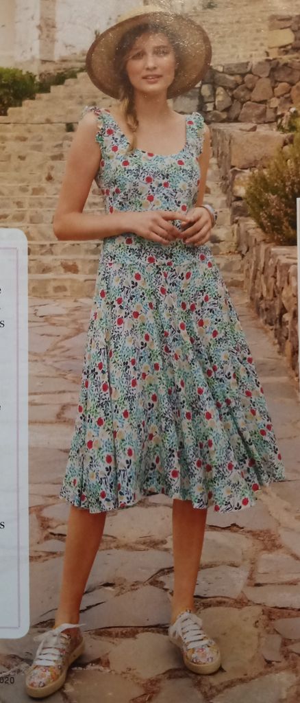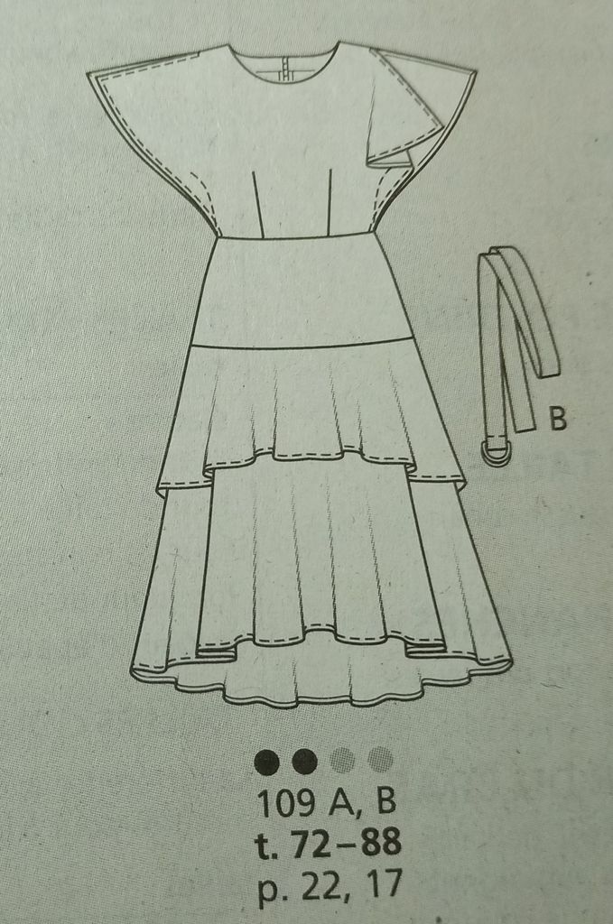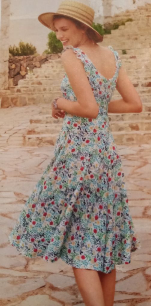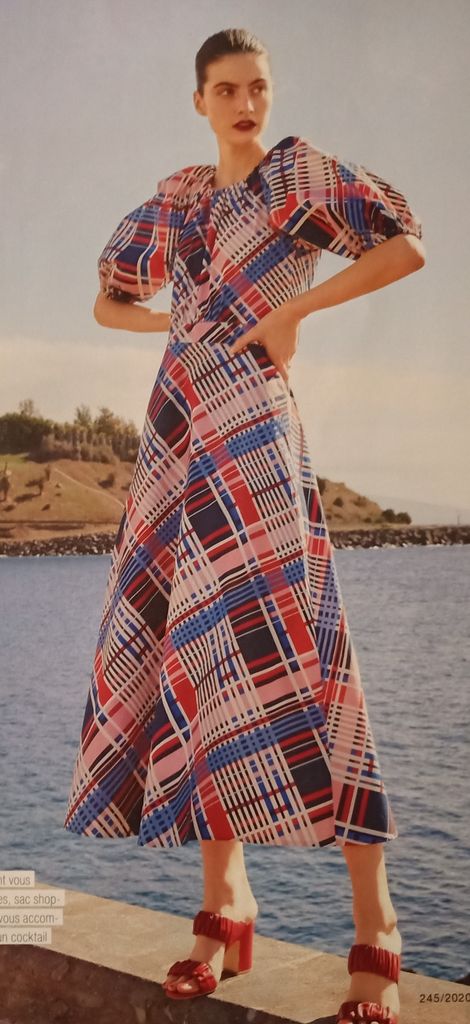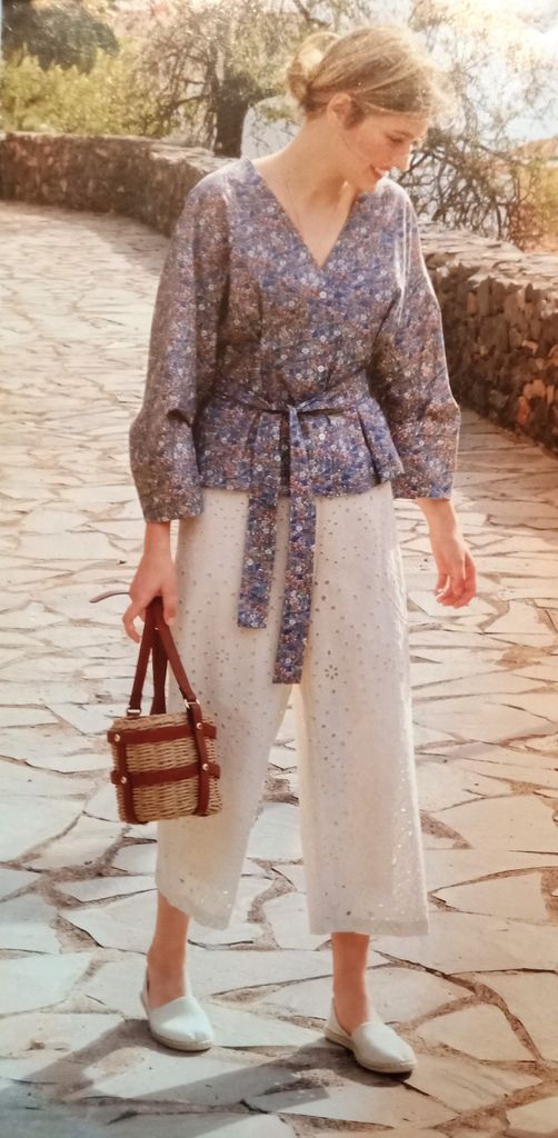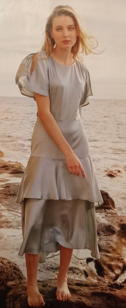 J’adore cette robe virevoltante! Le haut possède de larges manches chauve-souris flottante car ouvertes. La jupe est composée de 2 volants partant des hanches et plus longs sur le dos. Elle est réalisée en soie, c’est le moment d’utiliser l’ourlet roulotté que je vous ai montré dans l’article Comment réussir à coup sûr votre OURLET à la main avec 5 types de points différents!. Elle va de la taille 77 au 88.