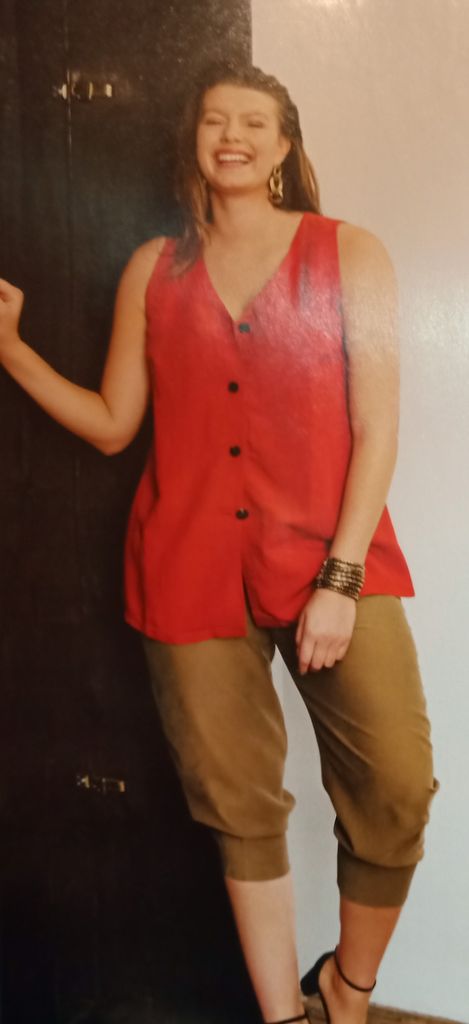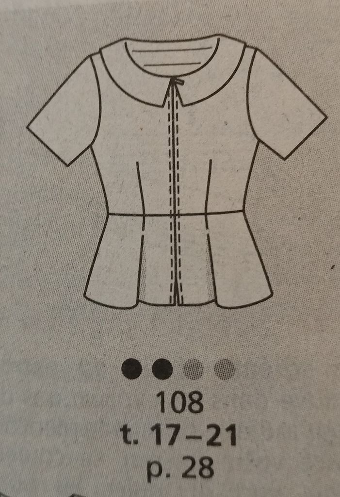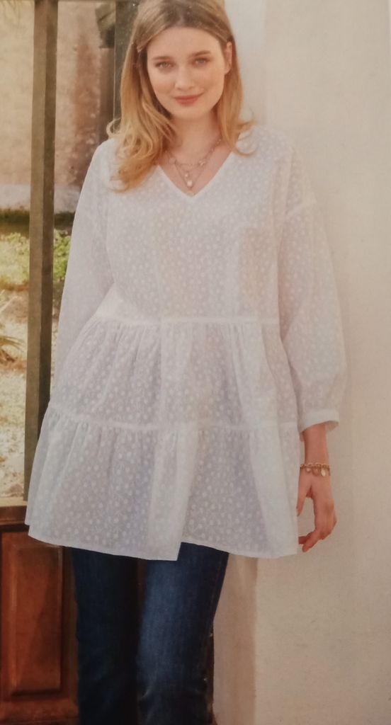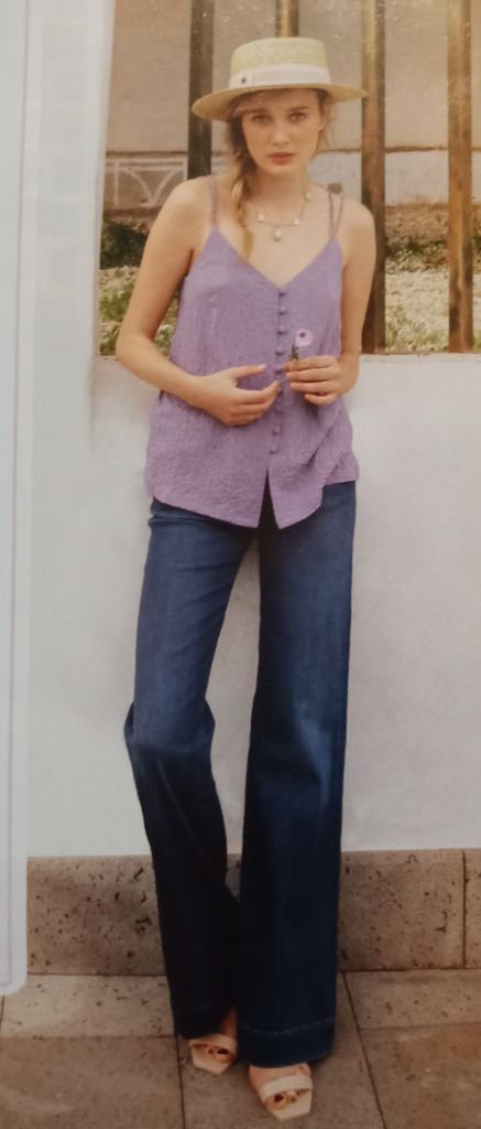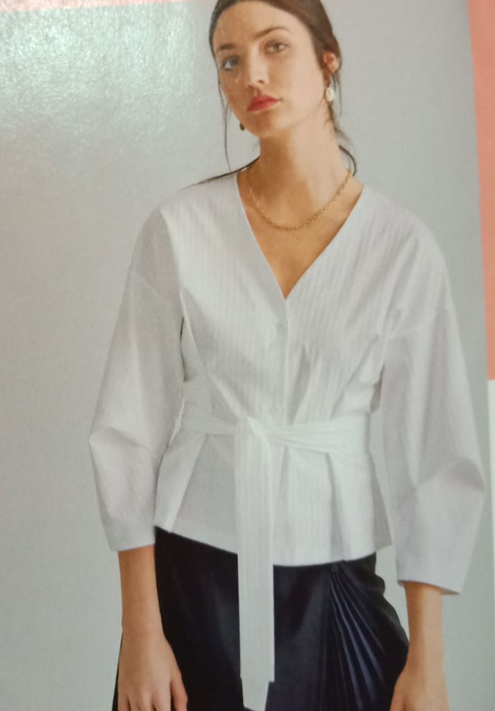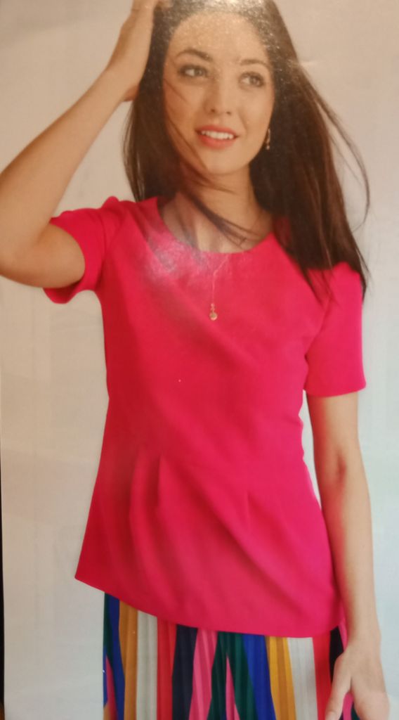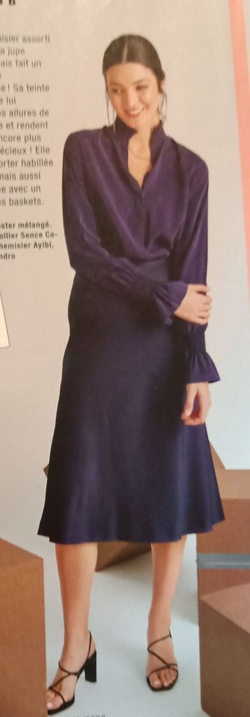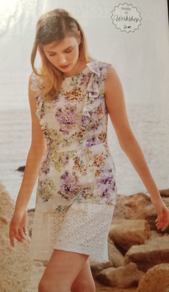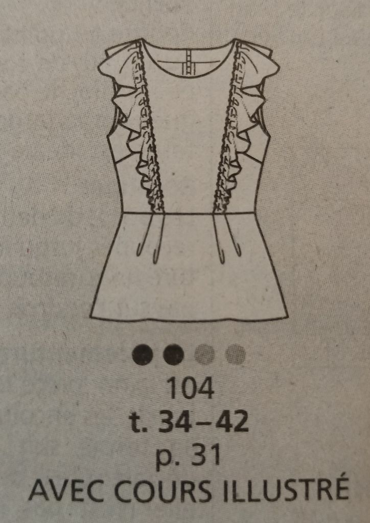 J’aime rarement les tops à volants, je les trouve toujours trop larges ou trop imposants. Concernant ce modèle ce n’est pas le cas. Il s’agit d’une blouse sans manches. Le haut est encadré de ruchés des deux côtés de l’encolure ronde. Une basque avec quelques plis part de la taille. Elle va du 36 au 44.