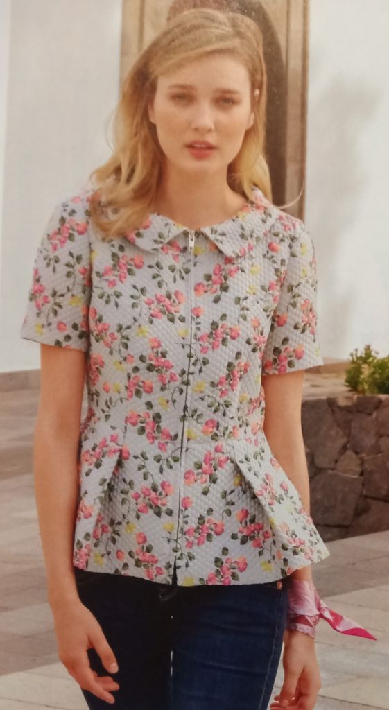 Bon ici forcément j’ai craquésur cette jolie petite veste d’inspiration rétro toute en douceur, avec un imprimé à fleurs roses! Le modèle est assez simple dans sa conception. Elle est à manches courtes, libre à vous de les rallonger. Deux pinces de tailles, permettent de l’ajuster. Elle possède un col Claudine. La basque qui part de la taille est garnie de deux plis. Elle va de la taille 17 à 21.