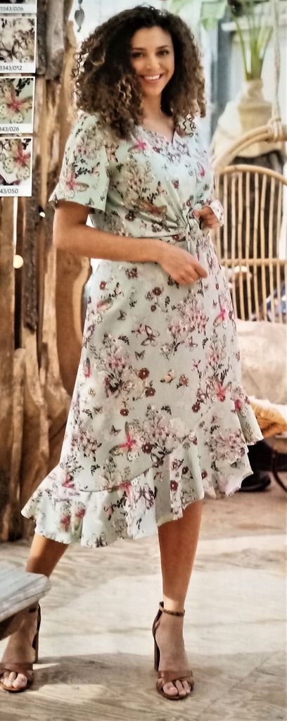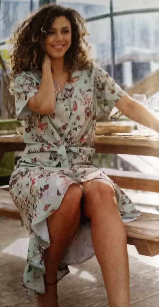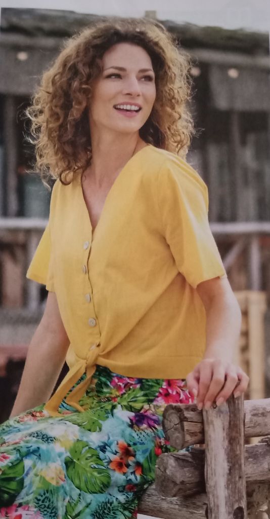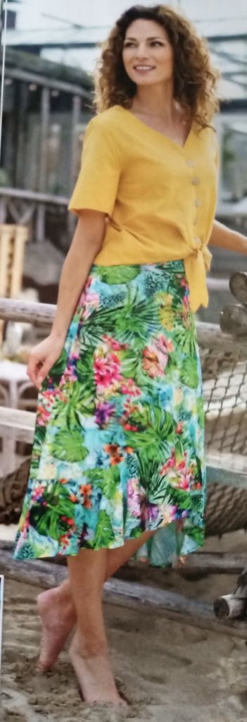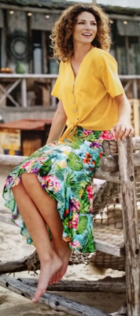 J’ai flashé sur ce que je pensais être une robe plus précisément sur l’ensemble en un seul tissu. J’ai trouvé banal la jupe et le haut dans les deux coloris différents. Mais finalement j’ai été la première étonnée de voir que finalement c’était deux pièces différentes! En effet il s’agit d’une blouse à manches courtes. Elle est boutonnée et nouée sur le bas de la patte de boutonnage. La jupe a une belle ampleur. Elle est plus courte sur le devant que le dos. Son ourlet est bordé d’un volant.
