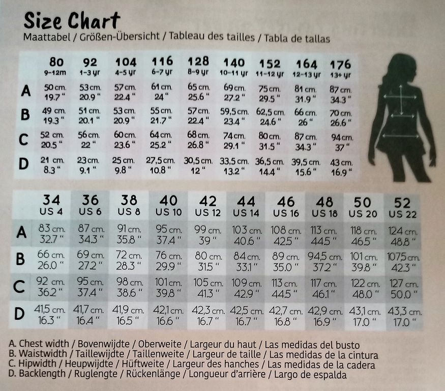 La mode enfant va du 80 cm au 176 cm , c’est valable pour tous les modèles! Devinez quoi? C’est la même chose aussi pour la mode femme qui va du 34 au 52. C’est génial tous les patrons dans la même amplitude de taille que ce soit pour enfants ou pour nous!