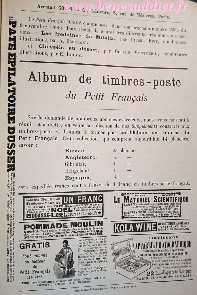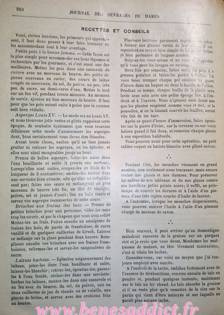 Il s’agit de plusieurs numéros de « Journal des Ouvrages de Dames » datant de 1896! Vous trouverez de tout quelques réclames, du tricot, de la broderie, de la couture mais aussi de la coupe à plat, tout comme des recettes de cuisine…
