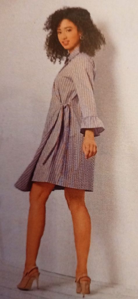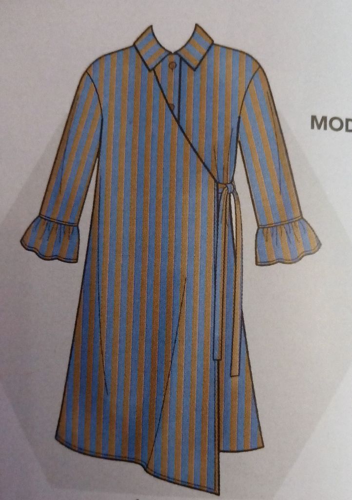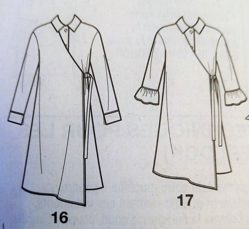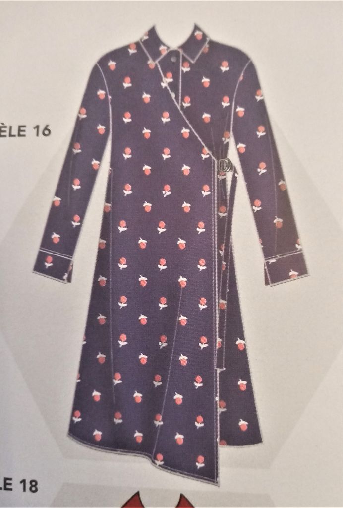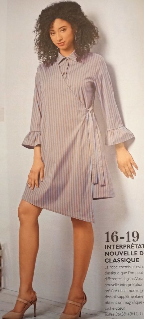 Dernier coup de cœur encore pour une robe, histoire de changer un peu. Quand on regarde le modèle celui ci semble compliqué. Il s’agit en fait d’une robe chemisier classique. Elle a des manches longues. Légèrement ample, l’effet est accentué par le pan supplémentaire qui est asymétrique. Il vient s’attacher sur le côté à hauteur de la taille. Elle va de la taille 36 au 46