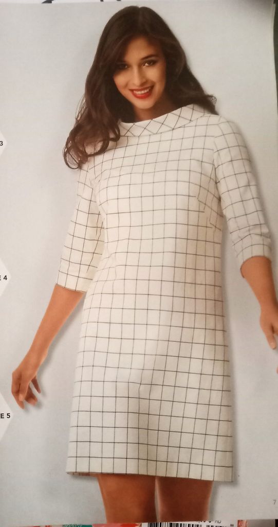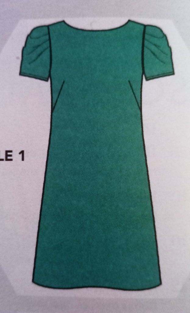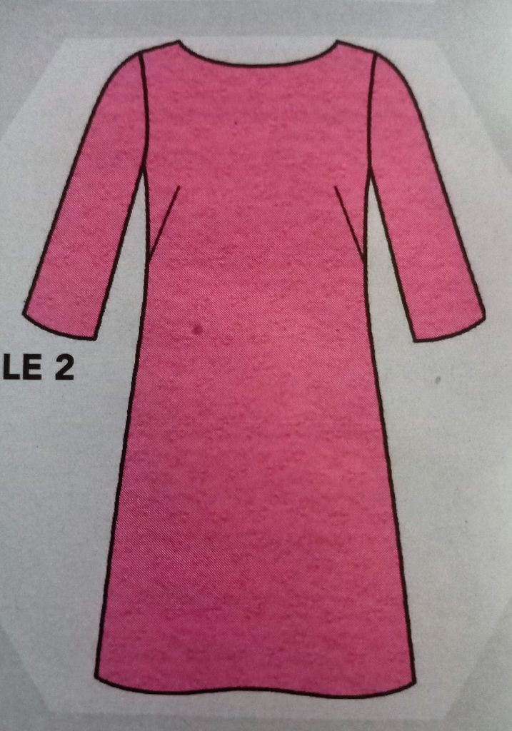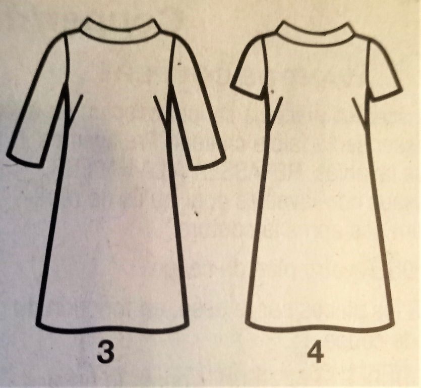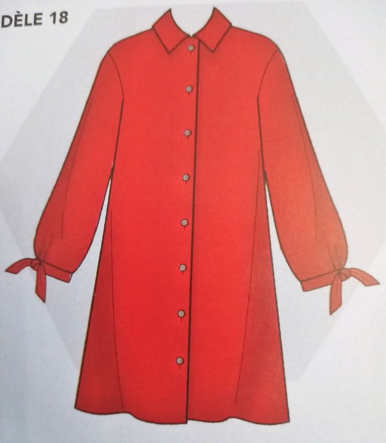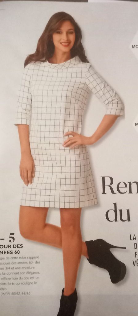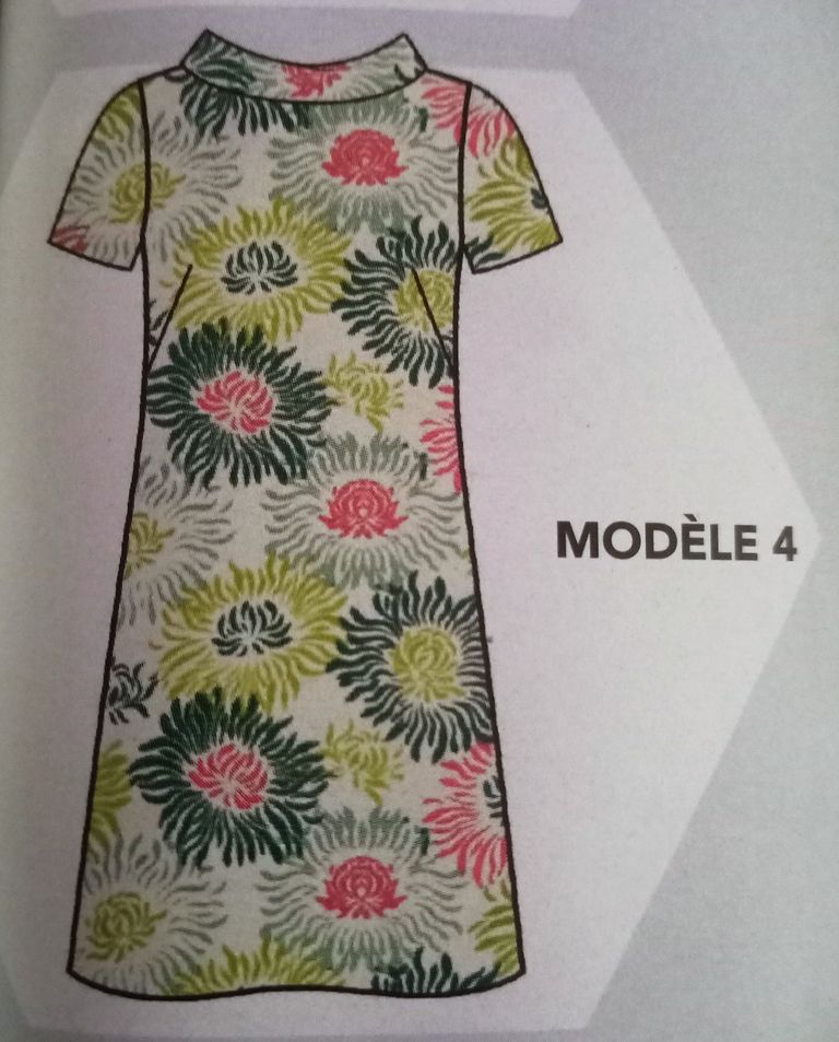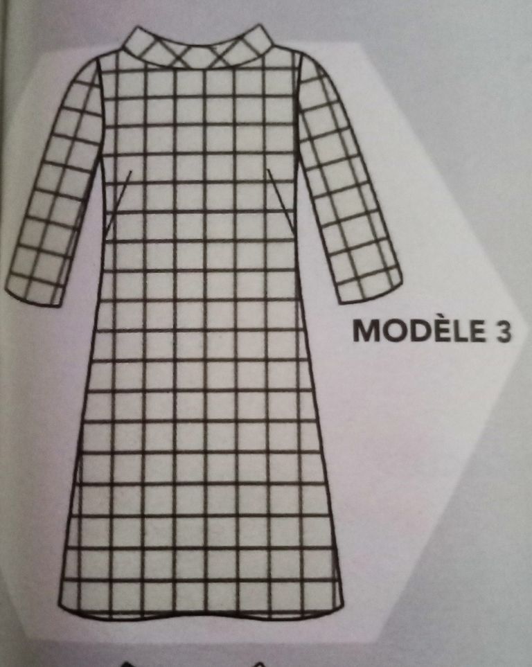 Encore une robe, ici aussi en deux versions manches courtes ou longues, qui me fait penser aux robes des années 60. Elle est de forme trapèze avec une encolure bateau et un col officier loin du cou. Elle va de la taille 38 au 48.