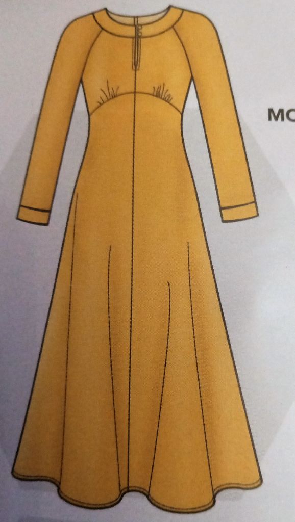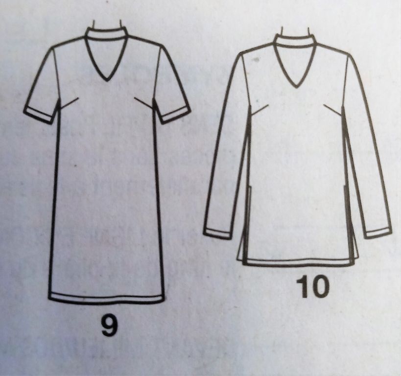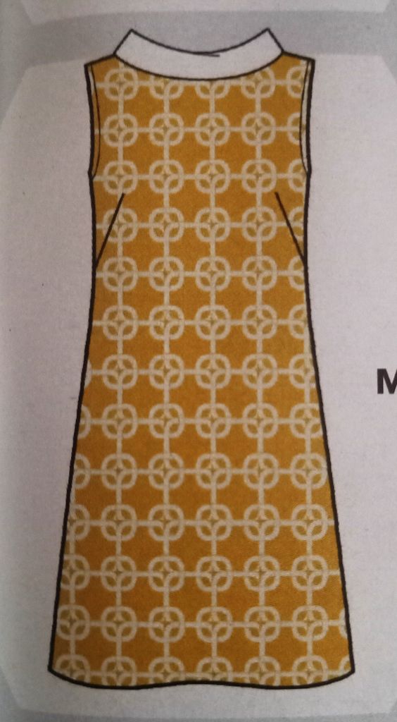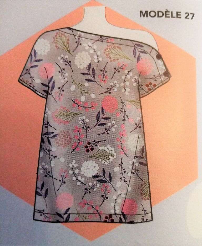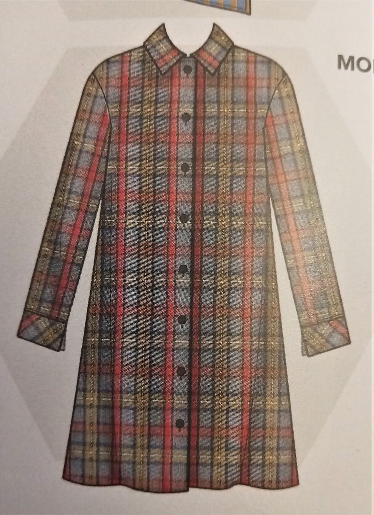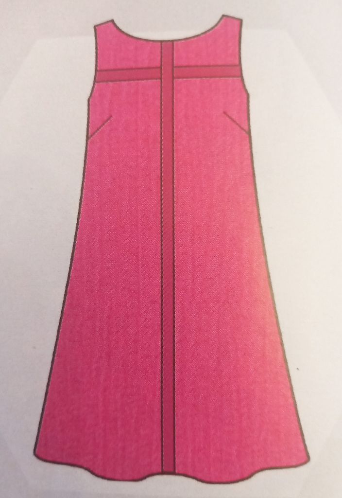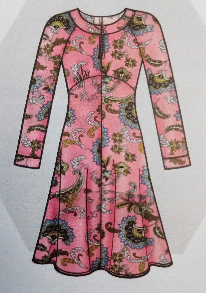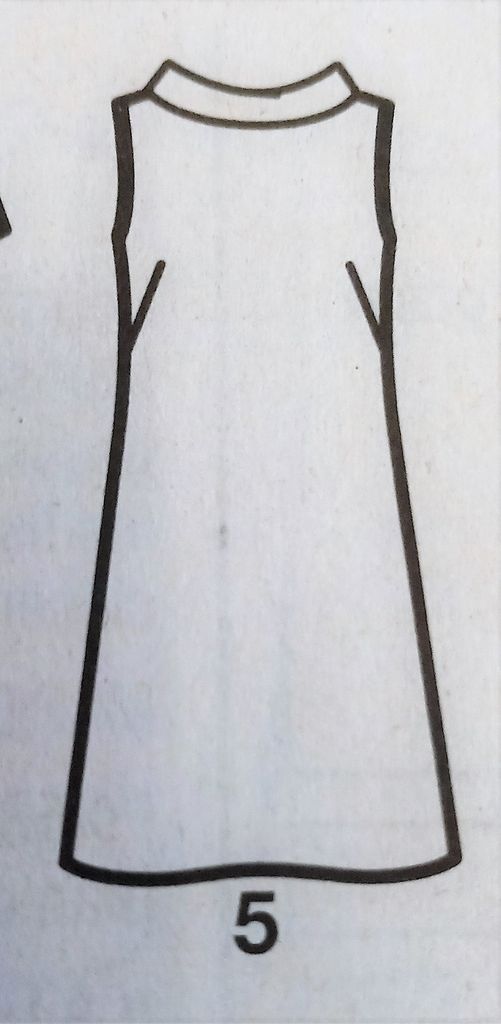 Encore une robe, ici aussi en deux versions manches courtes ou longues, qui me fait penser aux robes des années 60. Elle est de forme trapèze avec une encolure bateau et un col officier loin du cou. Elle va de la taille 38 au 48.