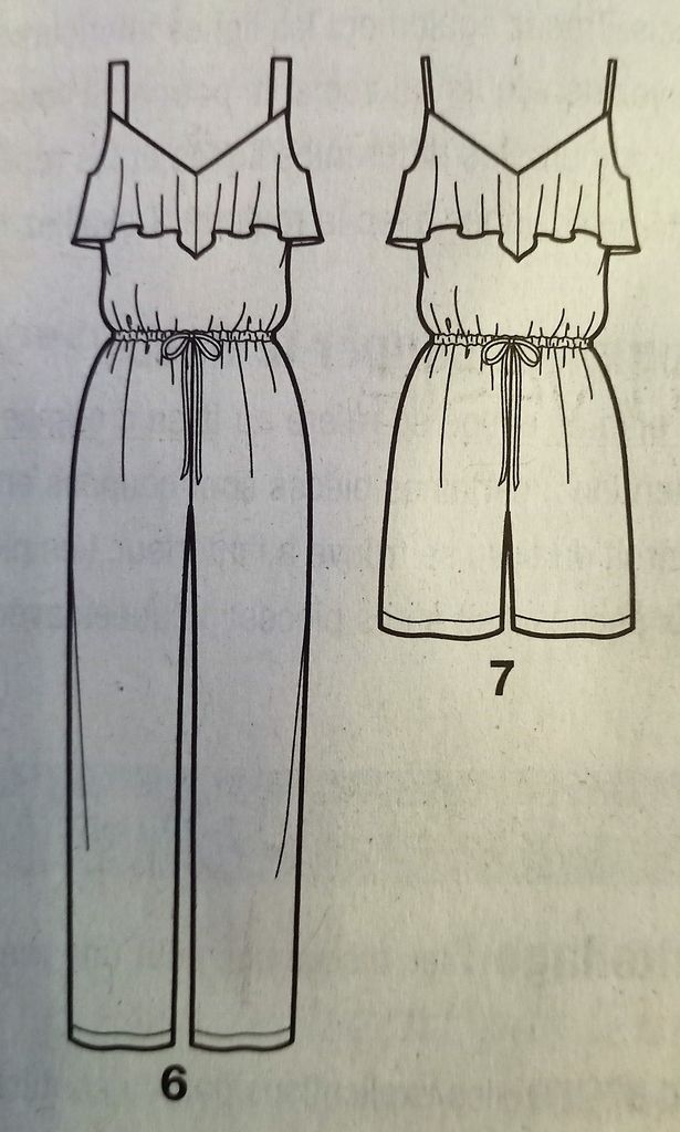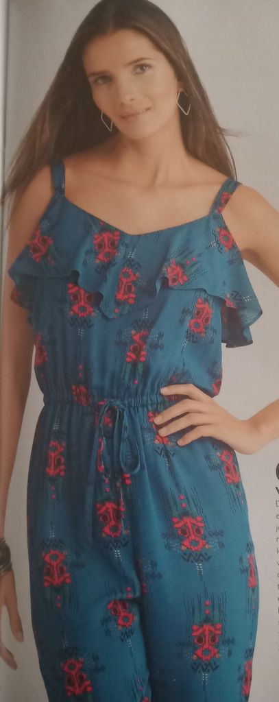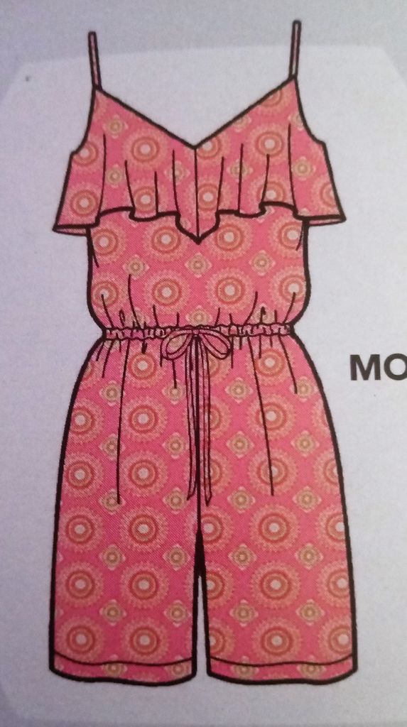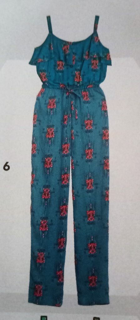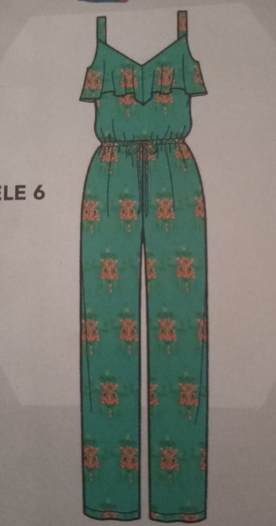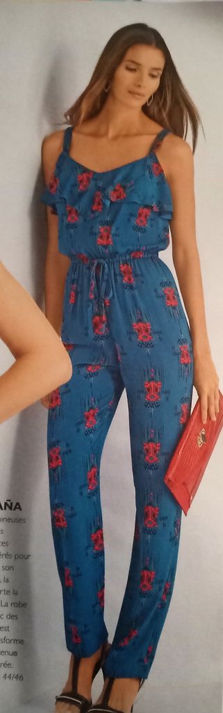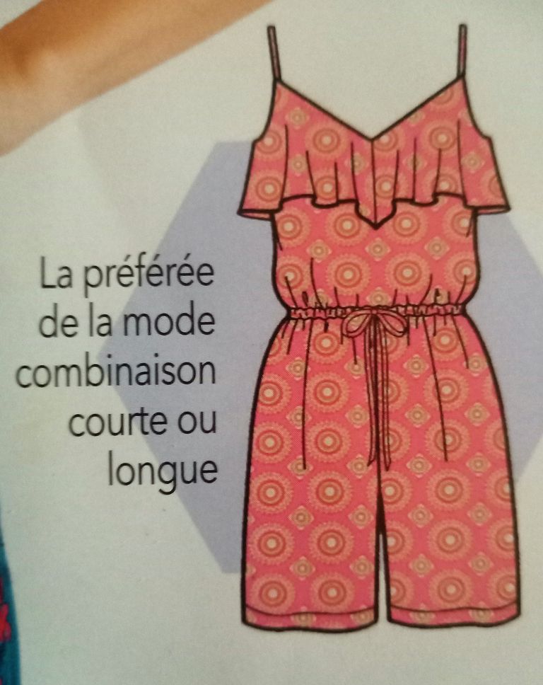 J’ai longtemps décrié les combinaisons pantalons, mais finalement j’adore! J’en porte et j’adore! Bon le passage aux toilettes, est toujours un peu rigolo, on se sent nue! Ici le modèle est tout simple, il est à petites bretelles, avec un volant qui fait le pourtour de l’encolure. Celui-ci se termine en pointe sur le devant. La taille est élastiquée avec un lien supplémentaire sous coulisse pour régler et habiller la taille. Le pantalon est fluide, tout comme la version short. Elle va de la taille 36 au 46.