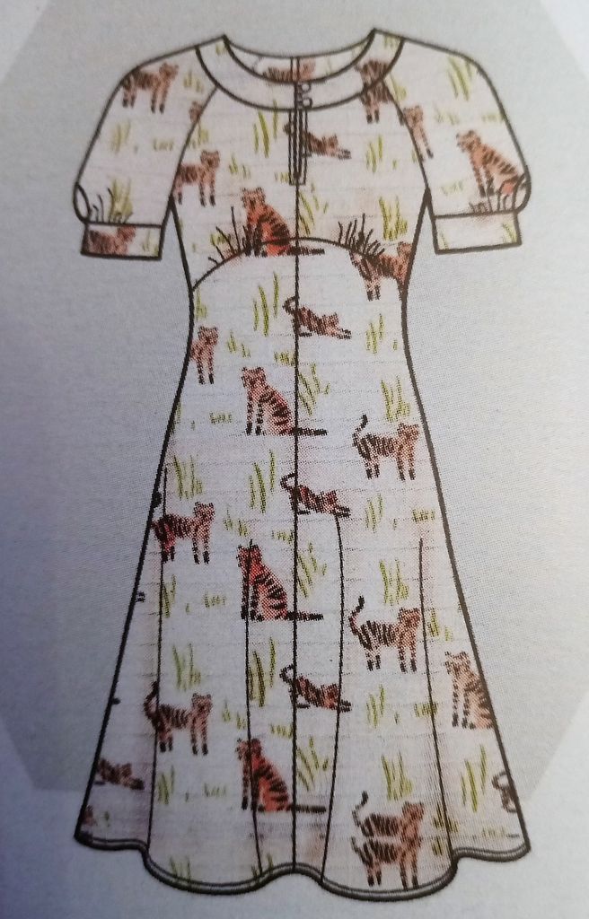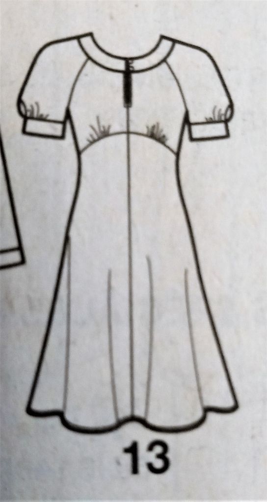 J’adore cette robe, elle existe en plusieurs versions. Ici, il s’agit d’une robe à manches raglan courtes et froncées, façon manches ballons. Le buste possède un parement qui se termine sur le devant pas une fente fermée par un bouton et une bride. La ligne de taille est surélevée en arrondi, le buste est froncé au dessus pour donner la place nécessaire à la poitrine. La jupe est avec 4 panneaux est toute en souplesse. Un modèle que je trouve d’inspiration rétro sous le soleil de l’été.