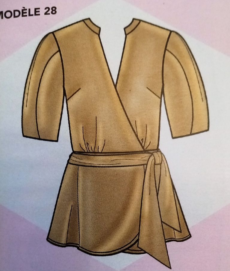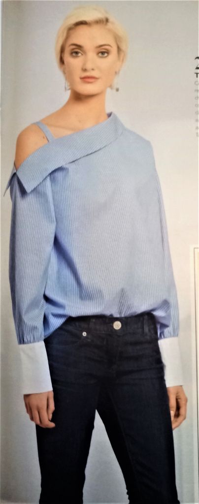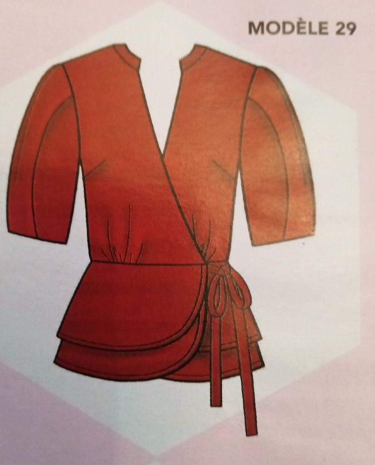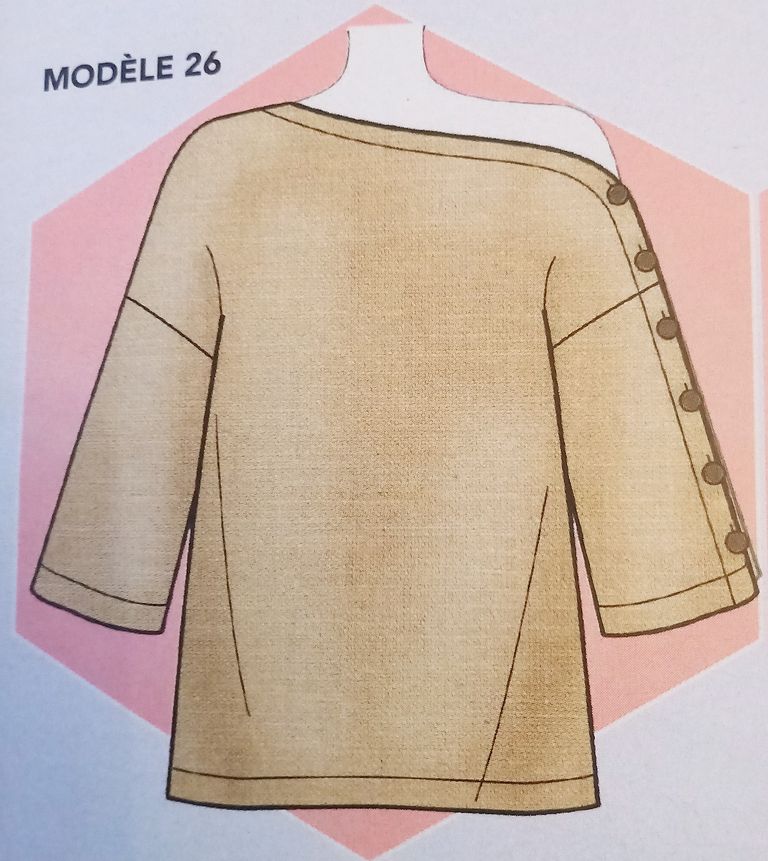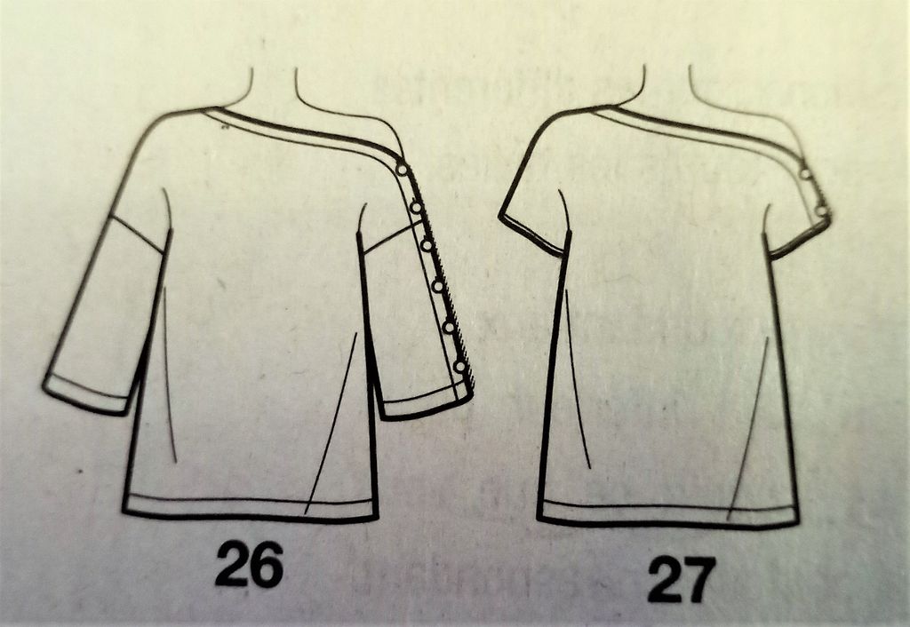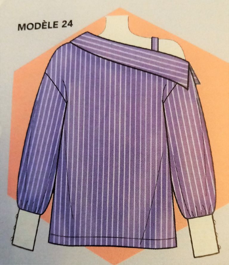 J’adore ce mix entre une chemise et un top. En effet une épaule est entièrement dégagée, avec un petit lien ou une bretelle à nouer, mais surtout elle est ornée d’un grand col asymétrique. La couture de manche est basse, sur des manches longues terminées par des poignets haut. Pour la version manches courtes, elles sont resserrées dans le bas avec un élastique. Ces deux pièces vont du 38 au 48.