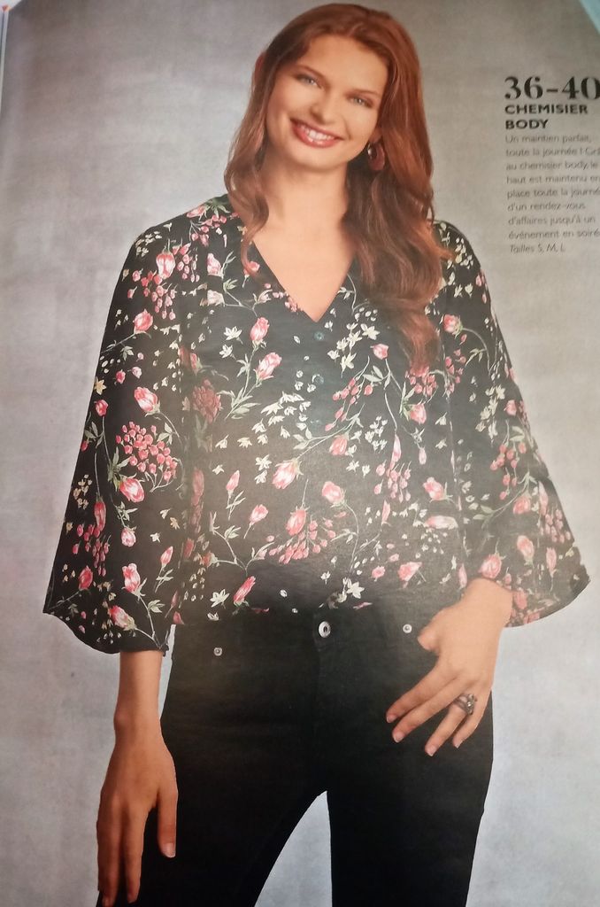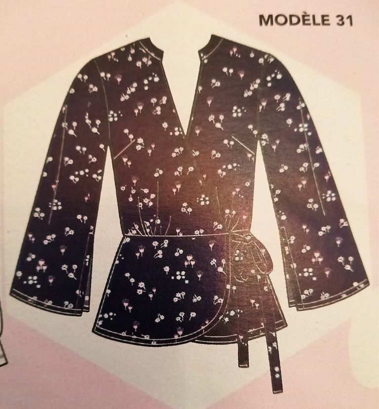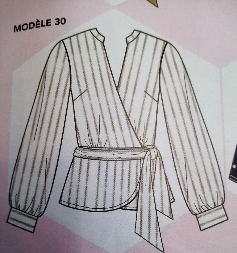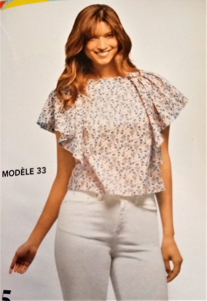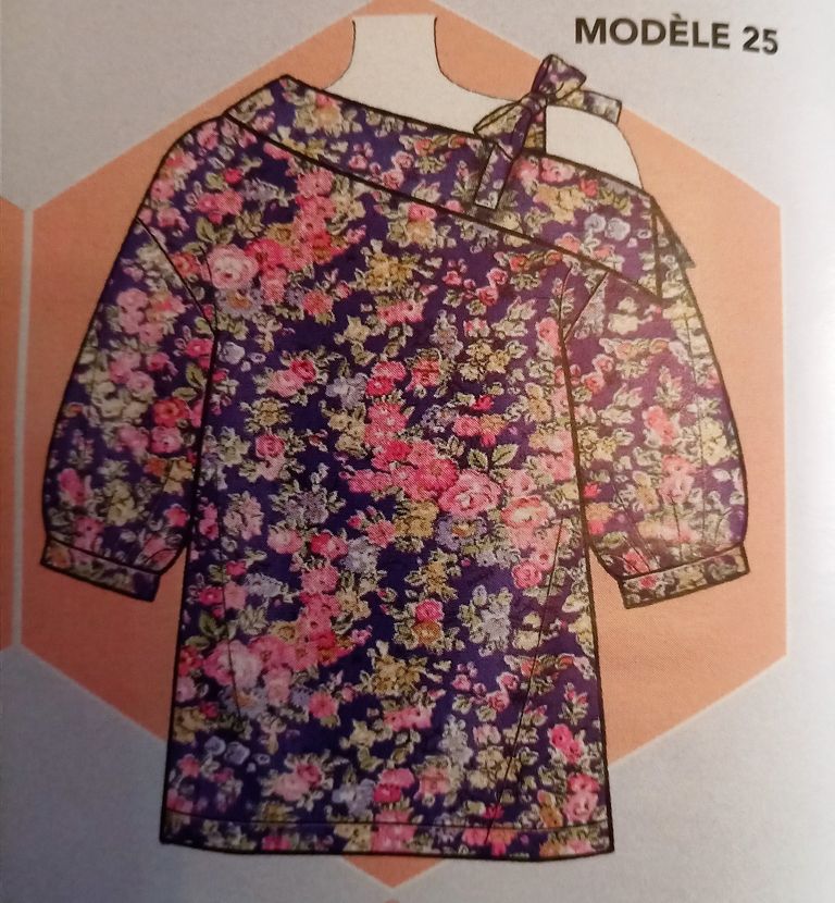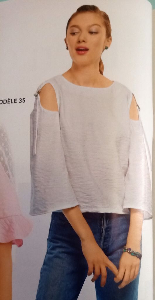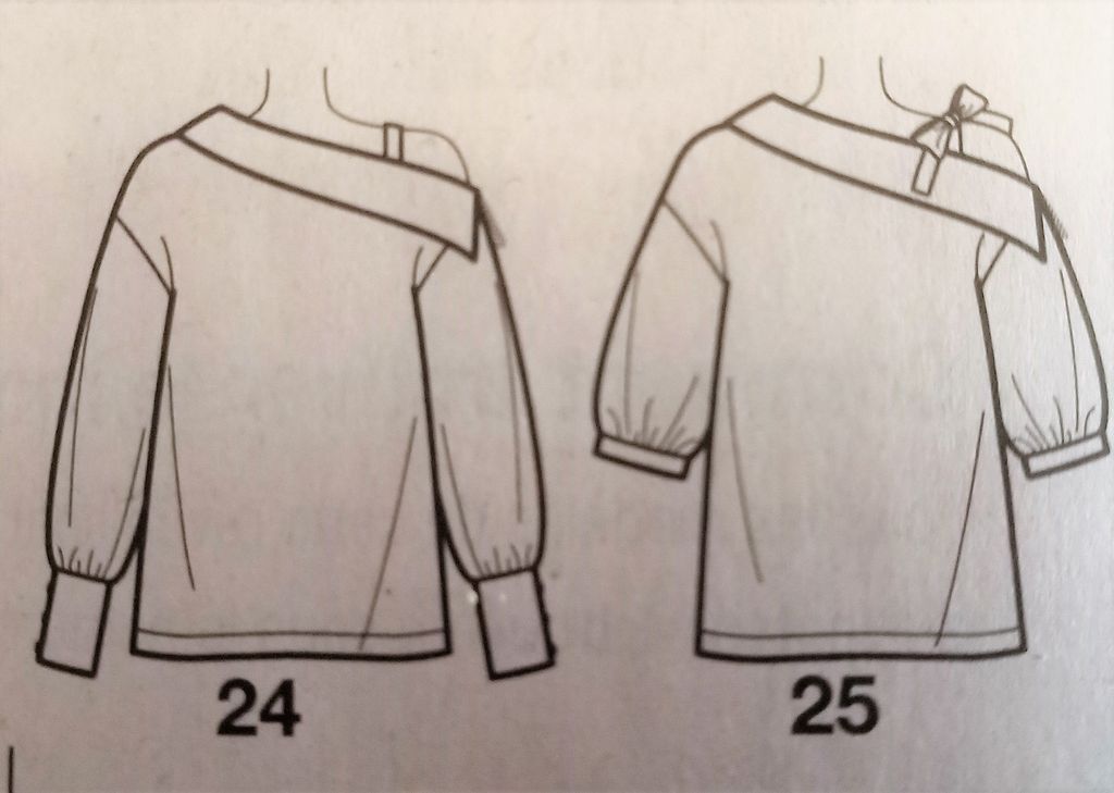 J’adore ce mix entre une chemise et un top. En effet une épaule est entièrement dégagée, avec un petit lien ou une bretelle à nouer, mais surtout elle est ornée d’un grand col asymétrique. La couture de manche est basse, sur des manches longues terminées par des poignets haut. Pour la version manches courtes, elles sont resserrées dans le bas avec un élastique. Ces deux pièces vont du 38 au 48.
