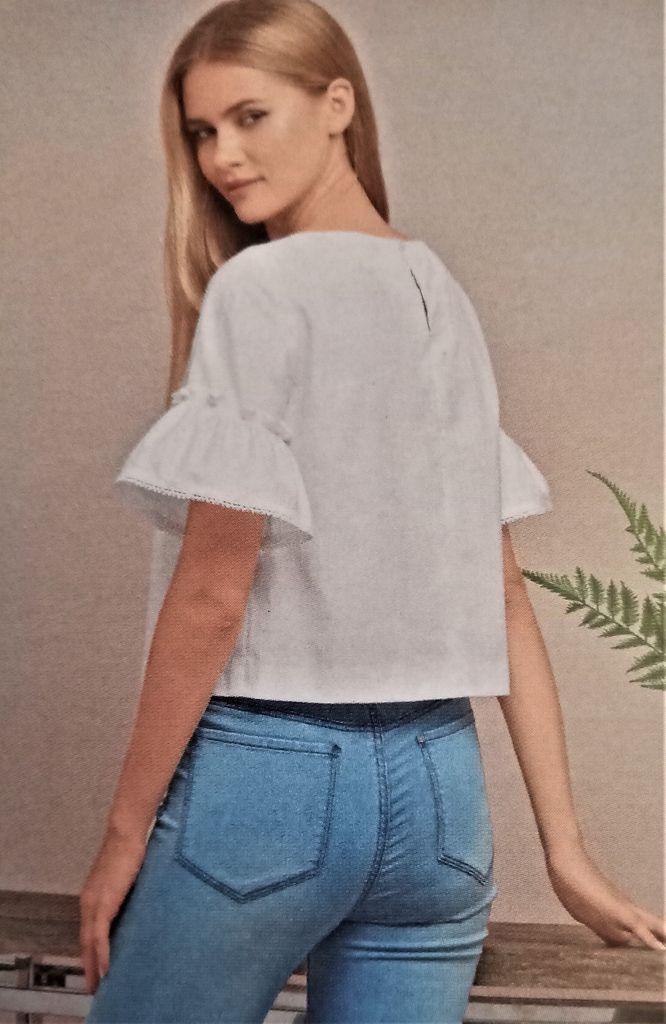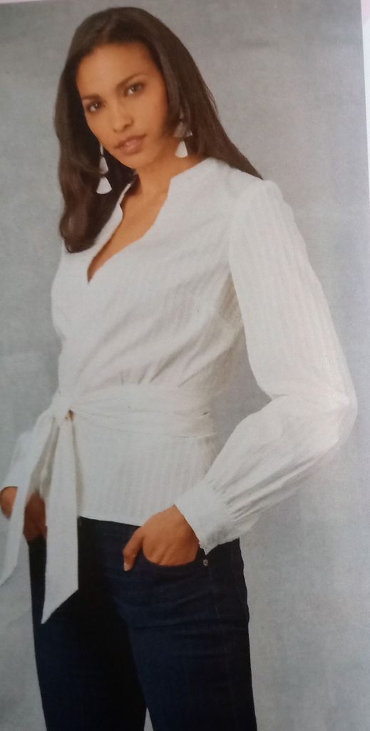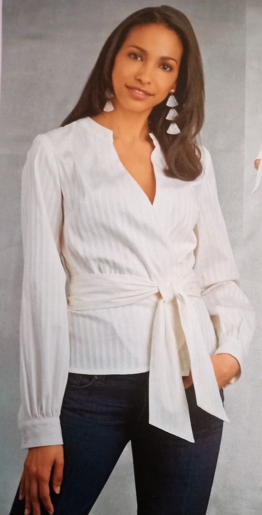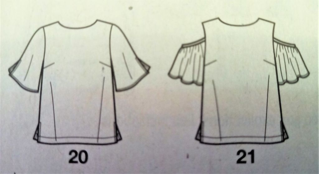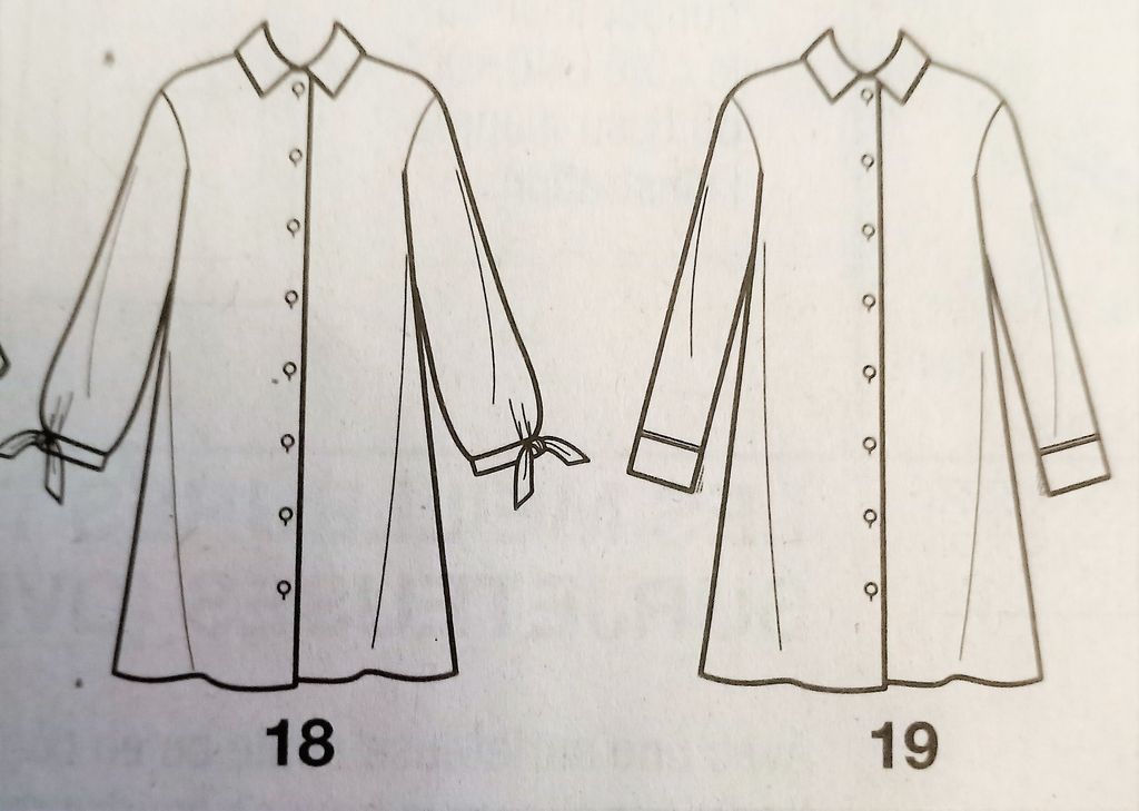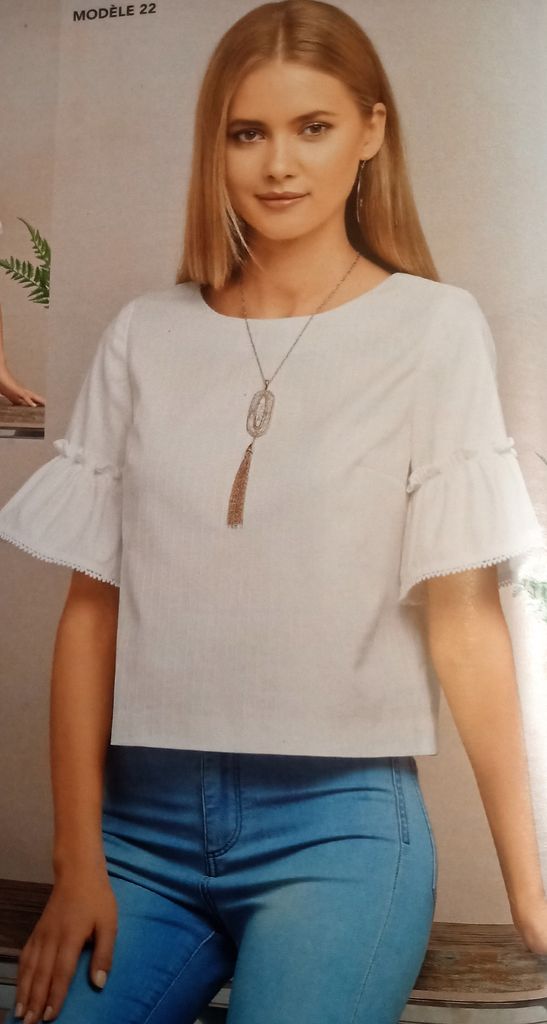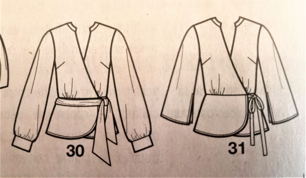 J’adore ce mix entre une chemise et un top. En effet une épaule est entièrement dégagée, avec un petit lien ou une bretelle à nouer, mais surtout elle est ornée d’un grand col asymétrique. La couture de manche est basse, sur des manches longues terminées par des poignets haut. Pour la version manches courtes, elles sont resserrées dans le bas avec un élastique. Ces deux pièces vont du 38 au 48.