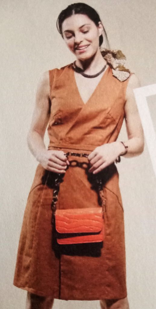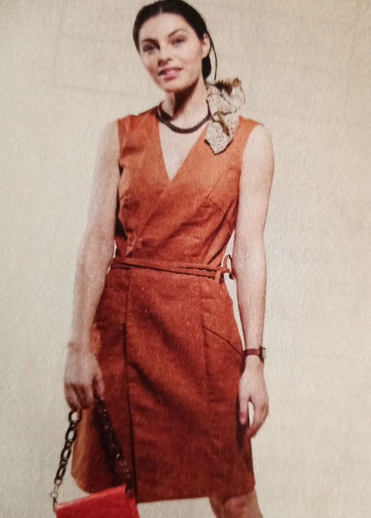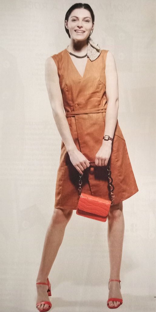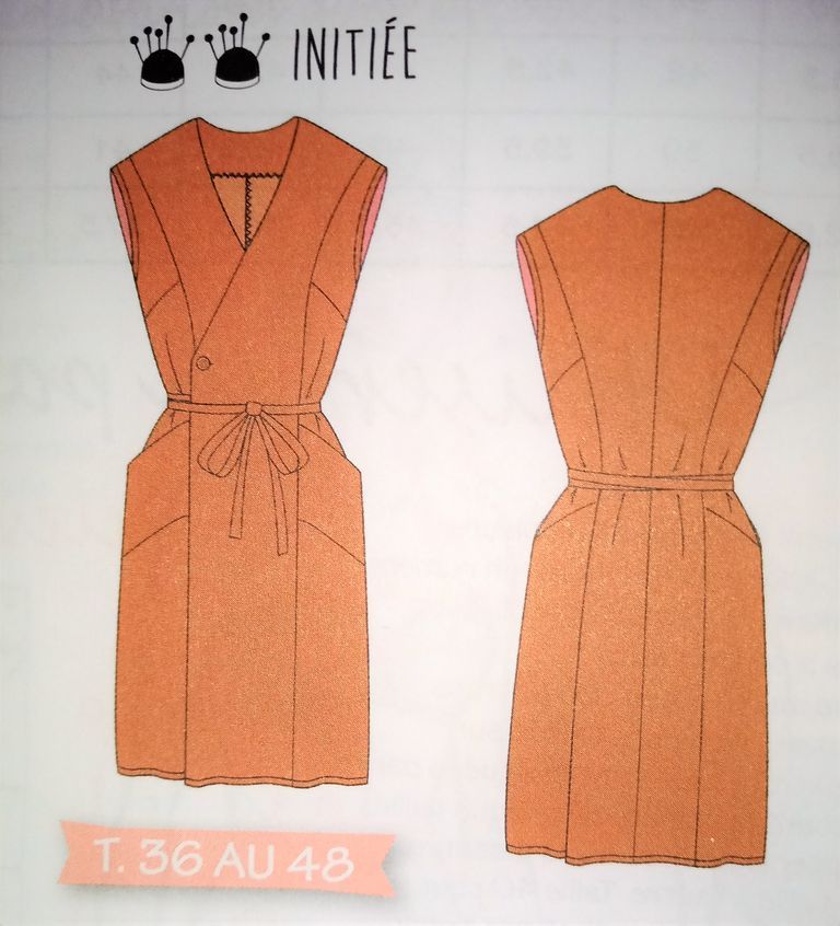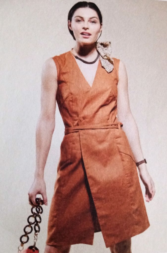 Voici mon premier coup de cœur, une robe, histoire de changer un peu. Elle est garnie de découpes transversales, qui cachet des poches sur la jupe. Mais aussi des découpe verticale qui épousent les forme de la silhouette. La robe sans manches est croisée sur le devant. Une ceinture double à nouer marque la taille.