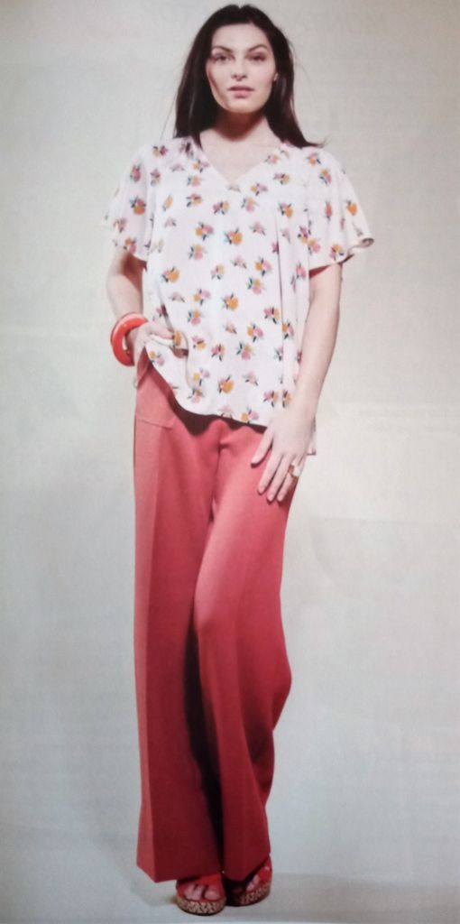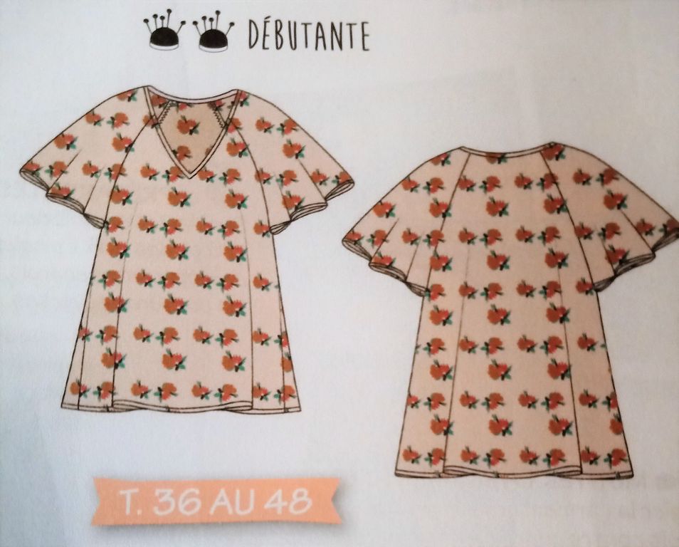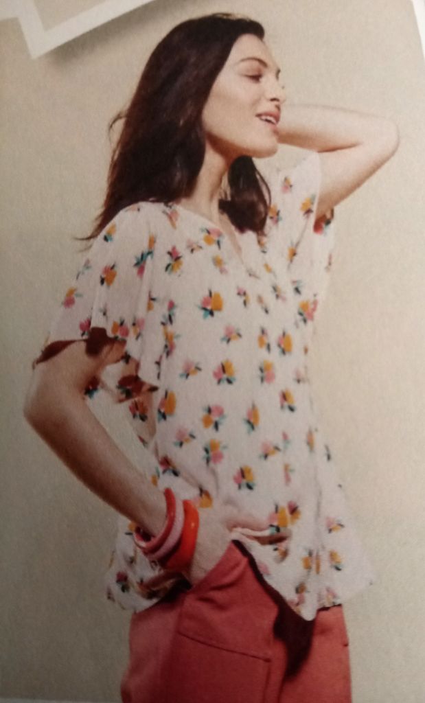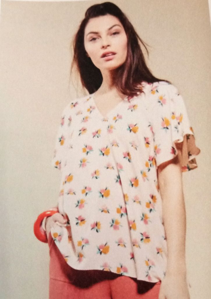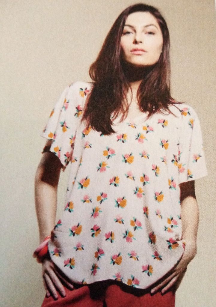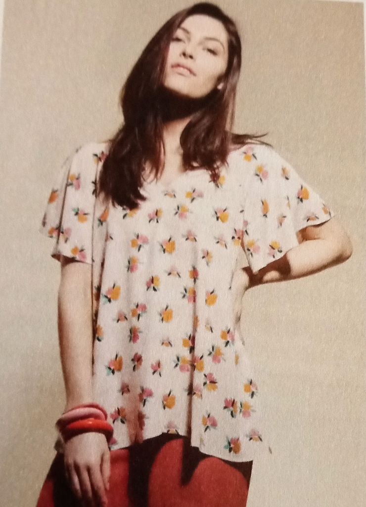 Au moment ou j’écris ces mots, je porte un haut similaire à celui-ci. Son encolure est en V. Les manches sont de forme papillons et raglans. Le corps de cette tunique est évasé. C’est une pièce confortable!