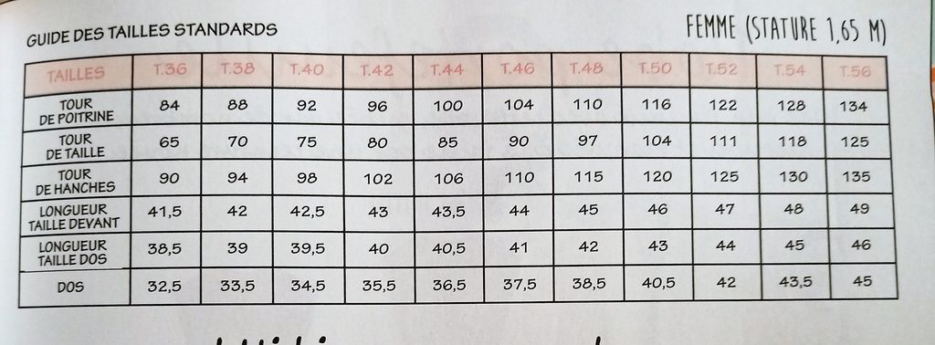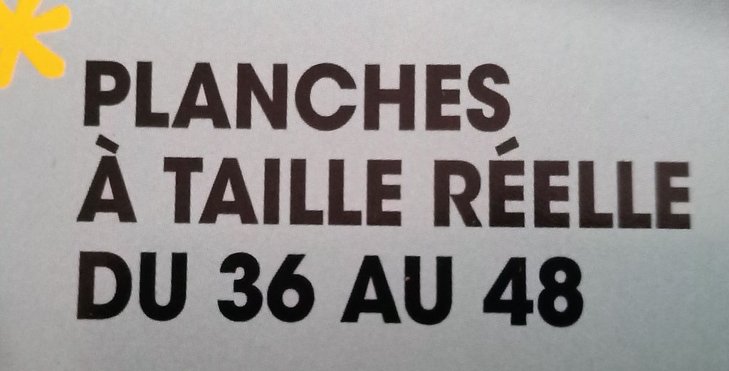 Vous allez me dire des planches à tailles réelles, c’est normal! Pourquoi se sentir obligé de l’indiquer sur la couverture, c’est quelque chose que je ne comprends pas. Cependant tous les patrons vont du 36 au 48. Dommage que les tailles n’aillent pas au delà du 48.