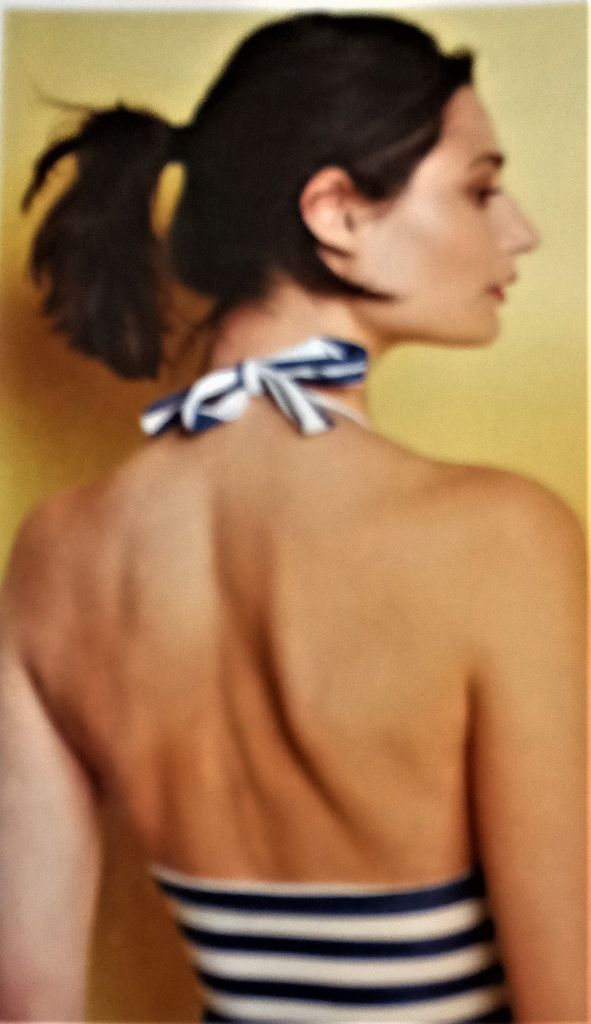 J’adore ce maillot de bain à col licou, je lui trouve un petit côté rétro très sympa. Il s’agit d’un modèle une pièce. Les rubans de coté sur les bonnets permettent de l’attacher dans le coup pour avoir un joli dos nu! Les bonnets sont froncés sous la poitrine pour l’ampleur. Je le verrais bien en version deux pièces. Il va de la taille 34 au 56.