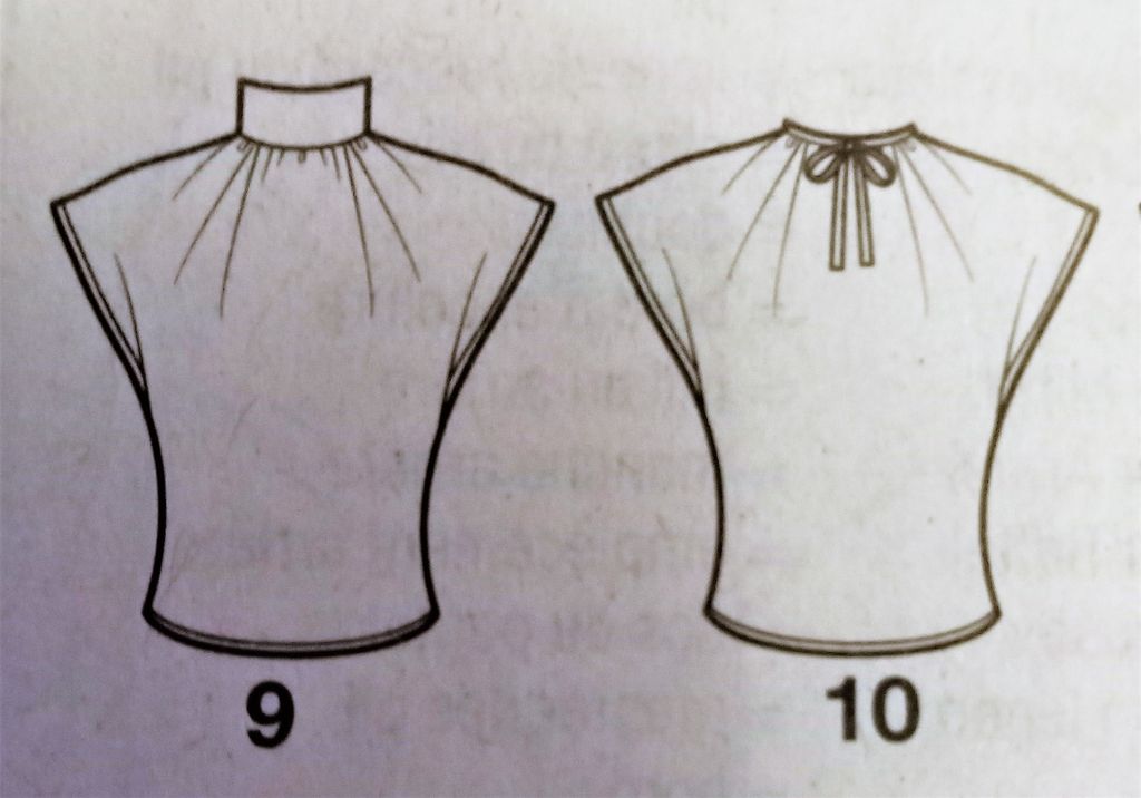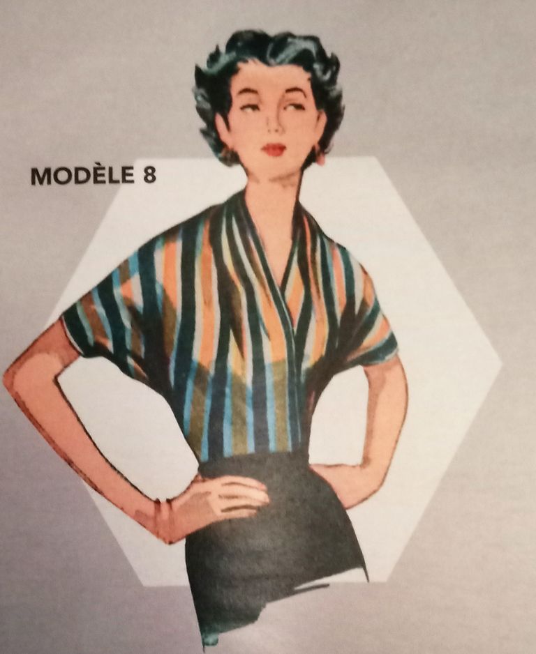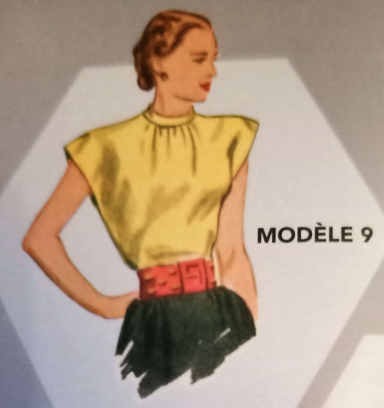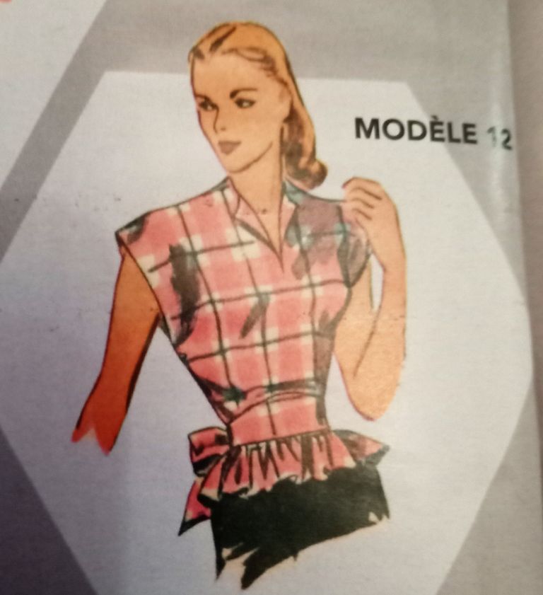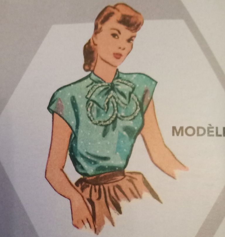 Voici deux blouses qui partent d’une même base, inspirée elles aussi des années 40/50, elle est déclinée en différents modèles. J’aime beaucoup le modèle à basque et encolure ouverte ainsi que que celle avec le gros nœud bordé de dentelle autour du cou.