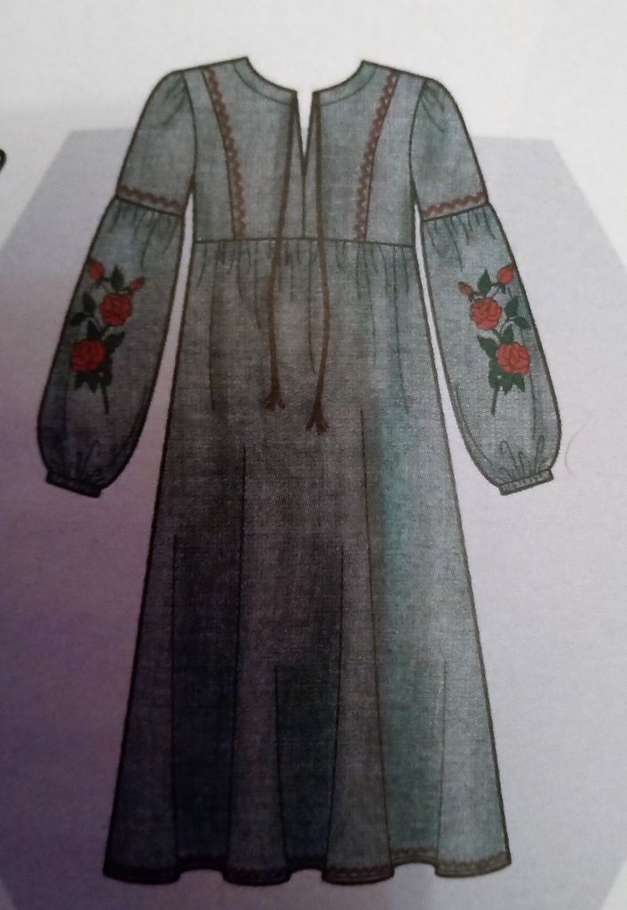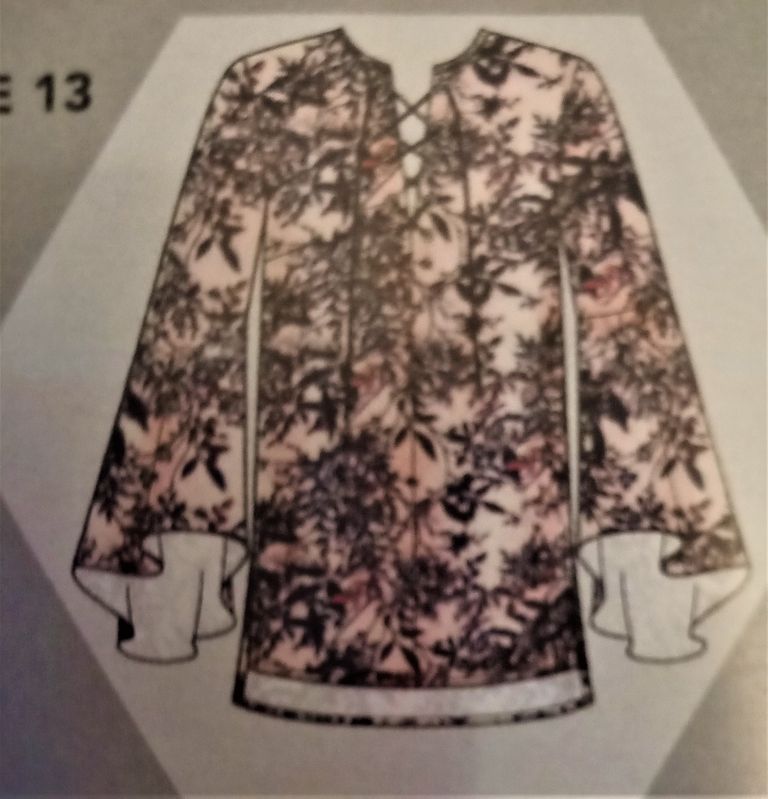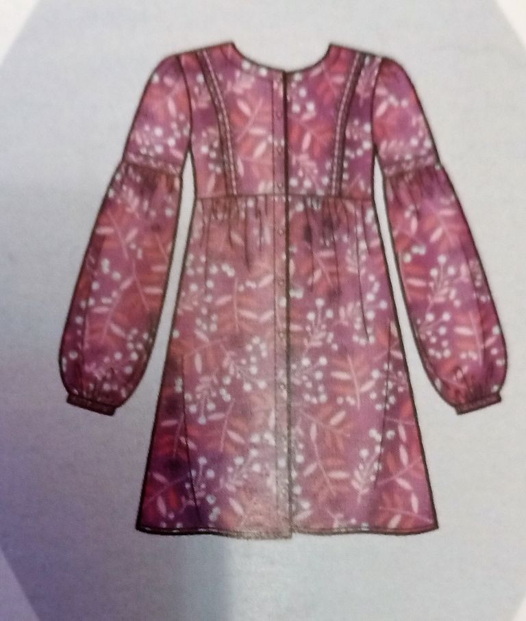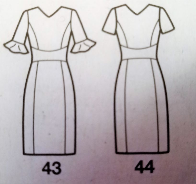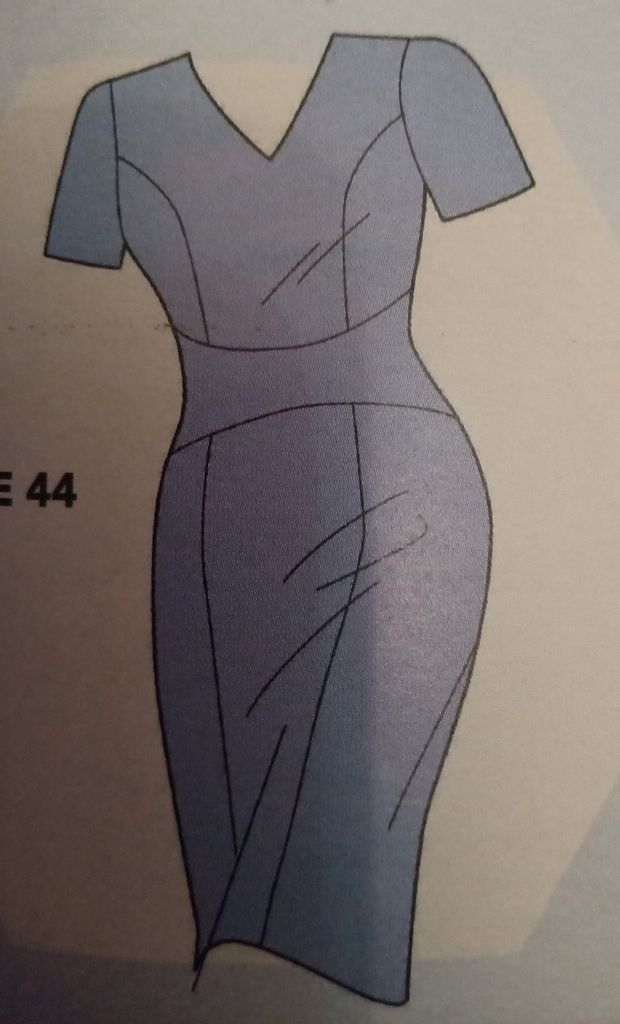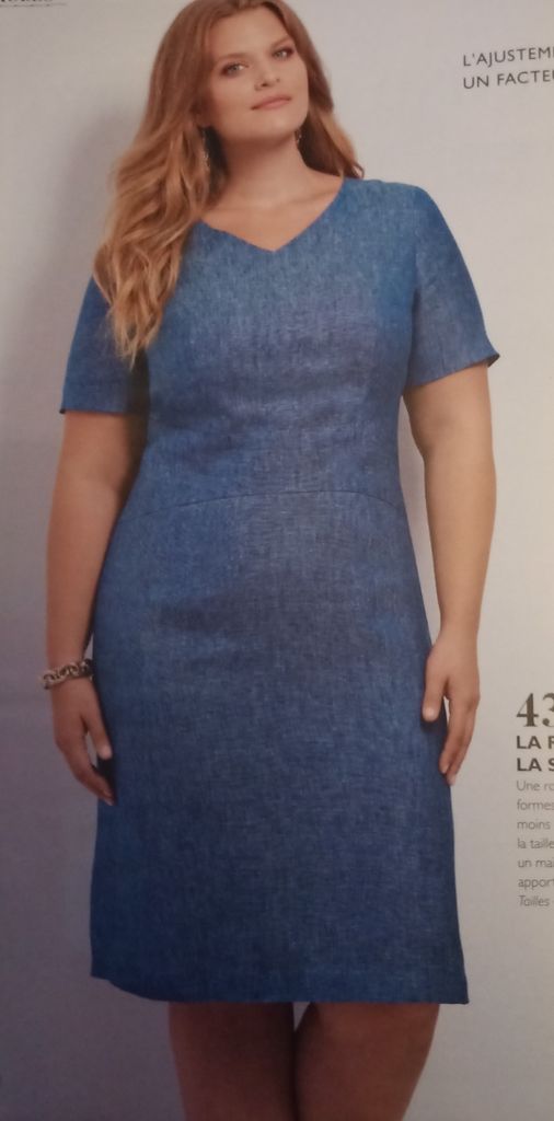 Mon dernier coup de cœur est pour cette robe qui va du 46 au 56. L’encolure est en V. Le buste est ajusté à l’aide de découpes. La taille est marqué par un emplacement arrondi. Concernant la jupe elle est droite avec des panneaux dans le prolongement des découpes du haut.