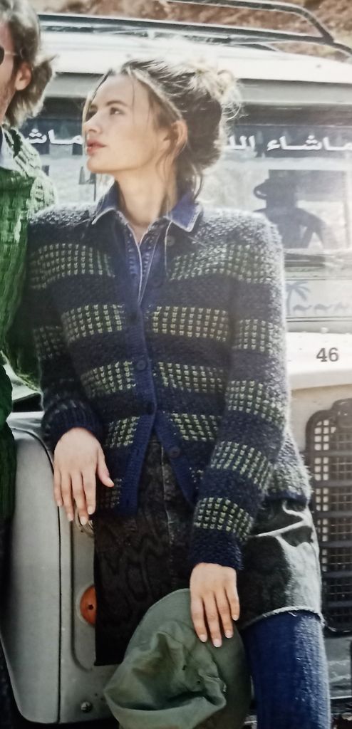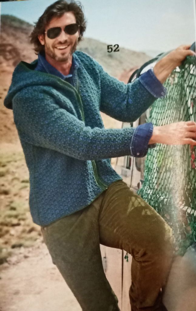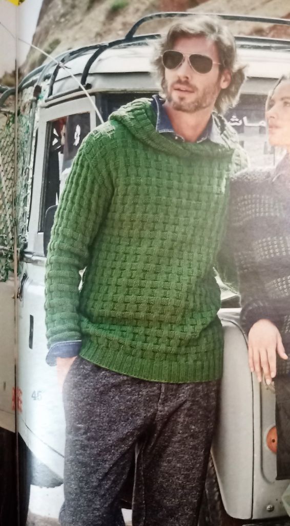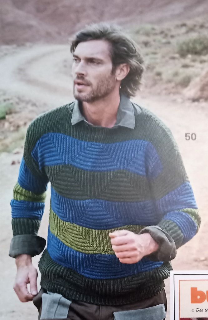 Dernier coup de cœur, encore un modèle pour homme. Je trouve magnifique sur un homme, car généralement on tricote peu pour eux! Alors si ils le mettent c’est génial. Ici les modèles devraient plaire aux hommes de vie. Ce pull rayé vient conclure en beauté mon top, avec ses motifs triangulaires structurés. Il est en taille 48/50.