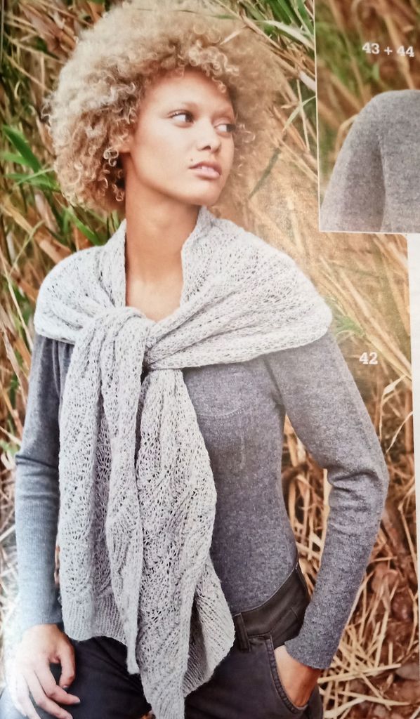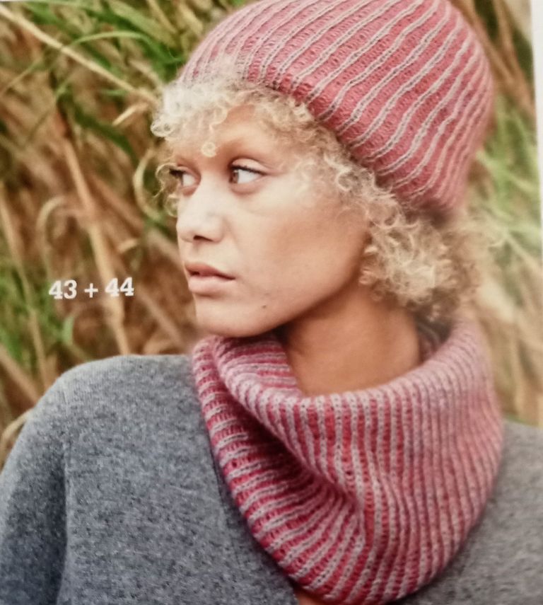 J’ai ri quand j’ai vu cet ensemble snood ou cache cou, vous savez pourquoi car j’en ai un similaire sur mon tricotin! Ils sont simple et efficaces, mais toujours élégants! Il s’agit bien entendu d’une taille unique. Et je crois que c’est le seul modèles que je saurais tricoter dans la revue.