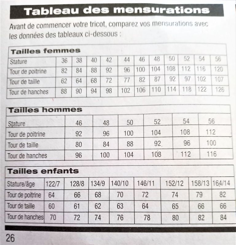 Le tableau des tailles