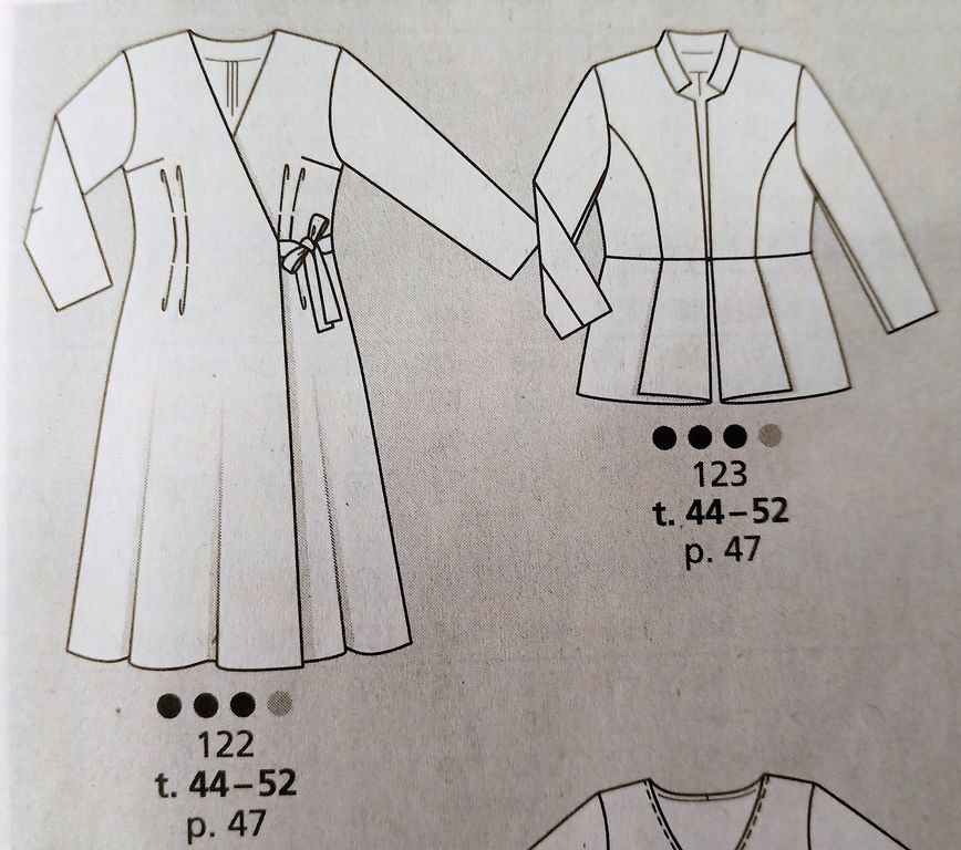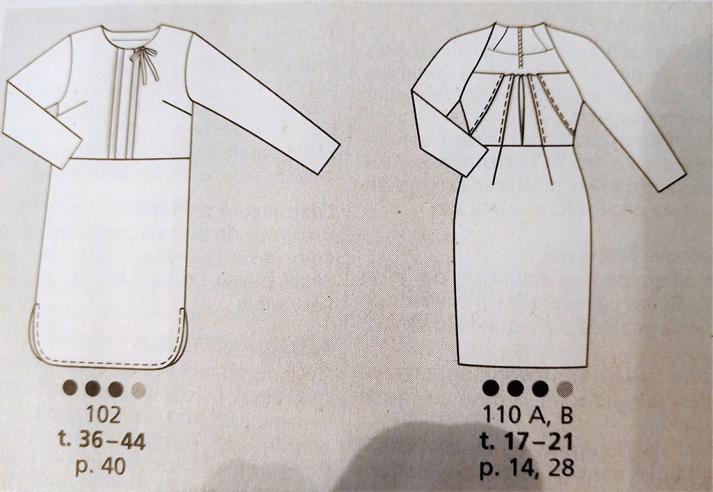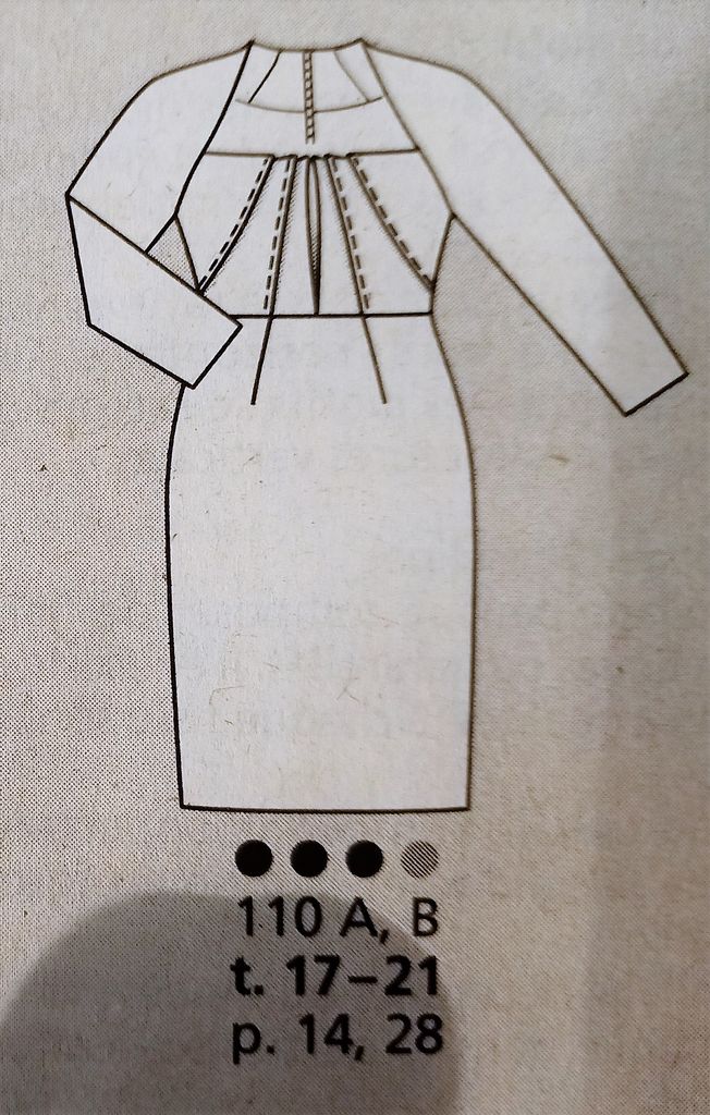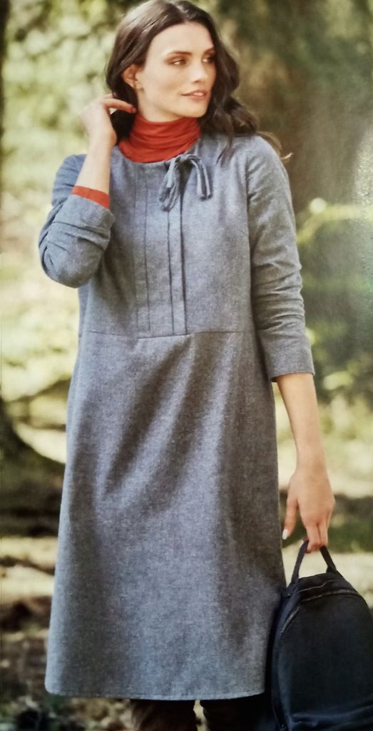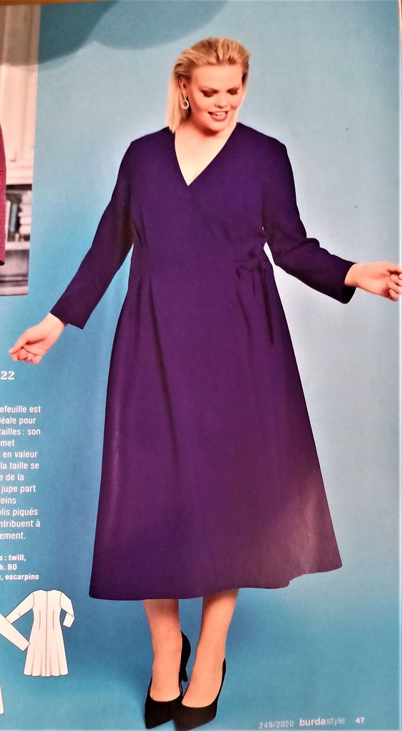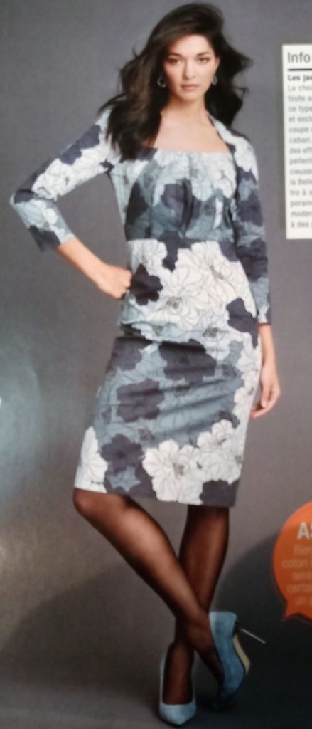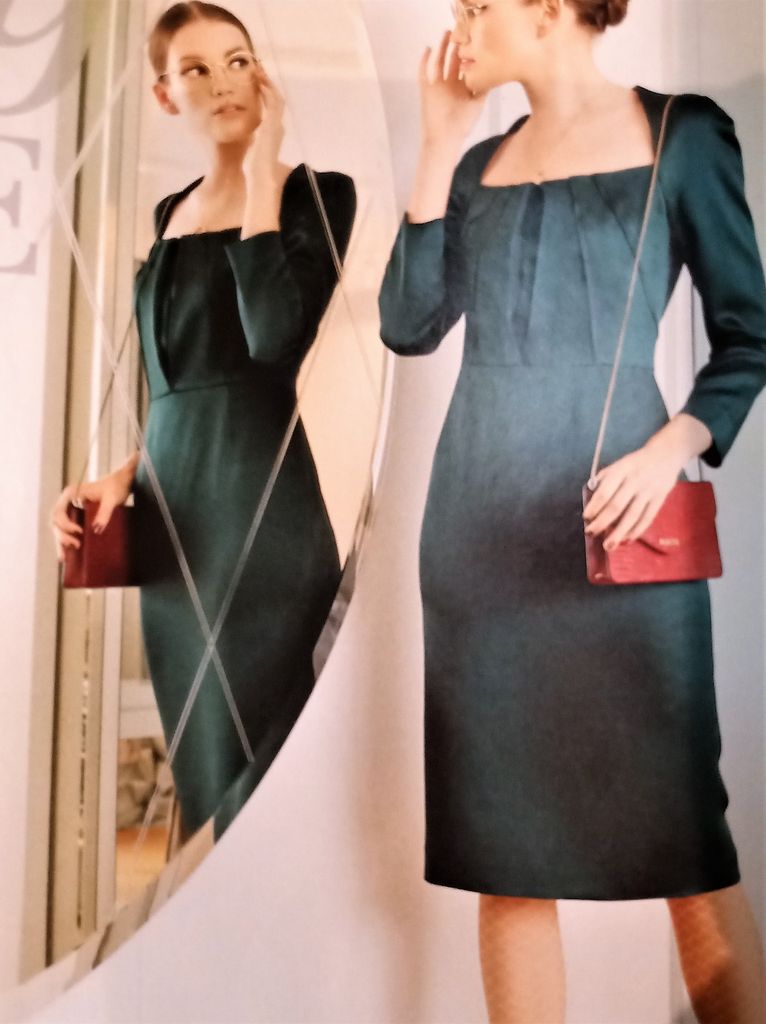 Seule robe de mes coups de cœur. C’est son originalité qui m’a séduit sur le buste particulièrement est le jeu de découpes et de plis surpiqués. Le tout sur un grand décolleté trapèze. Les manches longue sont de forme raglans. La jupe est de forme fourreau. La robe se ferme dans le dos à l’aide d’une fermeture à glissière invisible. Elle va de la taille 17 au 21.