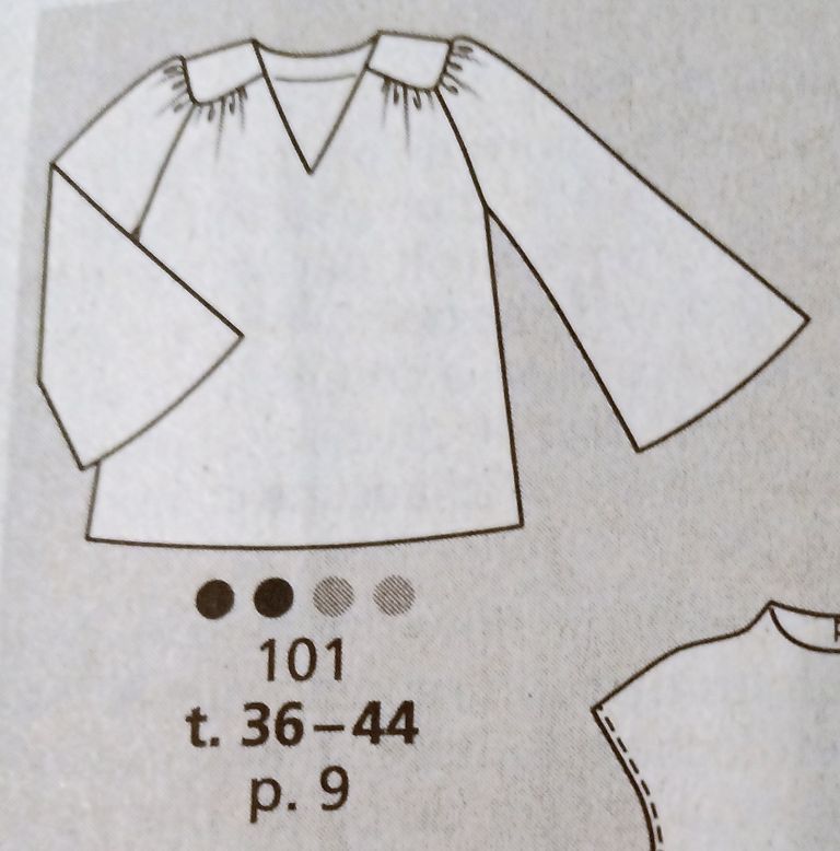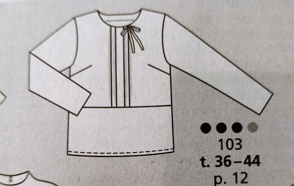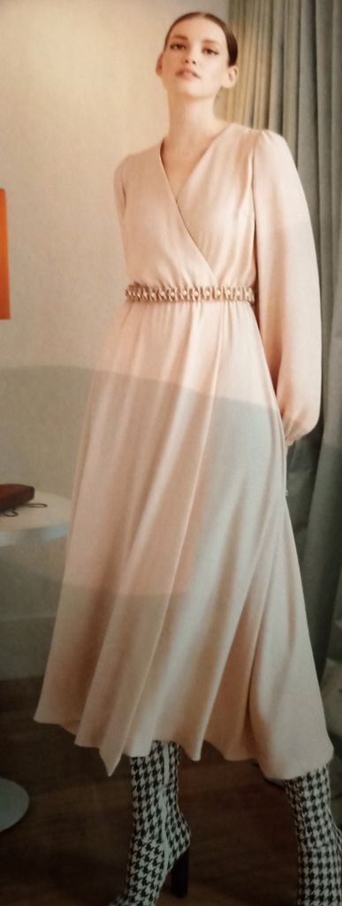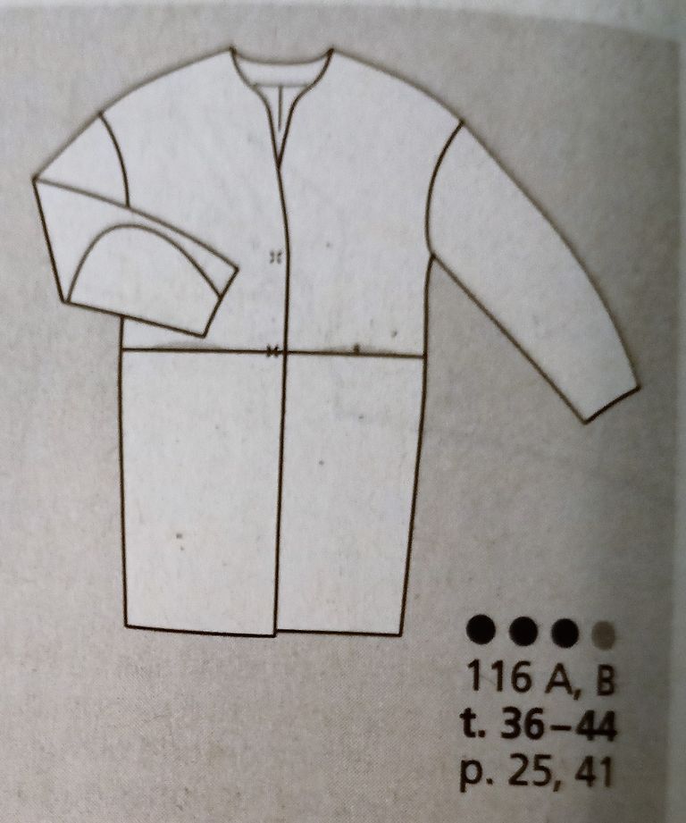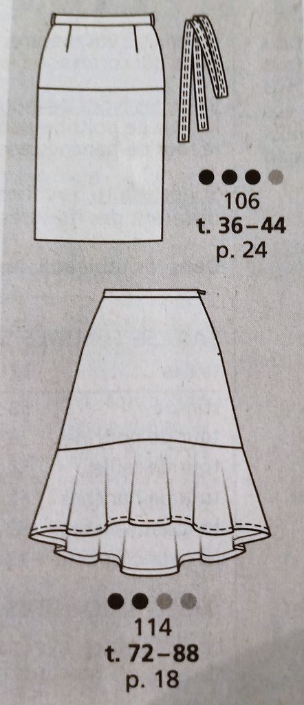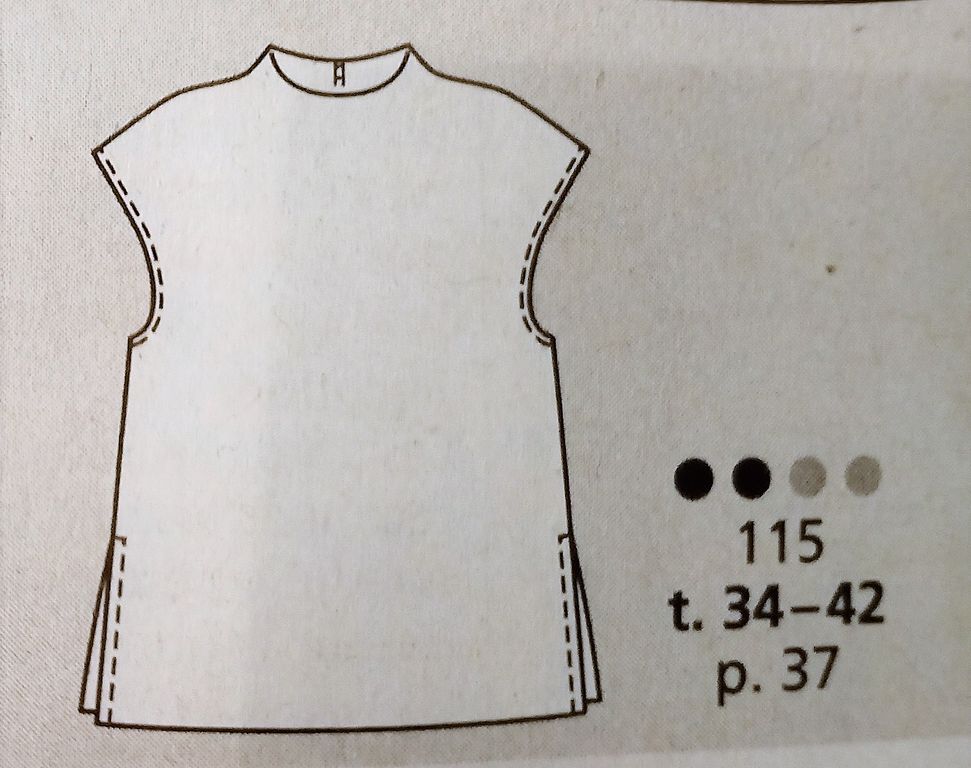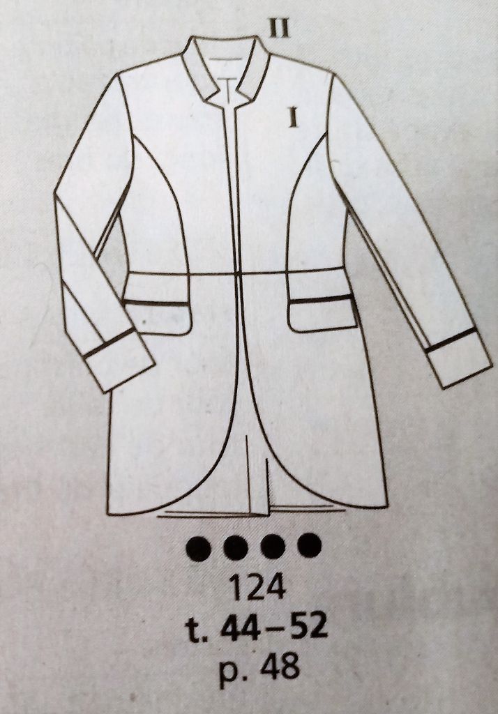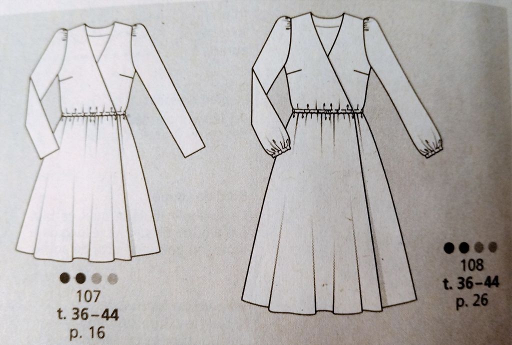 Seule robe de mes coups de cœur. C’est son originalité qui m’a séduit sur le buste particulièrement est le jeu de découpes et de plis surpiqués. Le tout sur un grand décolleté trapèze. Les manches longue sont de forme raglans. La jupe est de forme fourreau. La robe se ferme dans le dos à l’aide d’une fermeture à glissière invisible. Elle va de la taille 17 au 21.