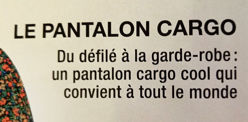 Alors pour moi le pantalon cargo est une « horreur » , c’est comme le jogging. Je n’aime pas cette pièce, même si on le coud dans du satin, je n’accroche pas. Je trouve que ce modèle ne convient pas à tout le monde bien au contraire. Il ne faut pas rajouter du volume sur les côtés avec des poches qui ne serviront jamais! Heu….. Je suis peut être excessive. Il en faut pour tous les gouts! Heureusement, car le monde de la mode serait bien triste si tout était uniformisé!