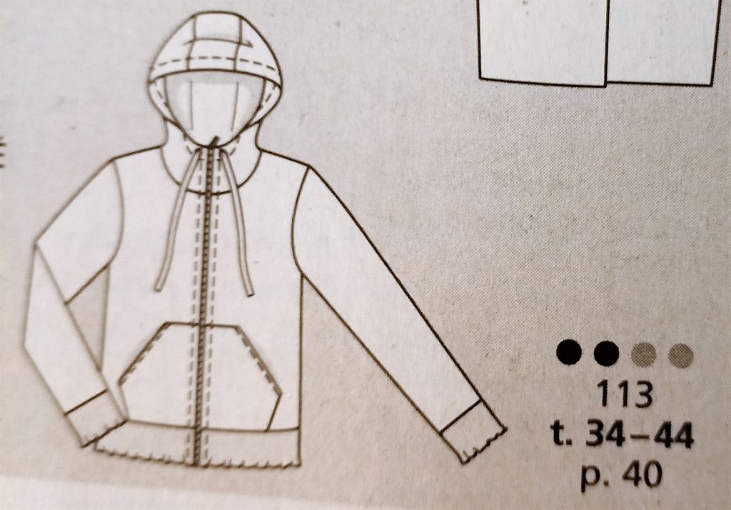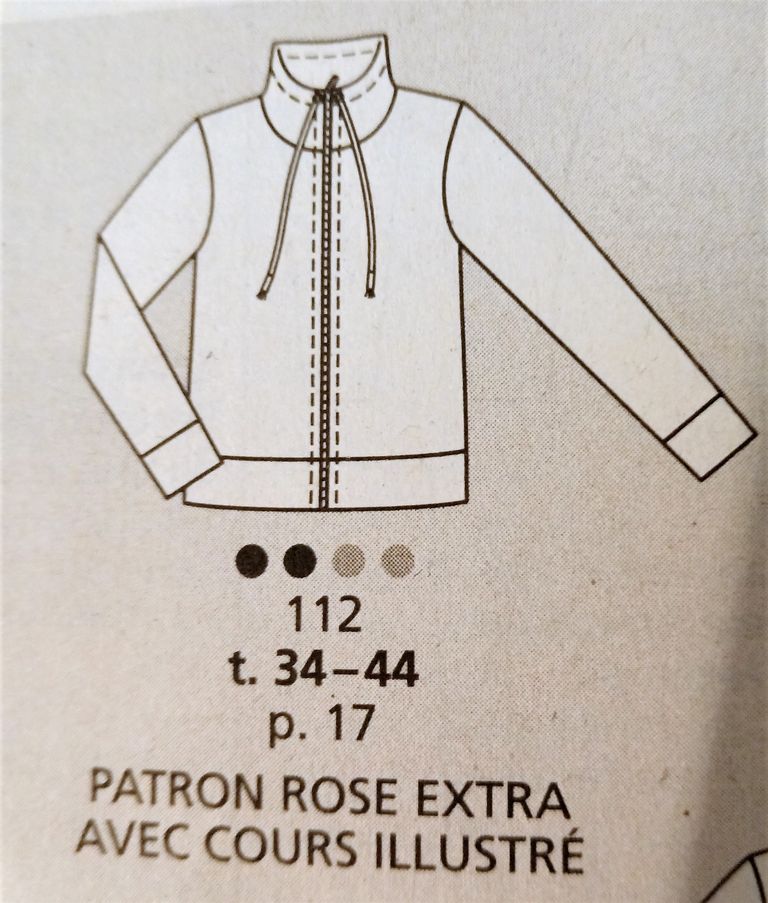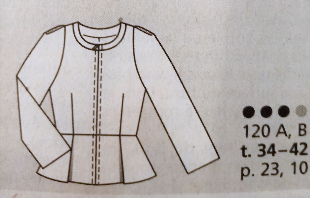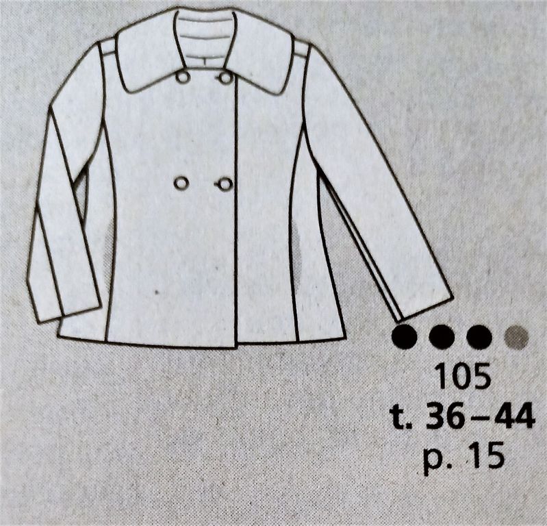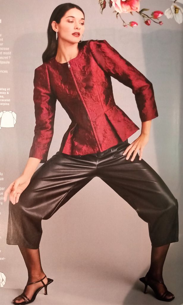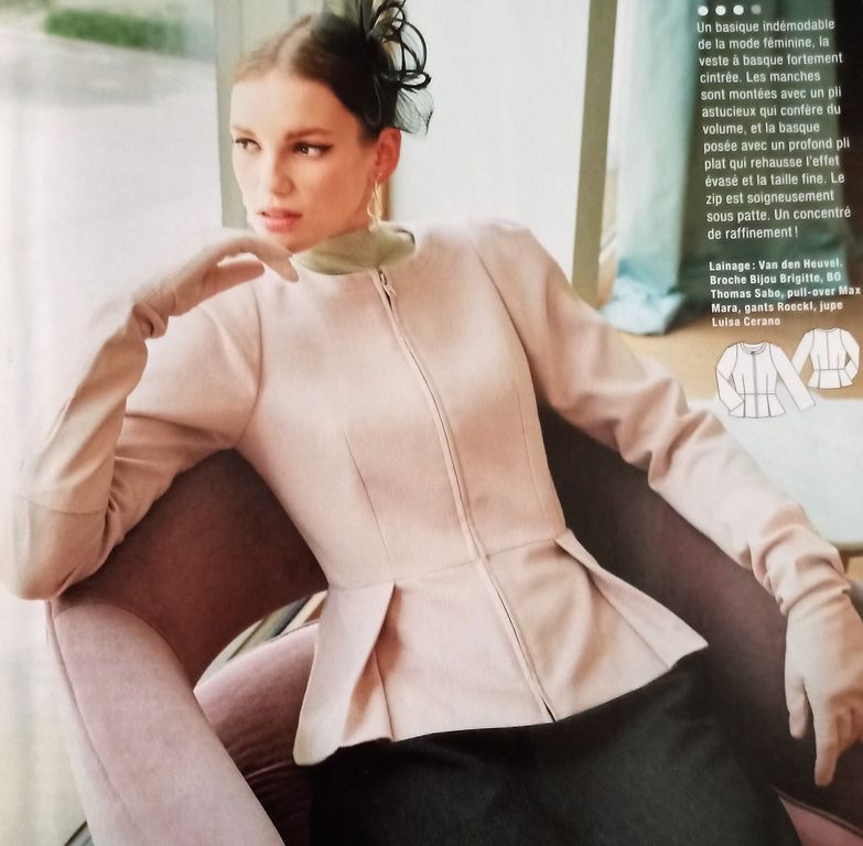 Mon premier coup de cœur est pour cette petite veste! Elle se ferme à l’aide d’une fermeture à glissière et possède un col rond avec un empiècement cousu. Les manche longues sont garnies d’un plis sur la tête de manche. La veste à un effet taille de guêpe avec ses pinces, mais aussi la taille marquée par une couture, ainsi que la basque attenante avec ses deux plis. Elle va de la taille 34 au 42.