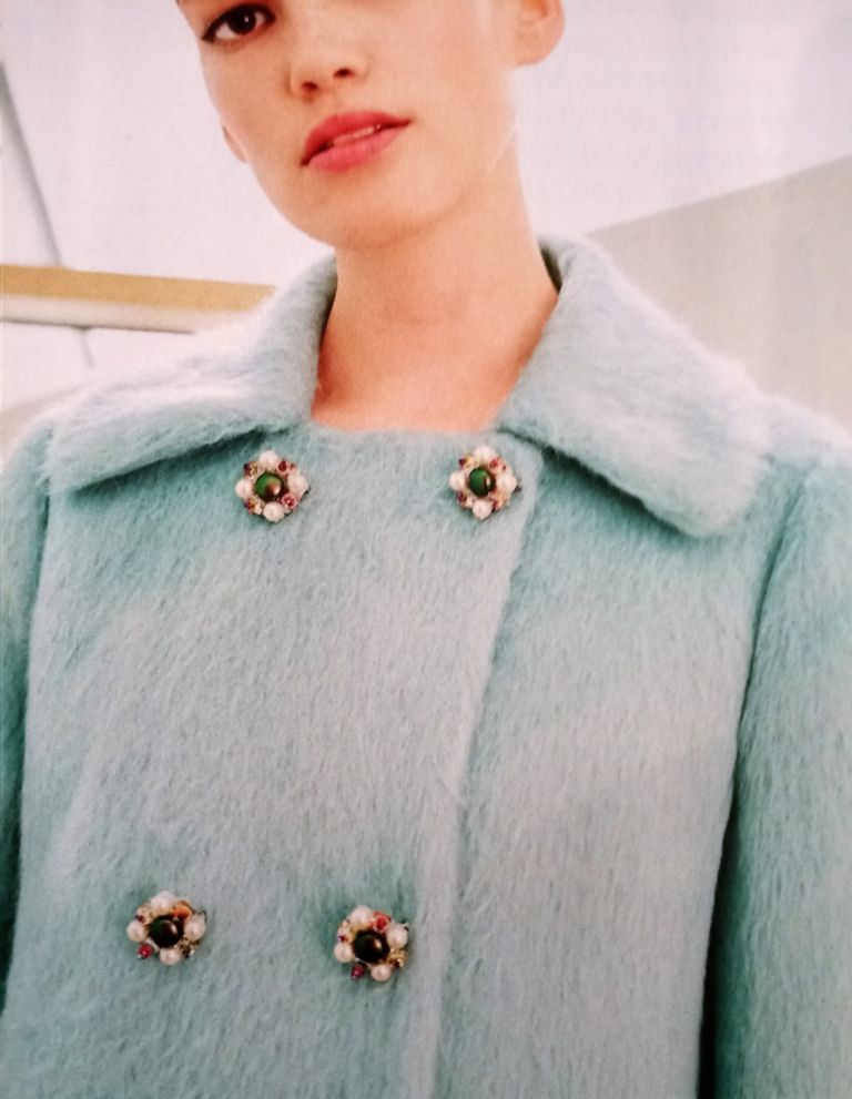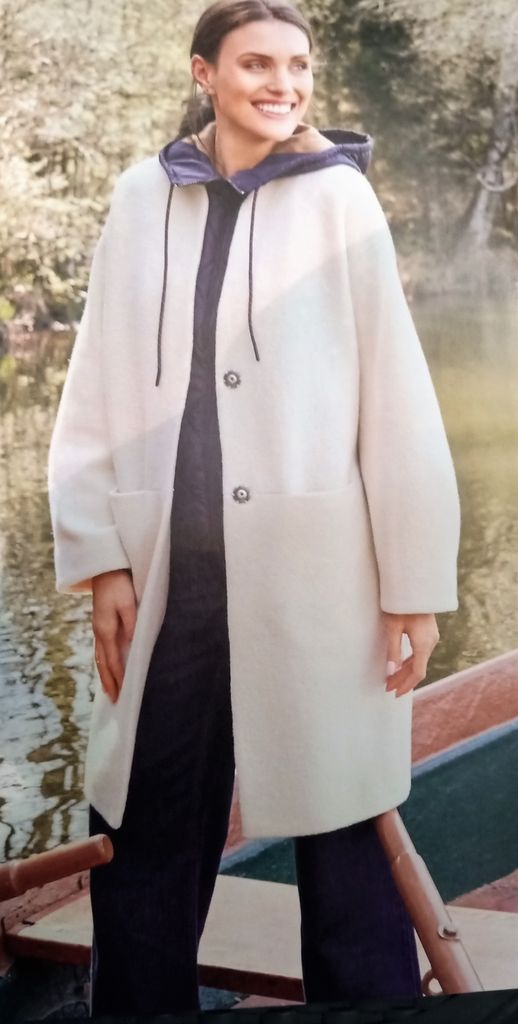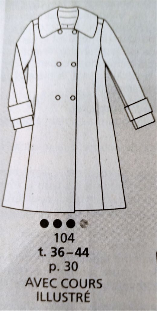 Dernier de mon top pour ce manteau rétro évasé. Il est croisé avec un double boutonnage, sur un grand col plat. Le devant possède des découpes verticales avec des poches prises dans la couture. Les manches sont garnies d’une large bande au dessus du poignet. Dans le dos une grande martingale ajoute une touche raffinée. Il va de la taille 36 au 44.