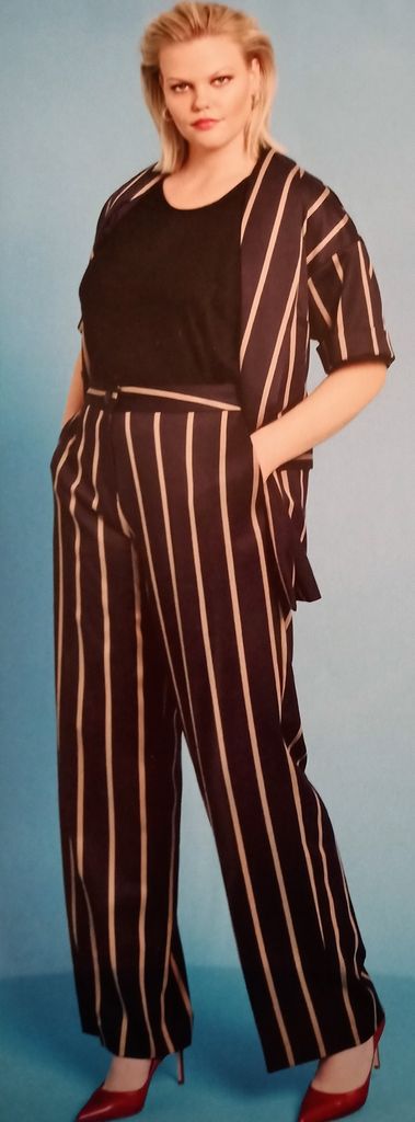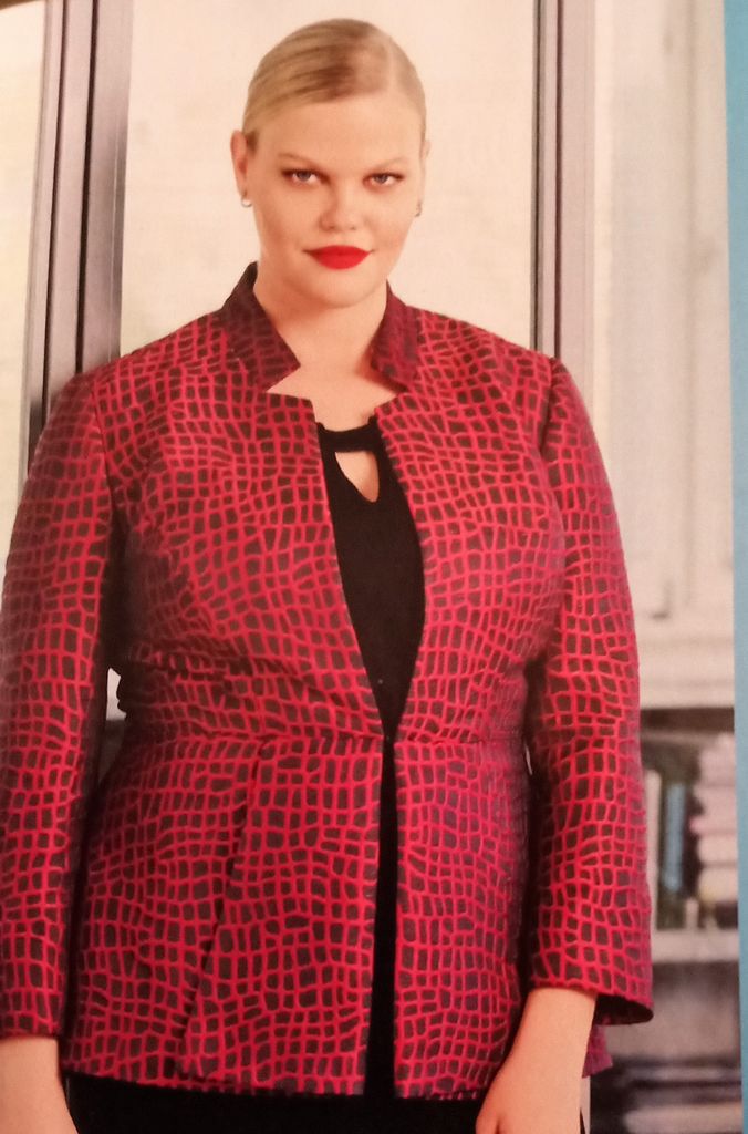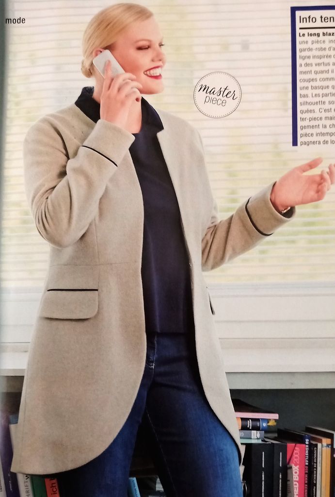 Unique coup de cœur en grandes tailles est un blazer c’est assez rare!Le devant est arrondi dans le bas. Le haut est agrémenté de découpes princesse qui se prolonge sur le bas avec des poches passepoilées à rabat. Le col est façon col cassé. Les manches tailleur sont terminées par une bande faisant poignet garnie aussi d’un passepoil. Il va du 44 au 52.
