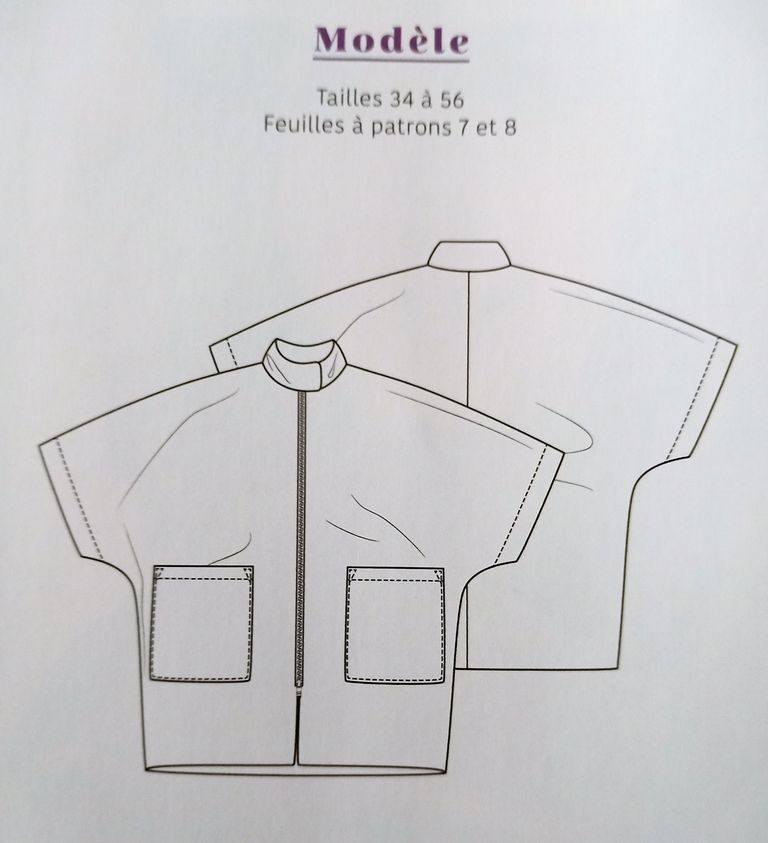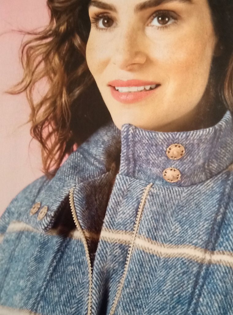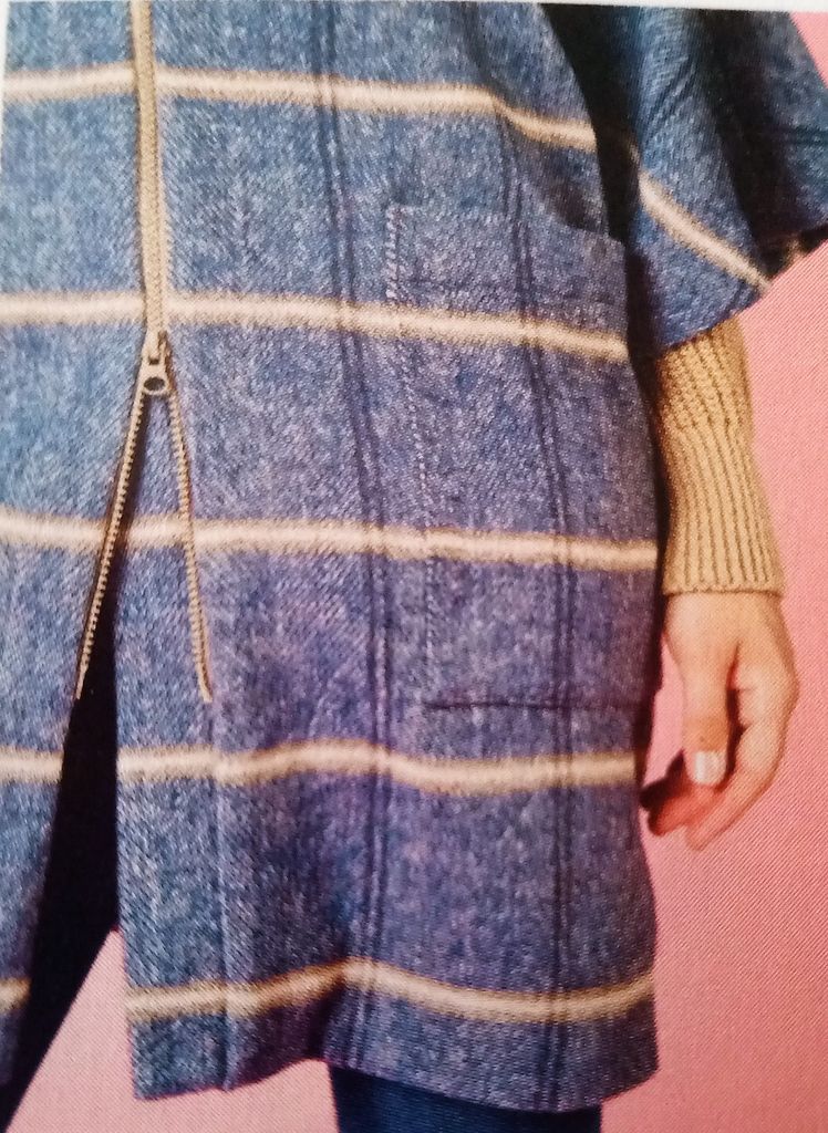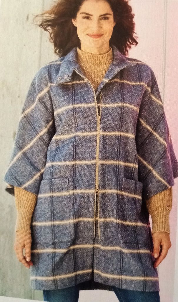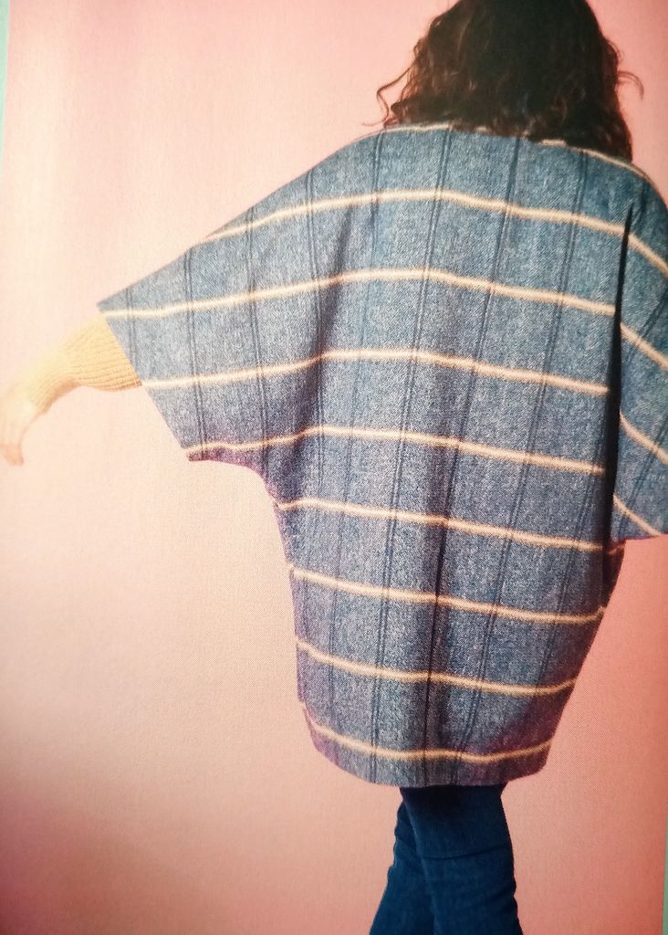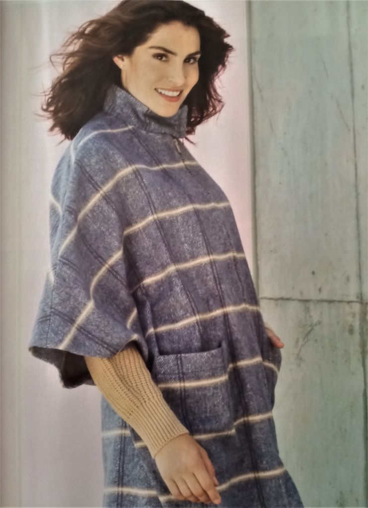 J’ai craqué pour cette cape cosy, d’ailleurs ce n’est pas une cape, elle a des manches courtes. Elle possède un col montant et se ferme à l’aide d’une fermeture à glissière. Deux grandes poches plaquées viennent garnir le devant. Je la verrai bien avec des manches longues rapporté en jersey tubulaire ou lainage contrastant. Avec cette pièce pas de soucis de pull qui coince aux entournures. Elle va de la taille 34 au 56.