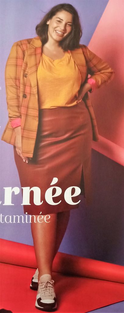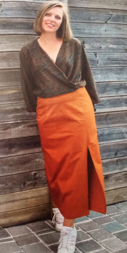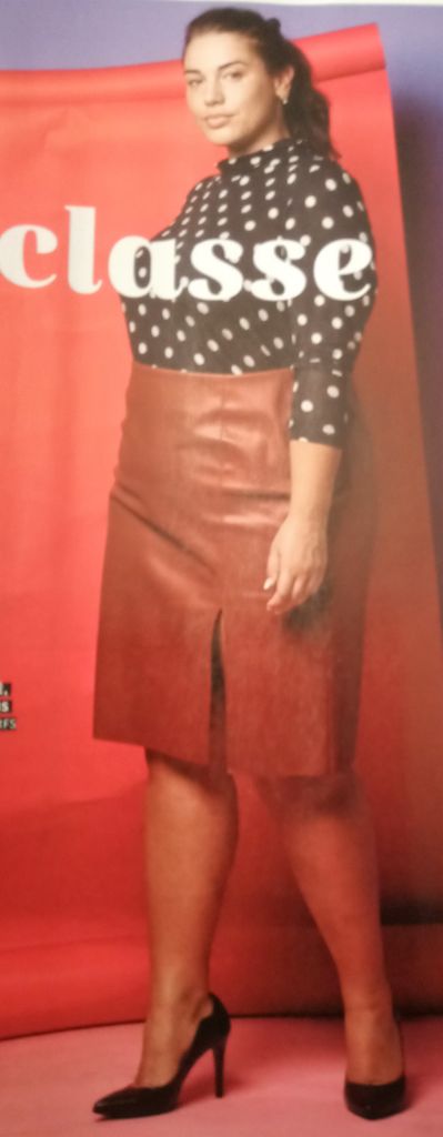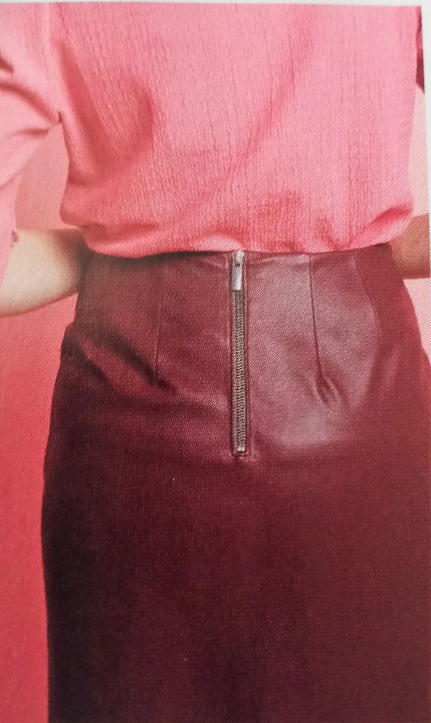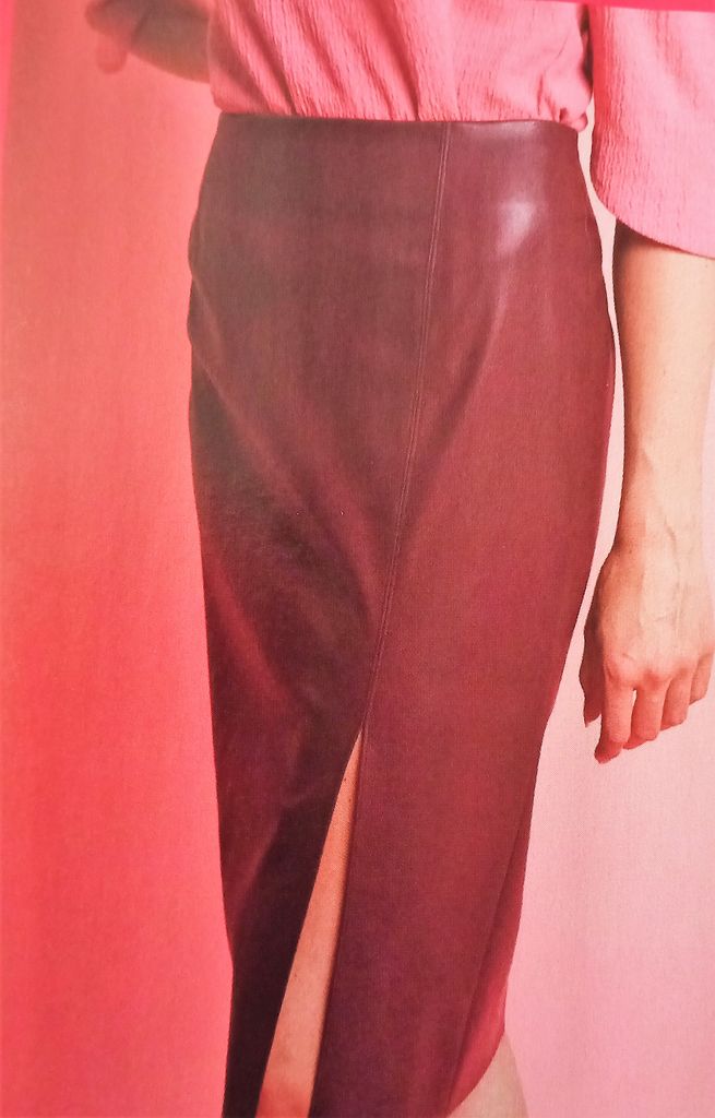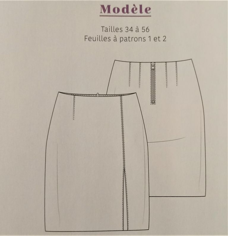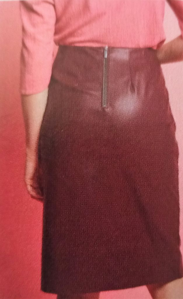 Voici la jupe dites rock’n’roll, réalisé en simili. Je déconseille cette matière pour une jupe, car elle aura tendance à se déformer. Cependant en jean ou tissus d’ameublement, elle se tiendra parfaitement. Il s’agit d’une jupe droite avec une pince devant et une longue fente en lieu et place de la deuxième pince. Le dos est garni lui de deux paires de pince et d’une fermeture à glissière métallisée bien visible. Notez que nous pouvons voir la jupe avec un mannequin grande taille et une petite taille. Elle va de la taille 34 au 56.