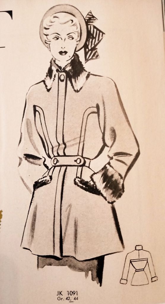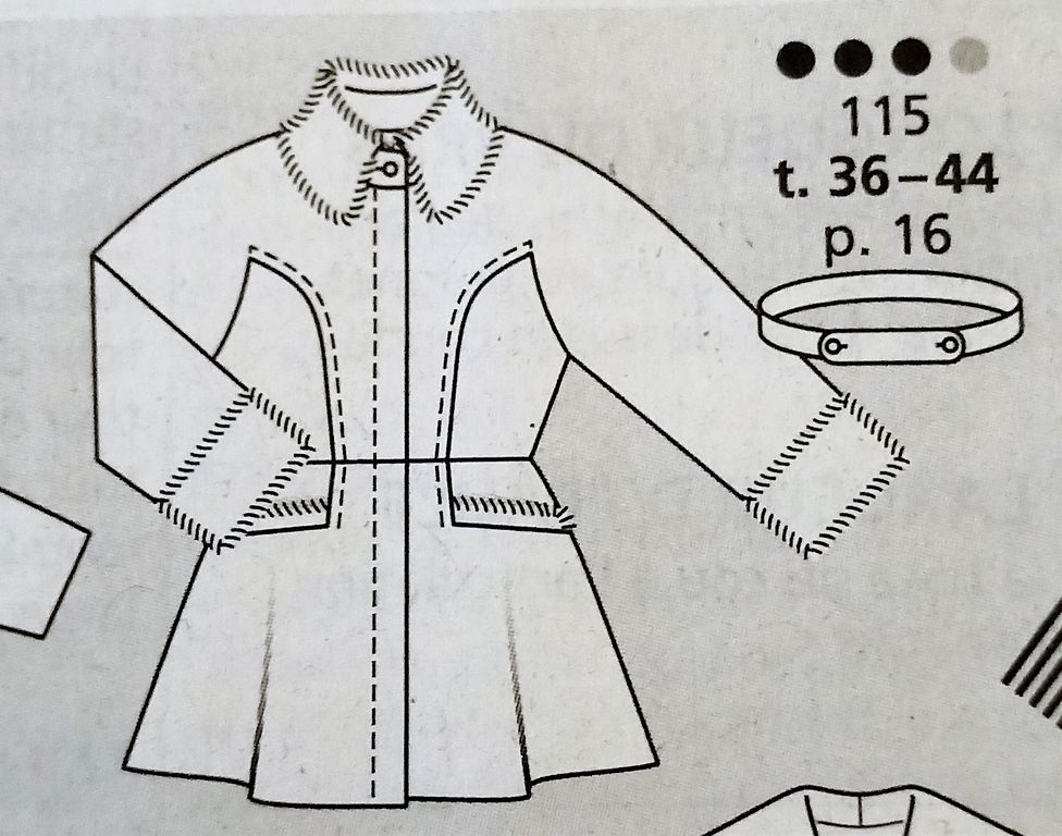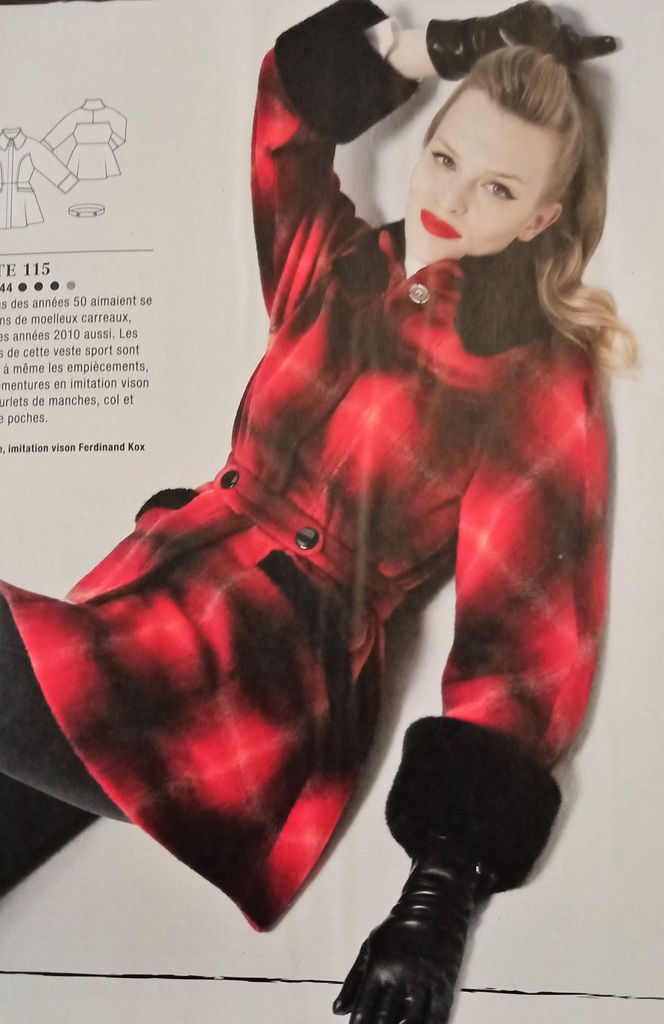 Encore une veste rétro. Les revers de manches et le col sont réalisés en fausse fourrure contrastante. Le buste comporte des manches coupées à même, avec une incrustation de la découpe poitrine surpiquée à distance. La découpe se termine sur la basque évasée avec une poche paysanne. Le col est légèrement montant. La taille est ceinturée. Le modèle dévie un peu de l’original mais en reprend les grandes lignes. La veste va du 36 au 44.