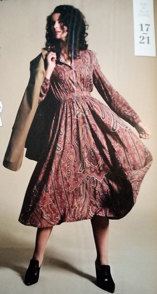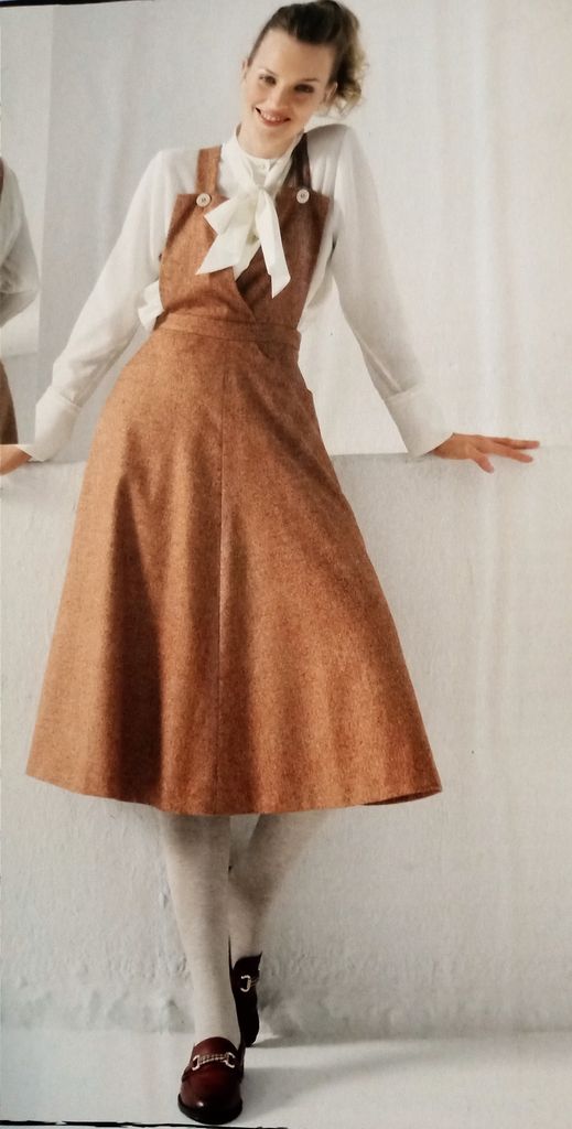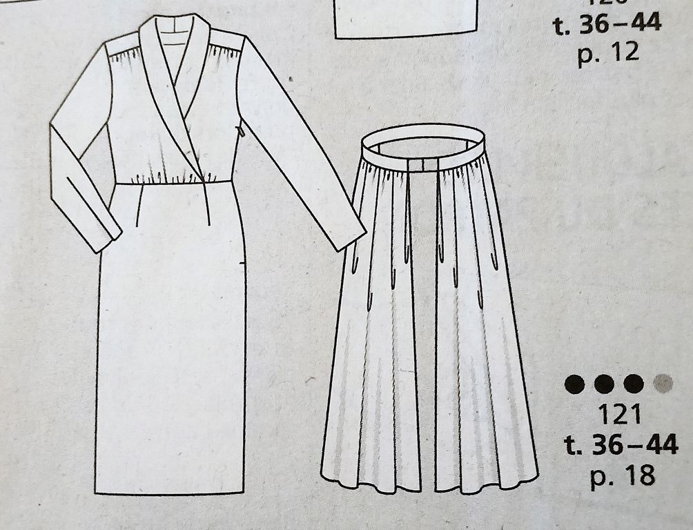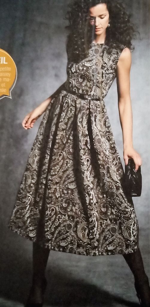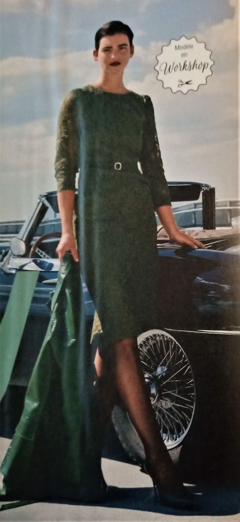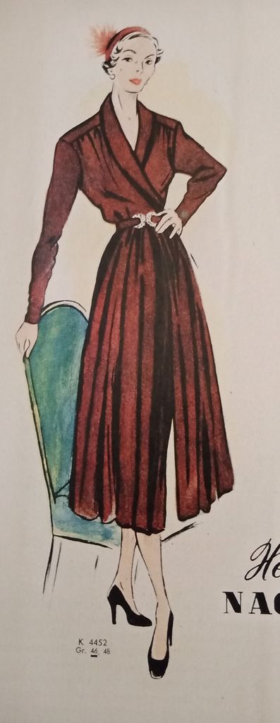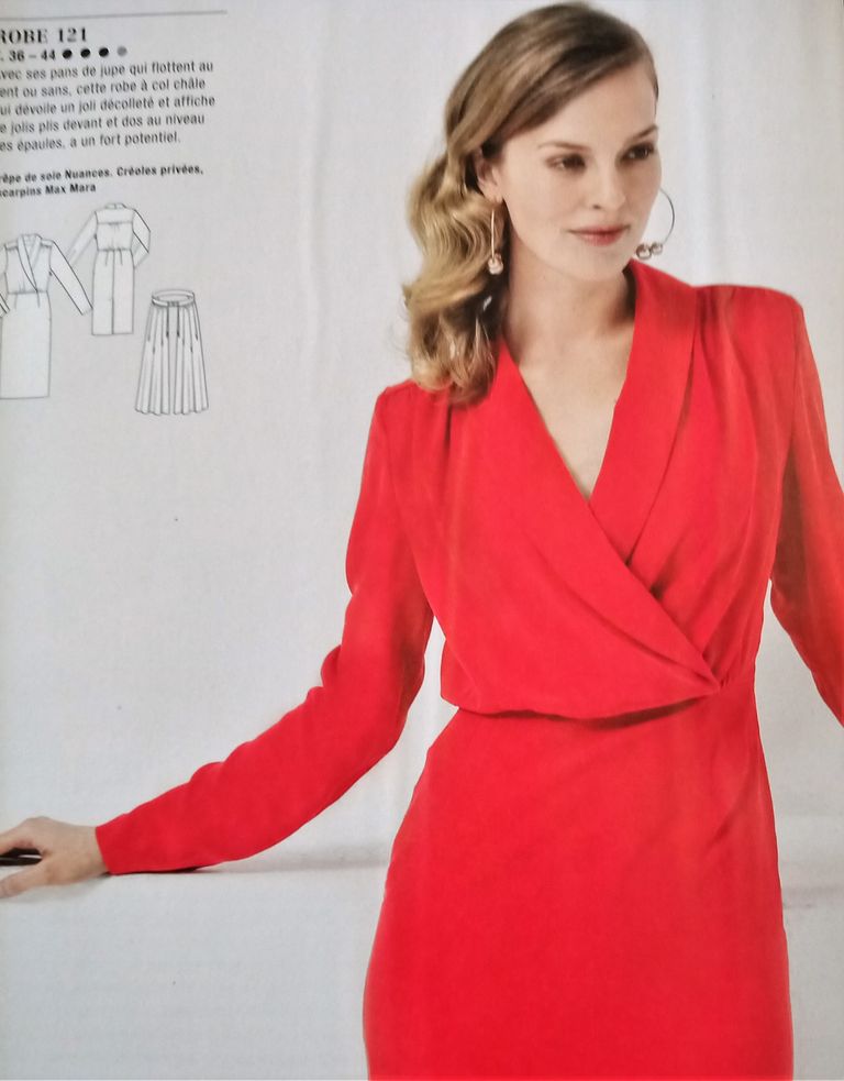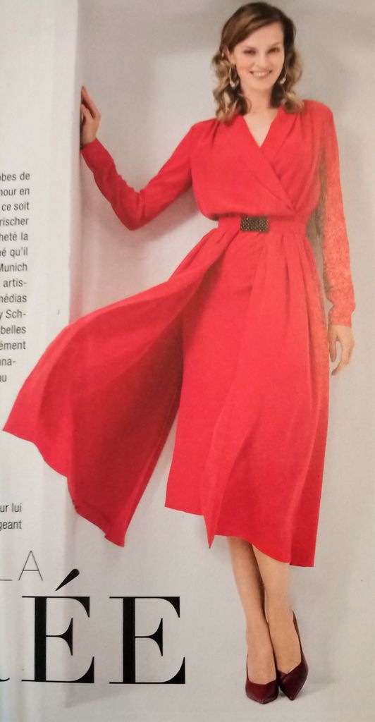 Il manquait une robe dans mon top on est d’accord! La voici encore une réédition d’un modèle des années 50. Robe de jour ou du soir selon l’utilisation de la sur-jupe avec ses deux pans. La robe possède un col châle qui se termine croisé à la couture de taille. Celle ci est garnie de plis ainsi qu’aux empiècements d’épaules. Les manches sont longues, la jupe est droite. La robe va de la taille 36 au 44.