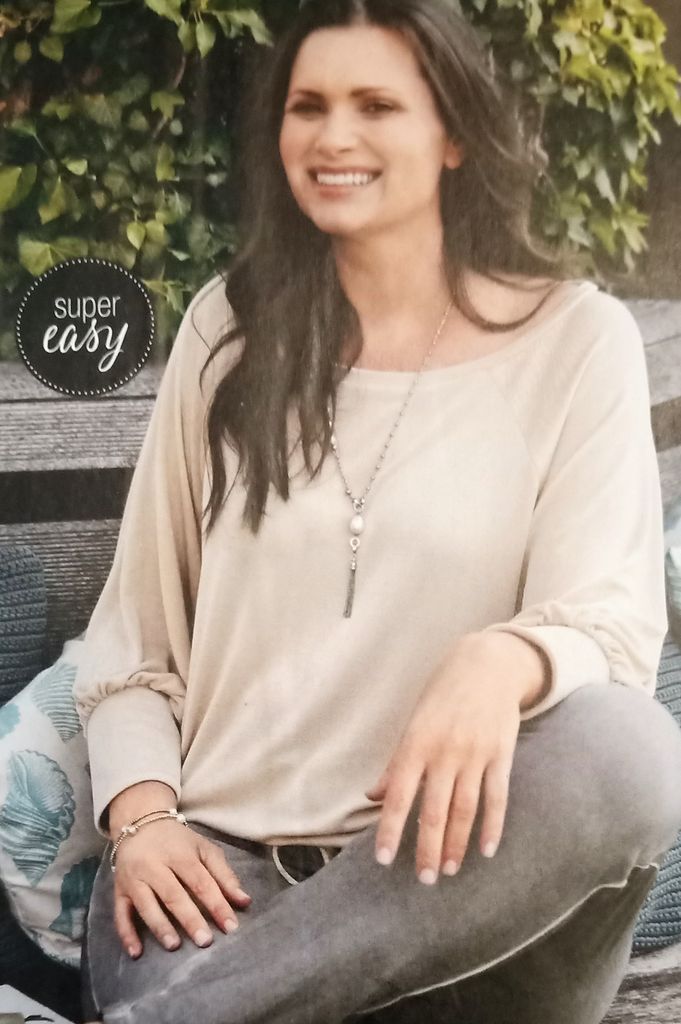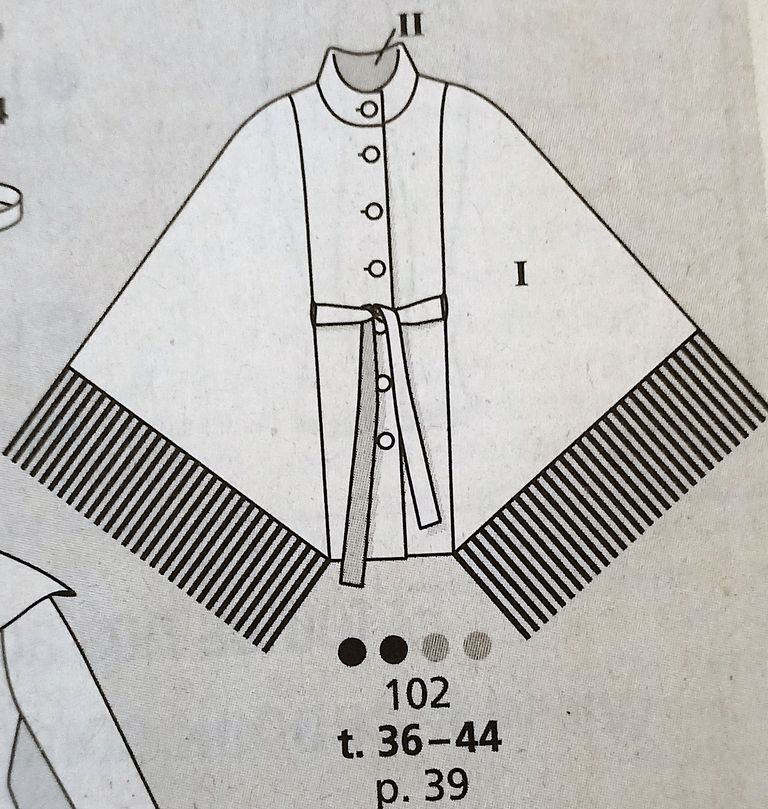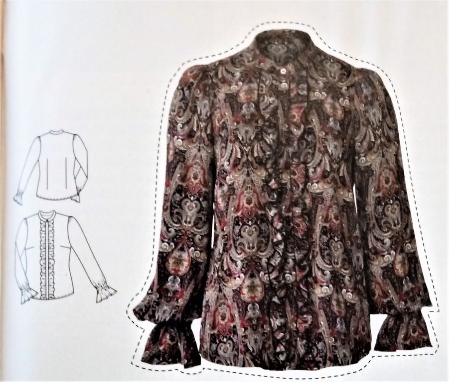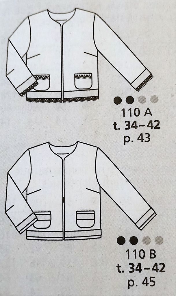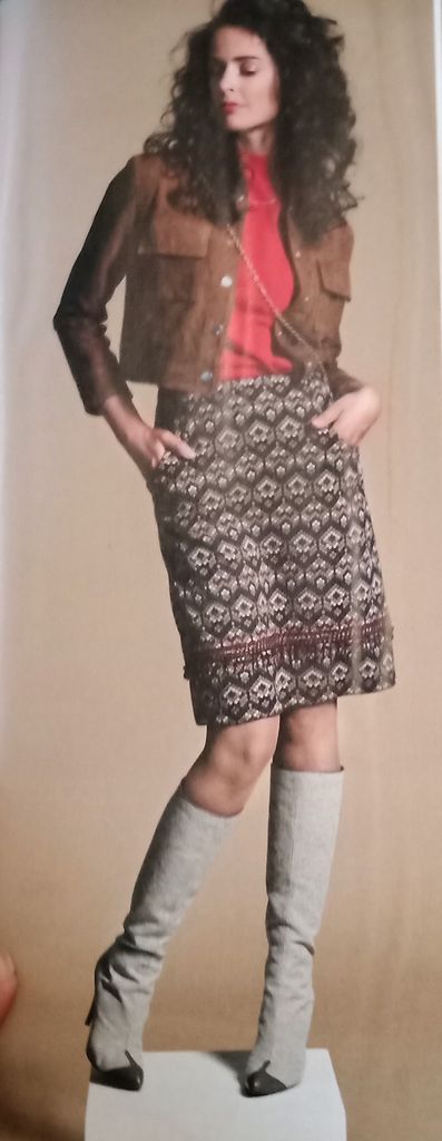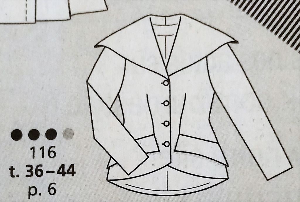 Cette veste est une tuerie! Déjà rien que pour la correspondance des motifs! Elle possède un grand col rabattu. La veste est ajustée à l’aide de pinces dos, et devant avec une incrustation de poche à rabat incurvés. Les ourlets sont arrondis sur le devant, de même que sur le dos tout en étant plus long. Je trouve génial d’avoir le dessin du modèle originel! Elle va de la taille 36 au 44.