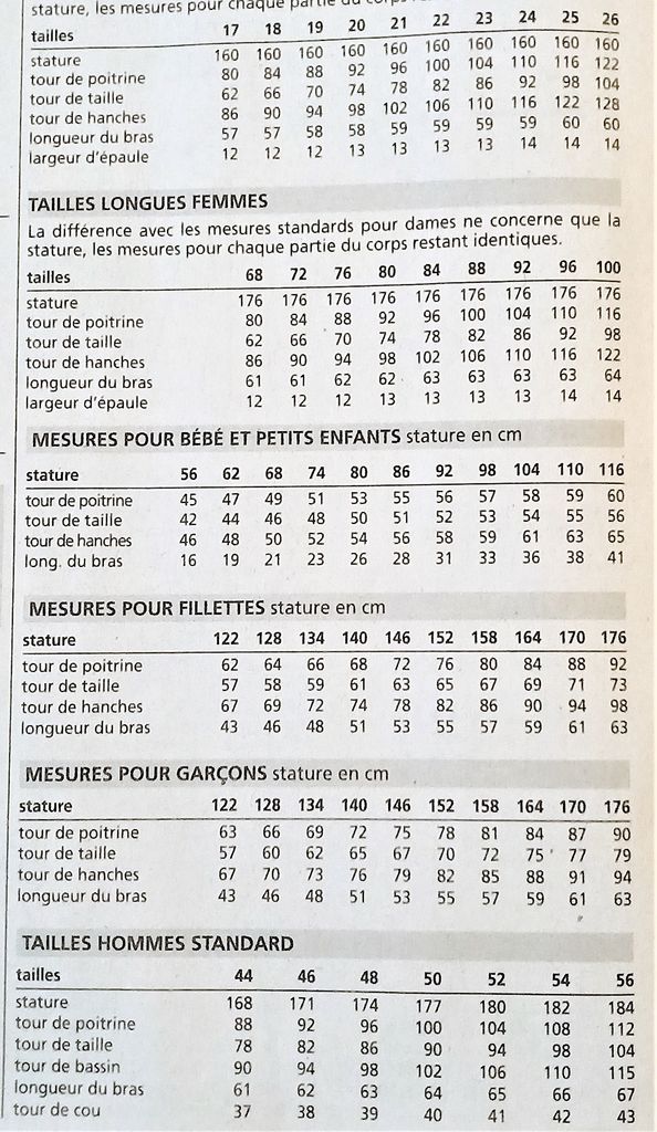 Le tableau des tailles